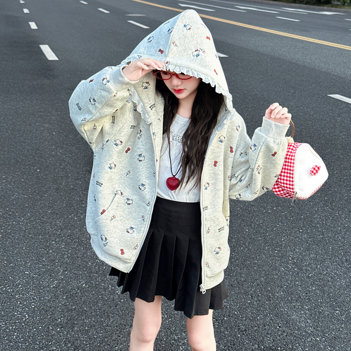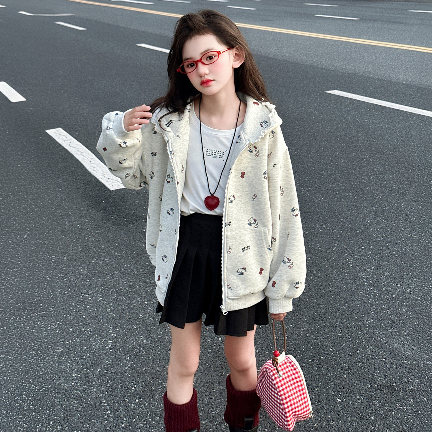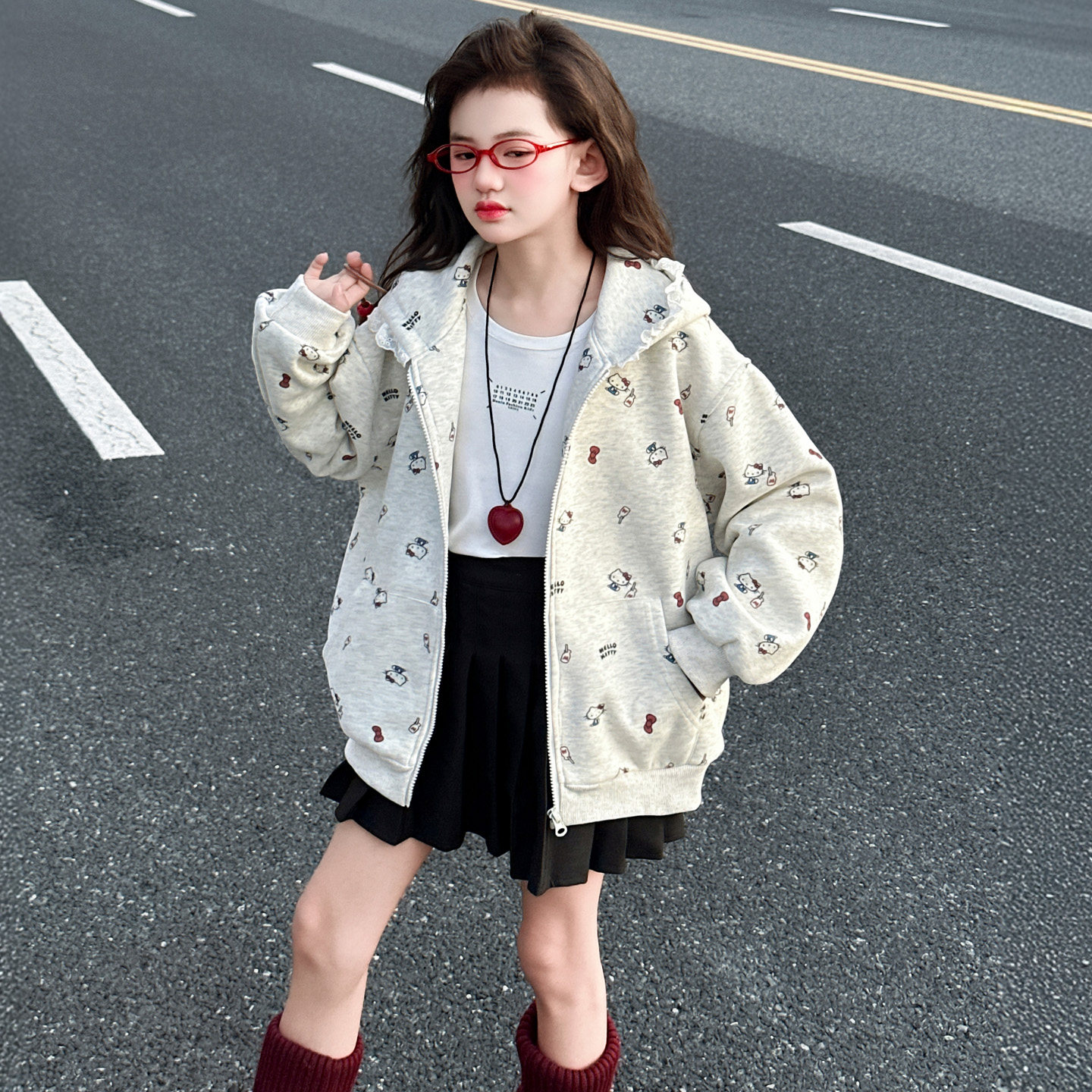 女童连帽外套春秋款2025新款大童薄款洋气休闲百搭kt印花开衫卫衣