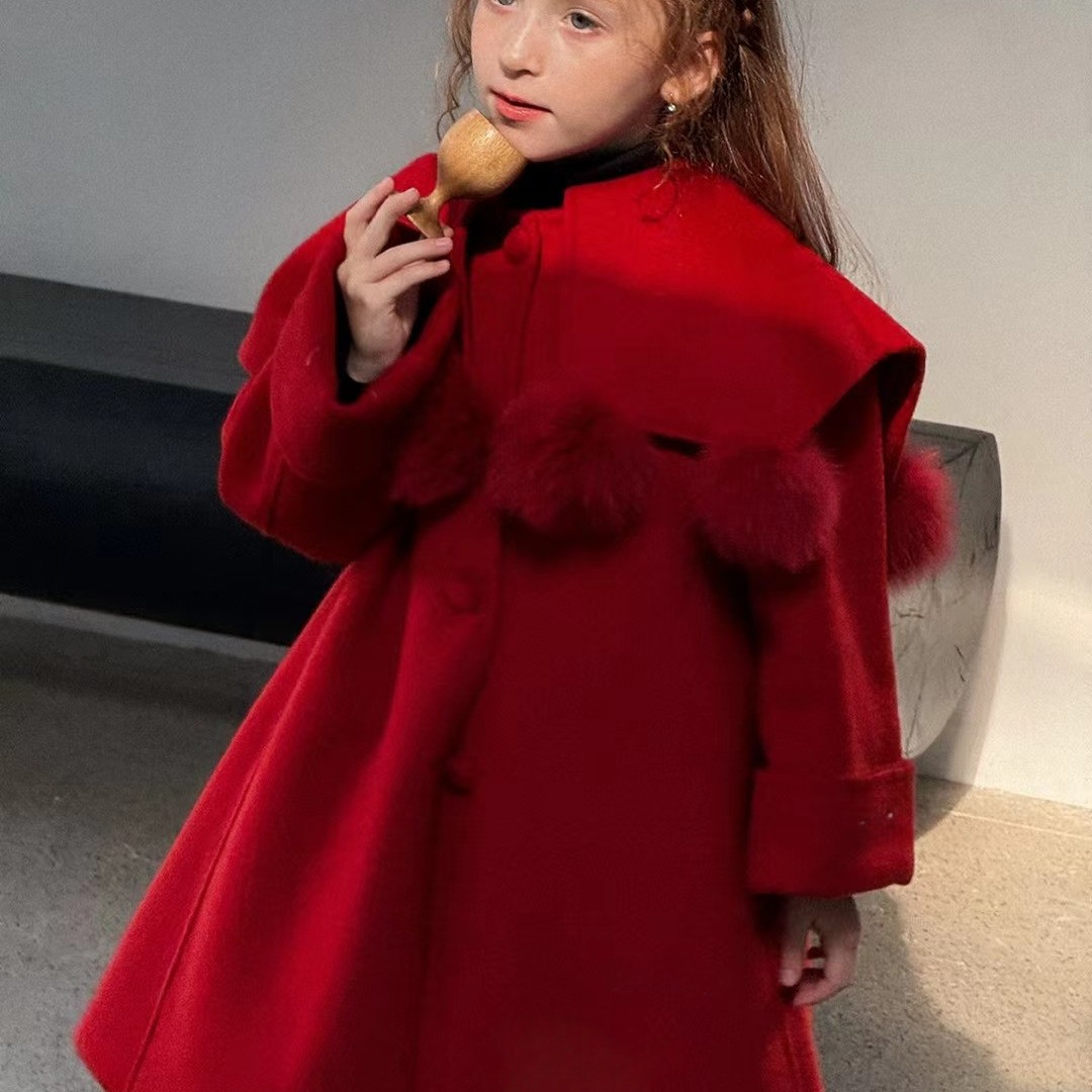 女童秋冬毛呢外套2025新款韩版中大童红色洋气拜年服女孩新年衣服