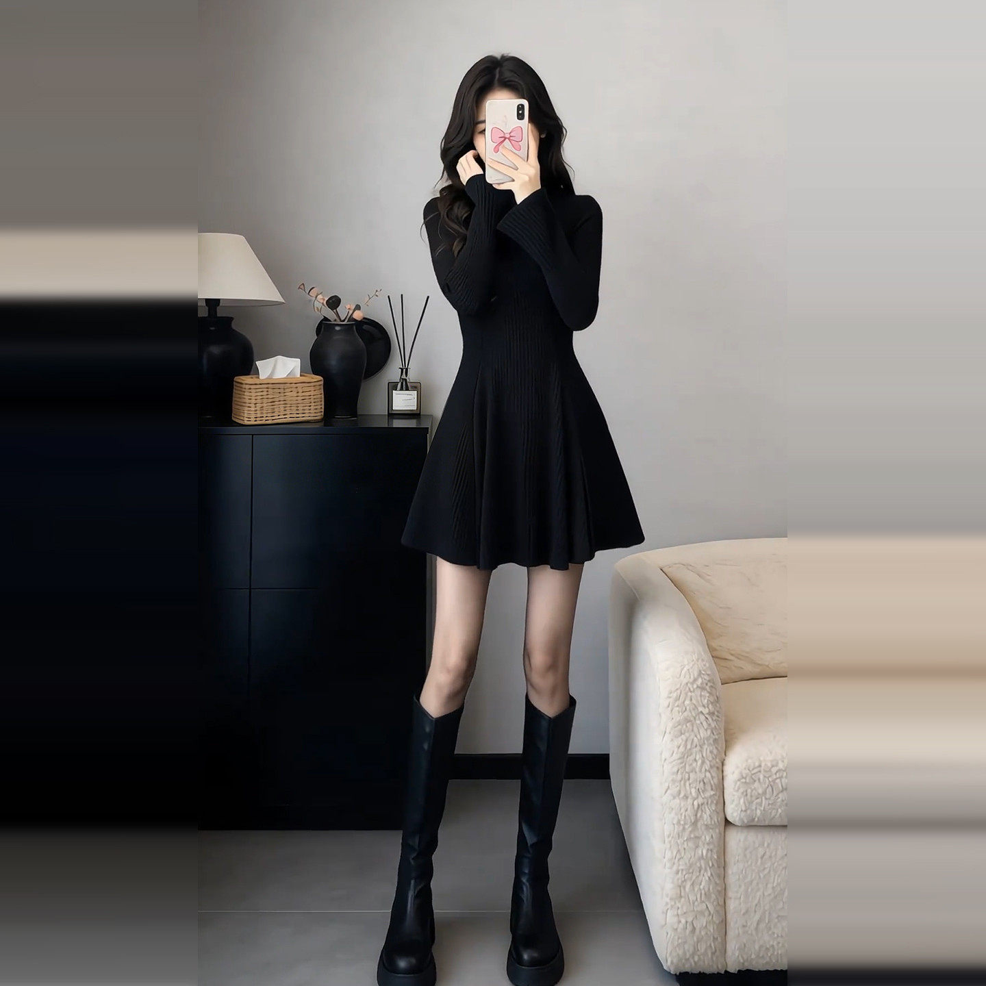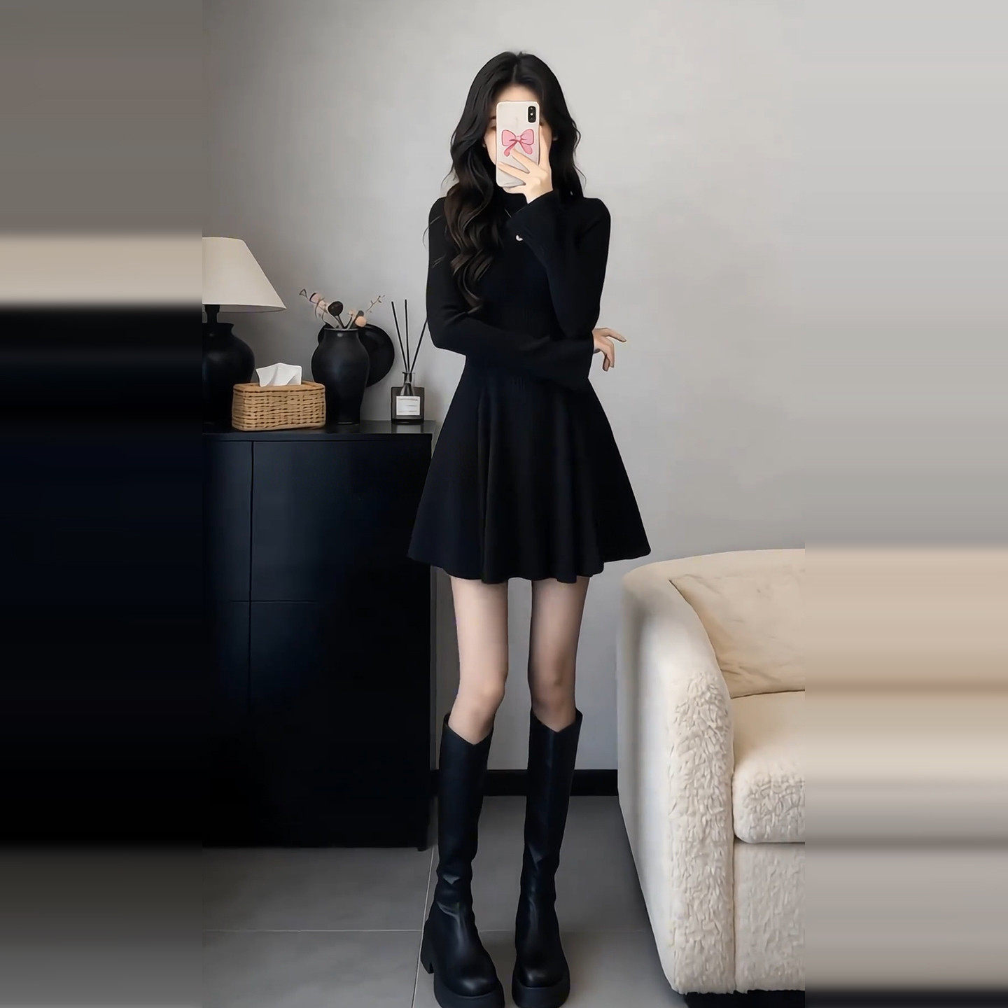 早春小个子法式黑色针织连衣裙子女春季穿搭2026年新款收腰小黑裙