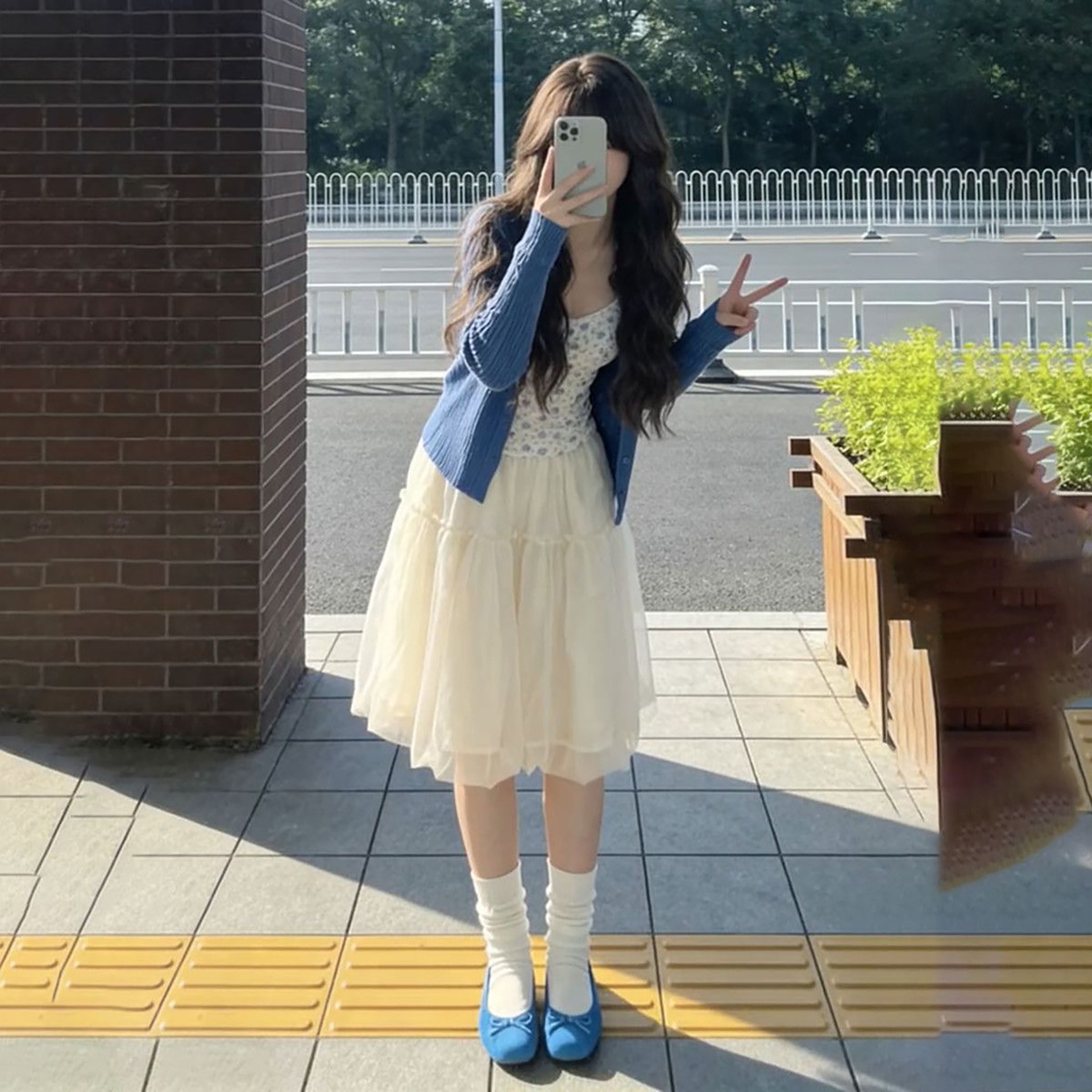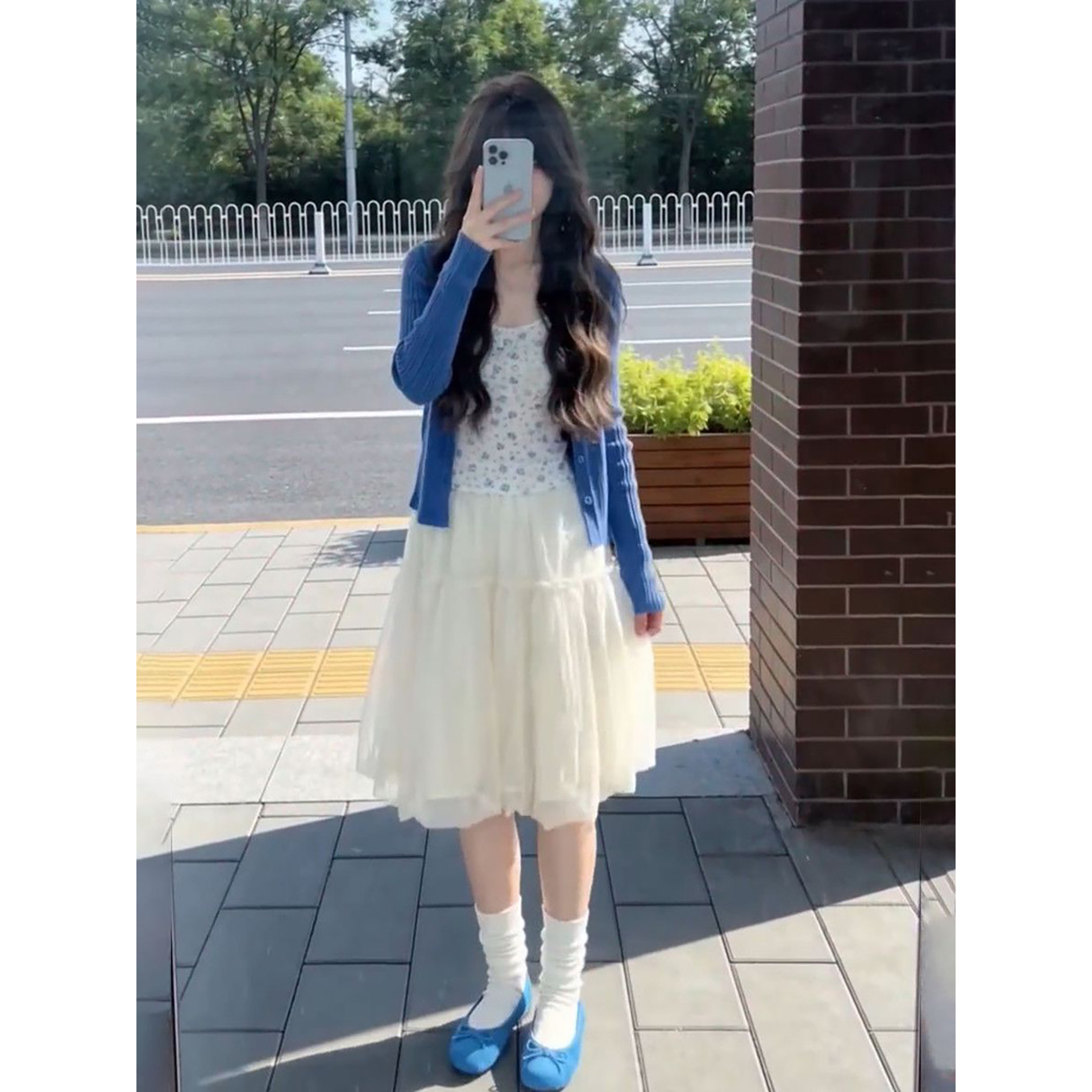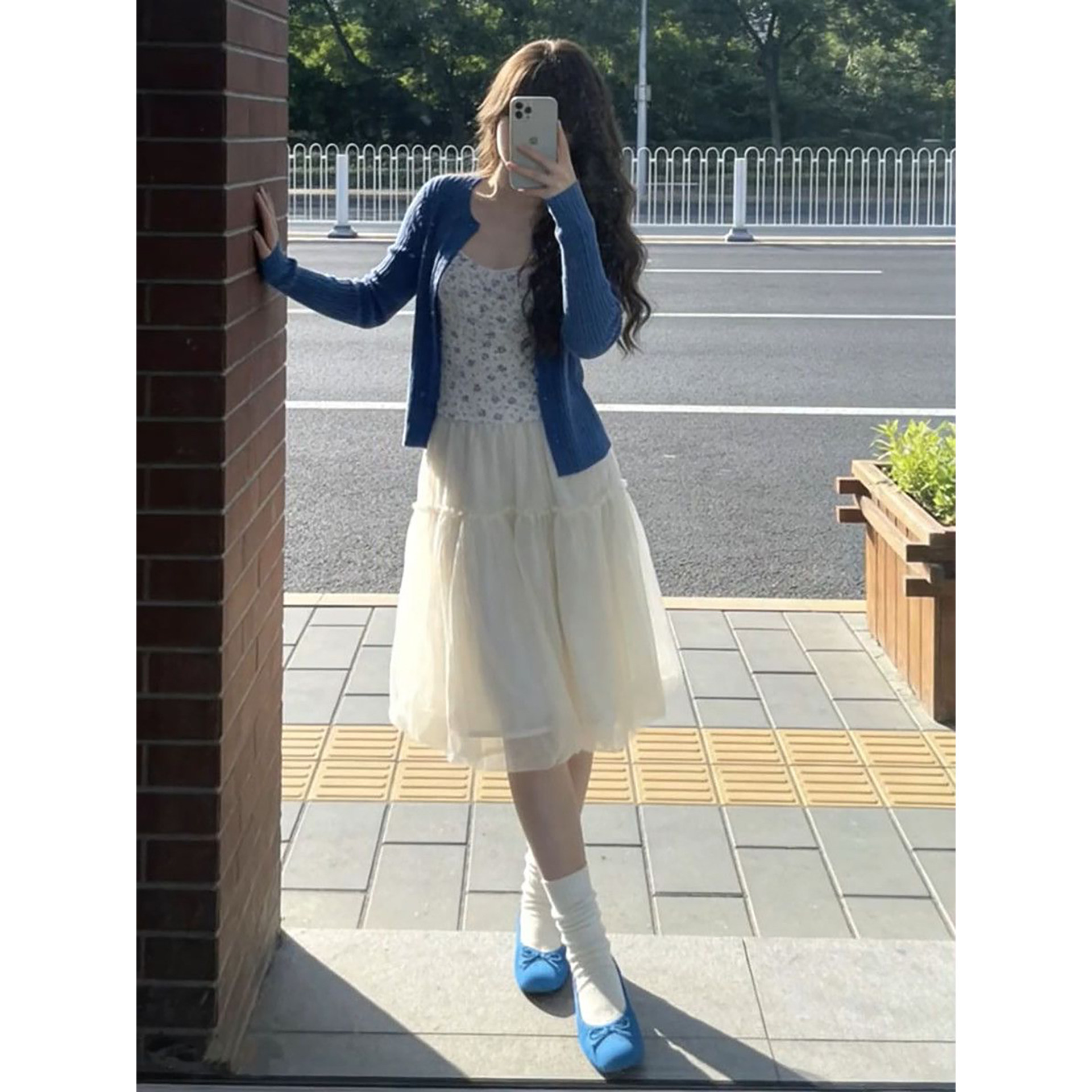 2026开春款温柔甜美风蓝色针织开衫+碎花吊带+蕾丝花苞裙三件套装