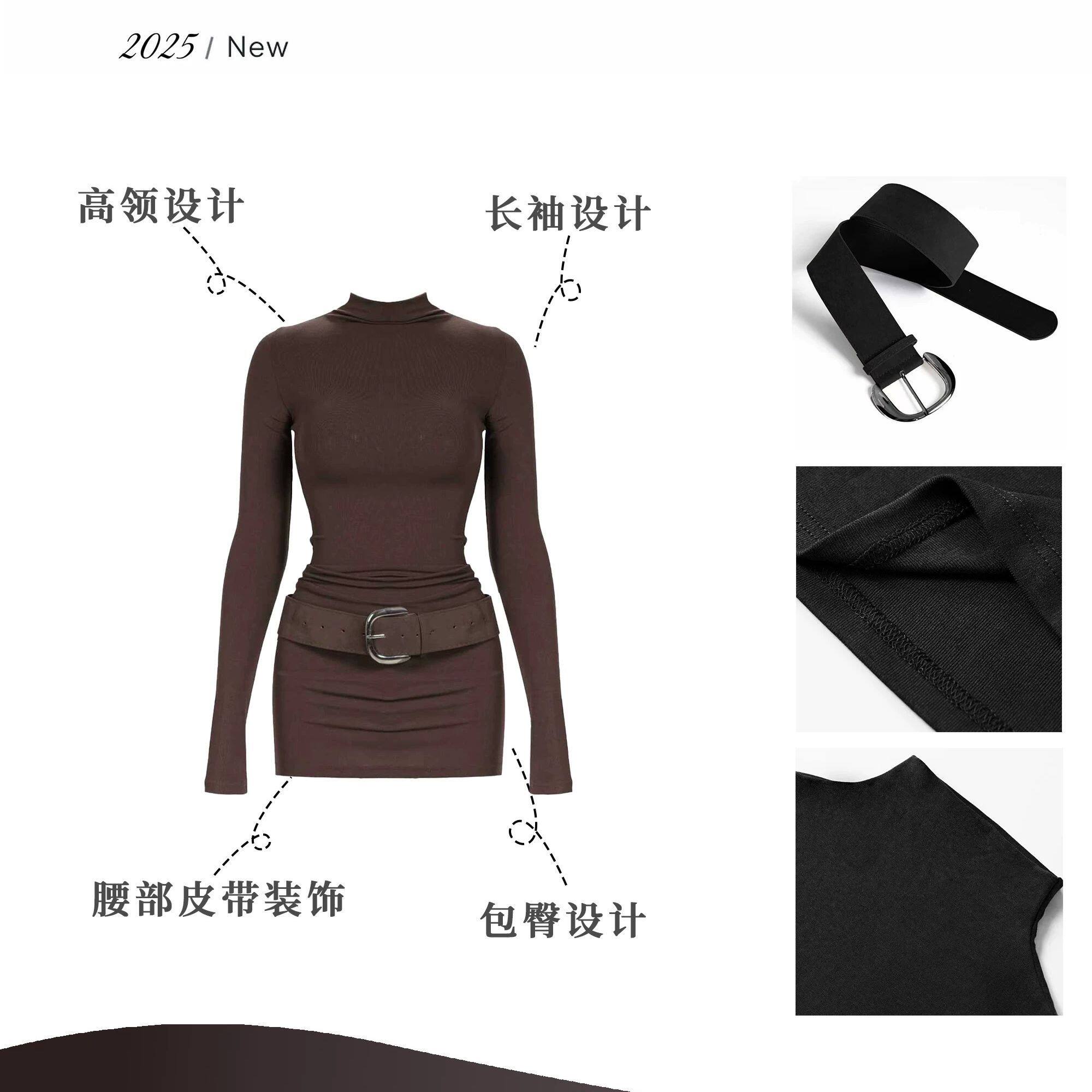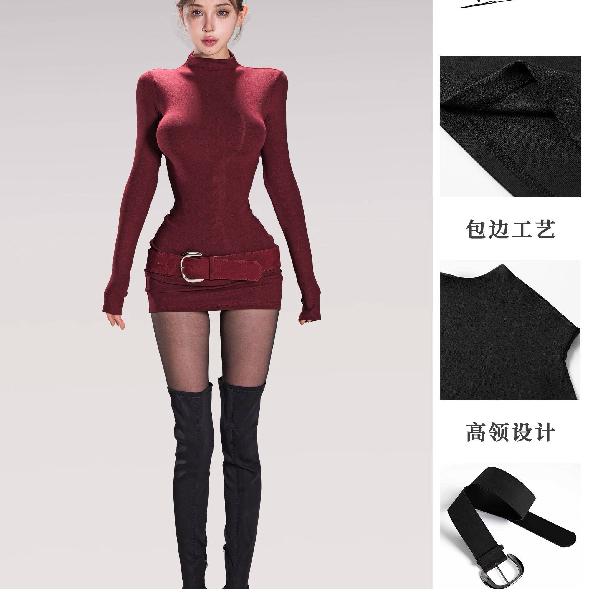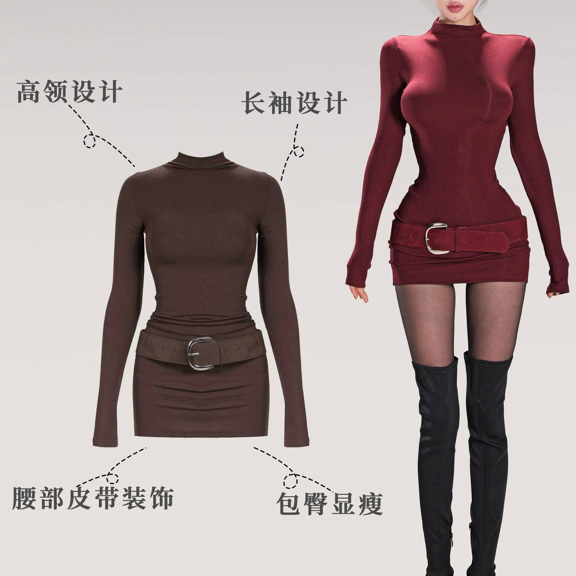 纯欲辣妹高领紧身收腰红色连衣裙女冬季内搭显瘦弹力百搭包臀短裙