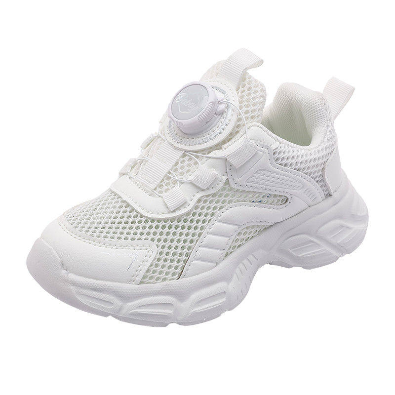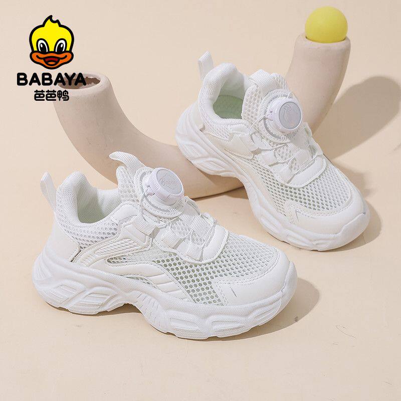 芭芭鸭儿童白色运动鞋旋钮2025新款夏男女童小白鞋透气单网跑步鞋