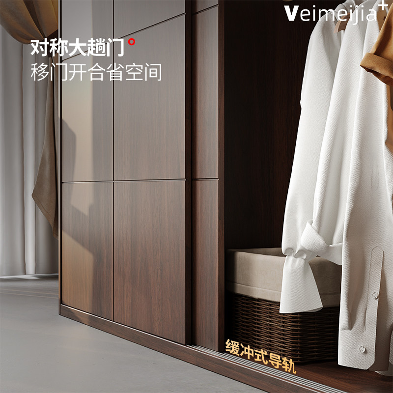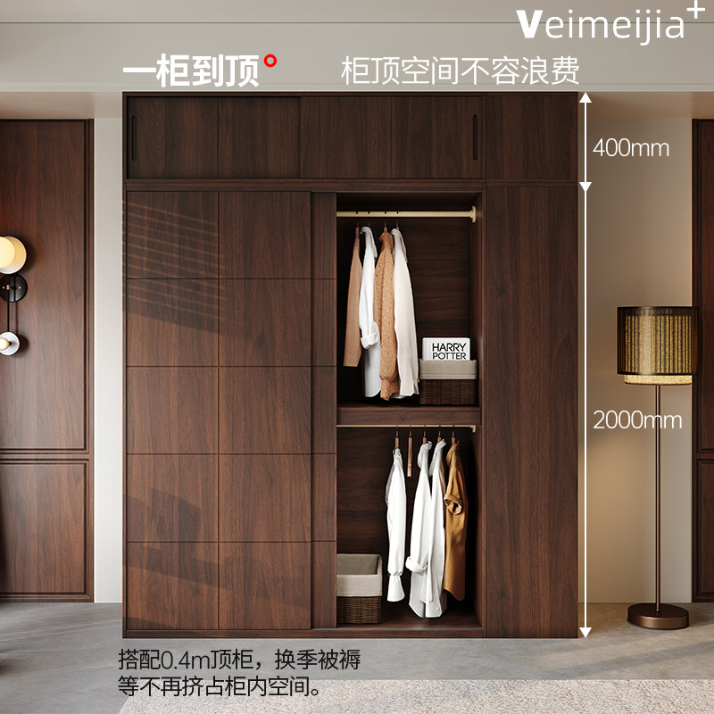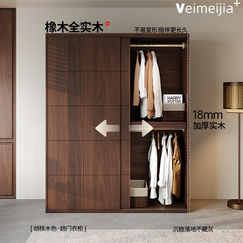 定制复古全实木胡桃木色橡木推拉门衣柜新款衣橱滑门储物柜子卧室