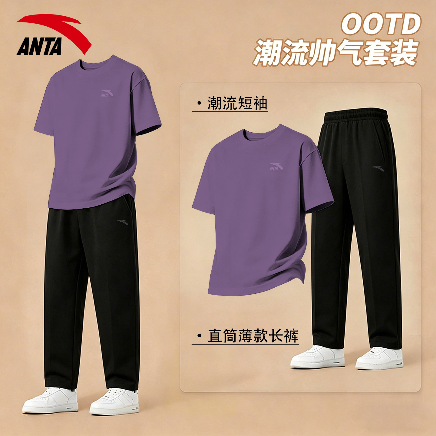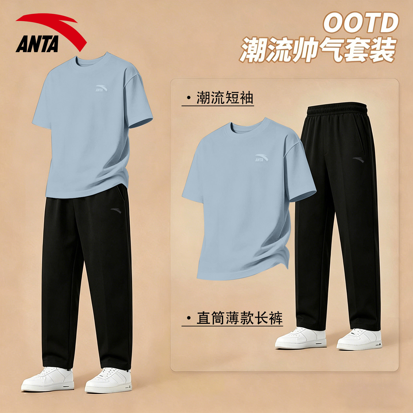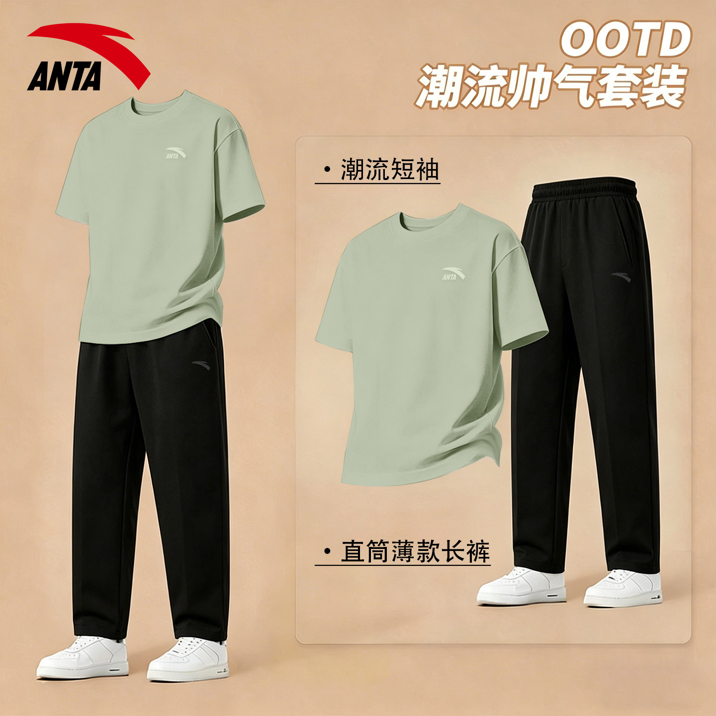 安踏运动套装男夏季青少年休闲宽松跑步时尚潮流薄款透气短袖长裤