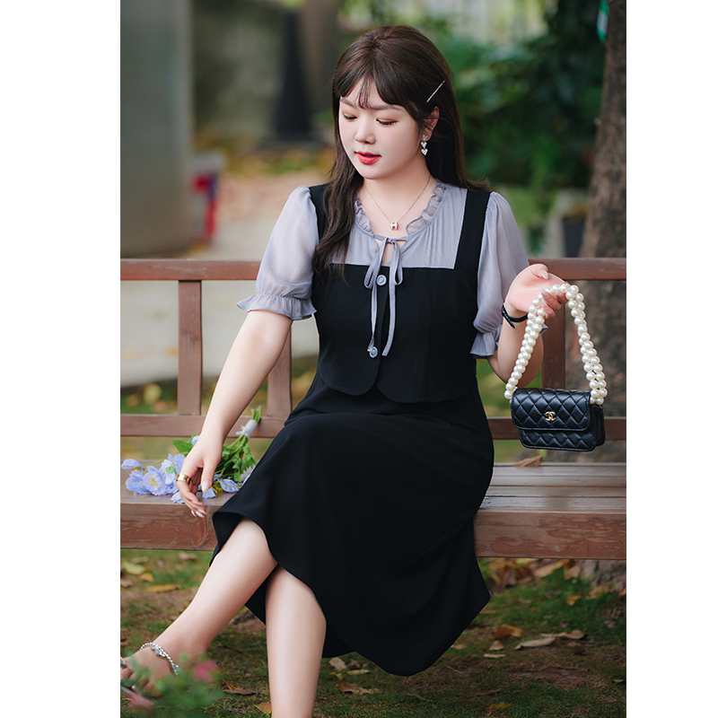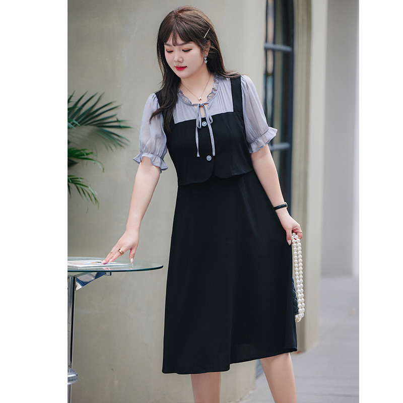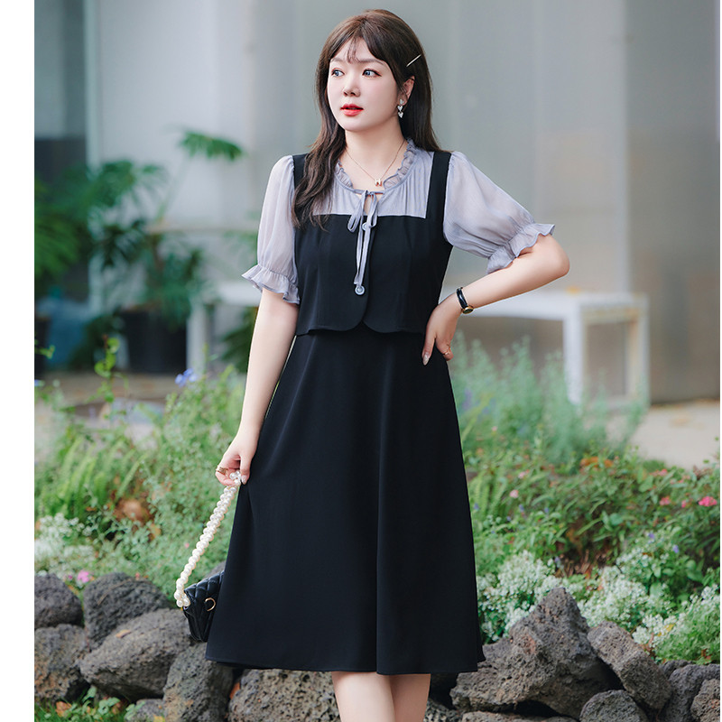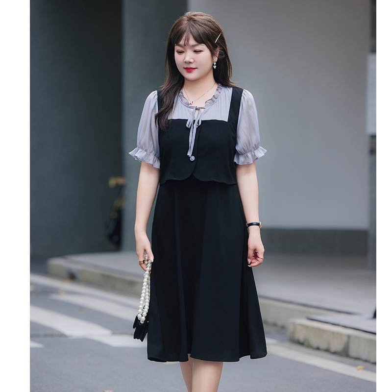 夏装法式气质V领收腰短袖A字长裙遮肚子显瘦假两件大码胖MM连衣裙