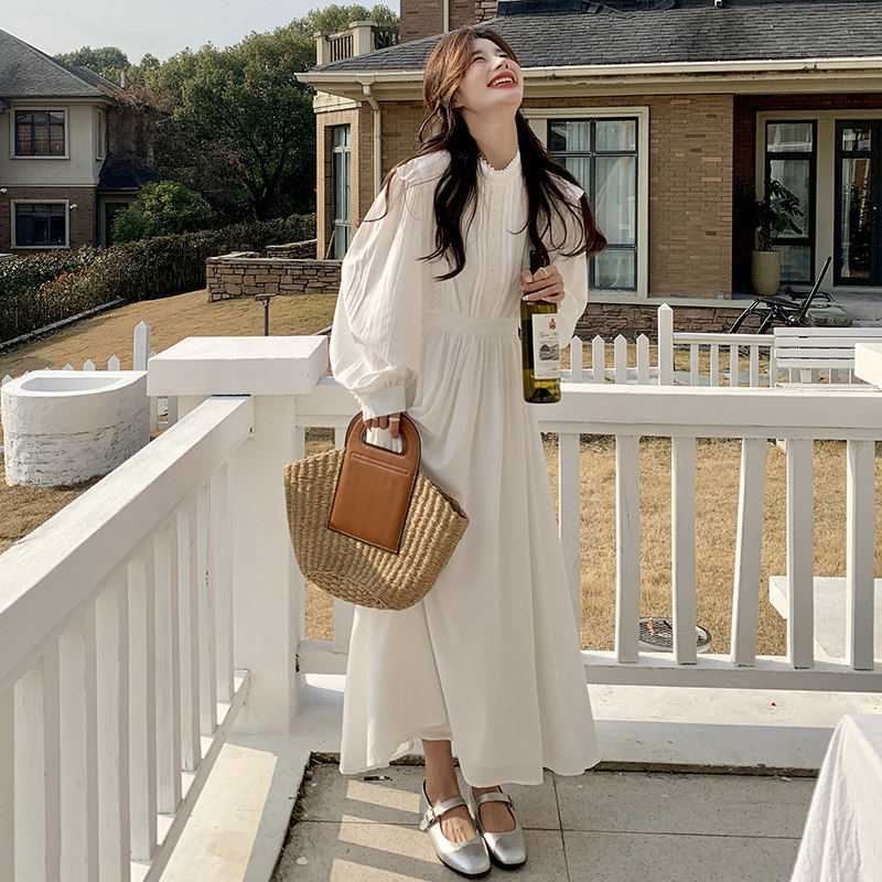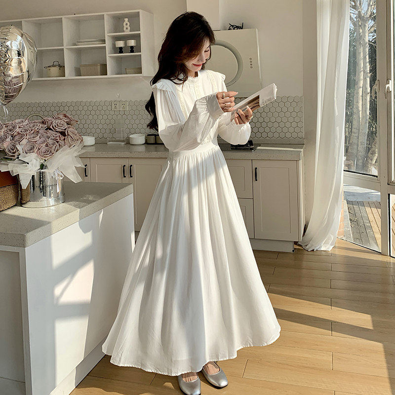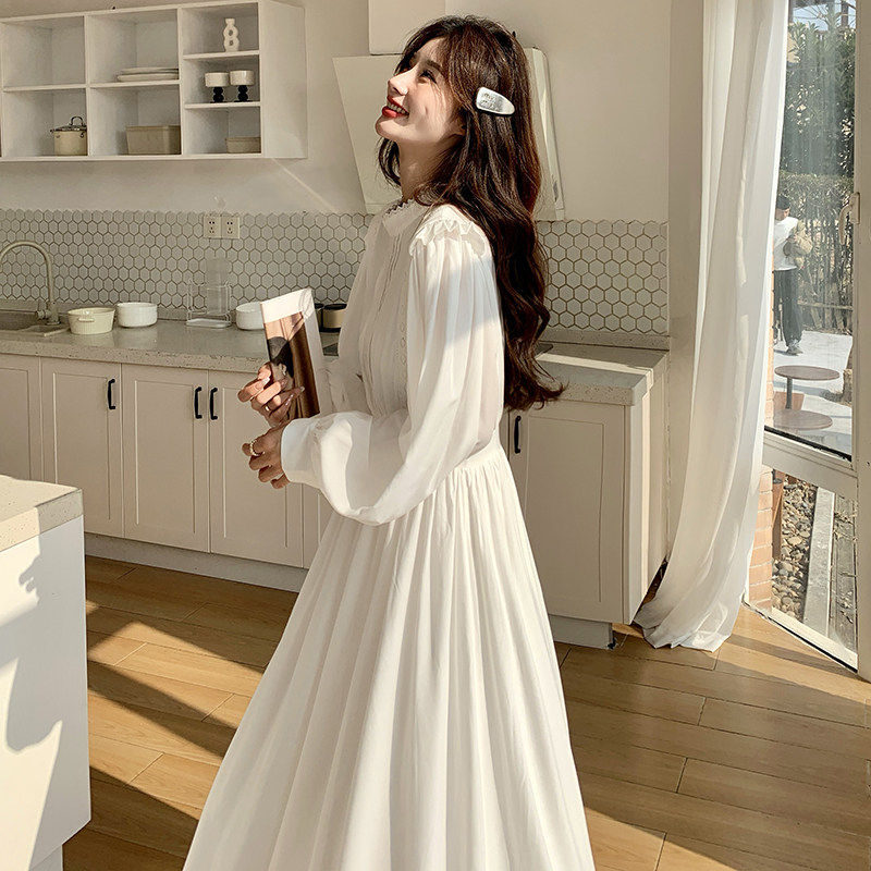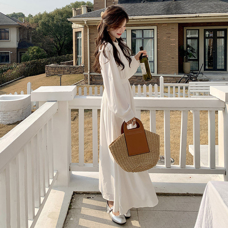 法式温柔风白色长袖连衣裙女收腰A字裙设计感通勤长裙