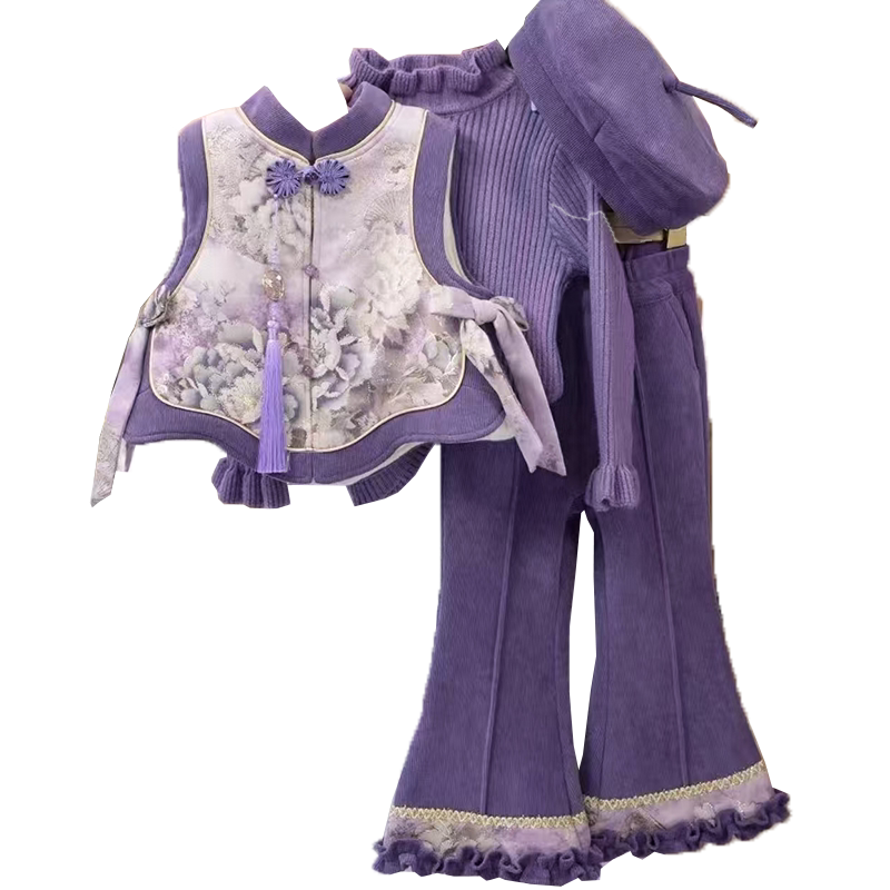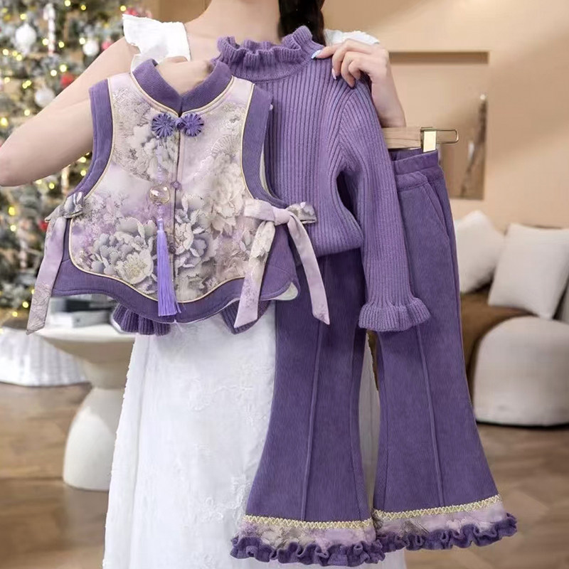 女童冬装套装2026新款儿童时髦国风刺绣中式三件套小女孩冬季衣服