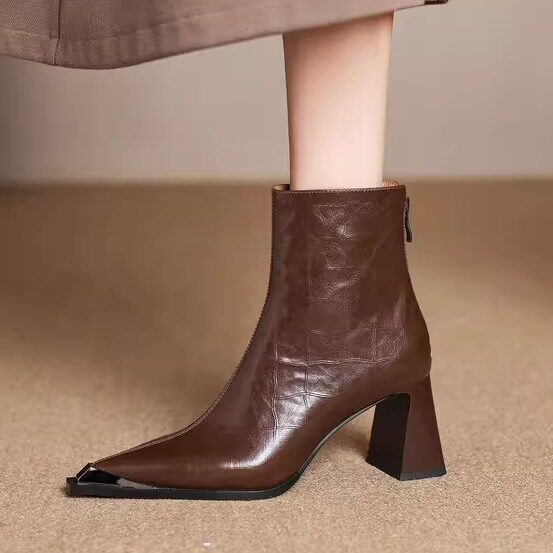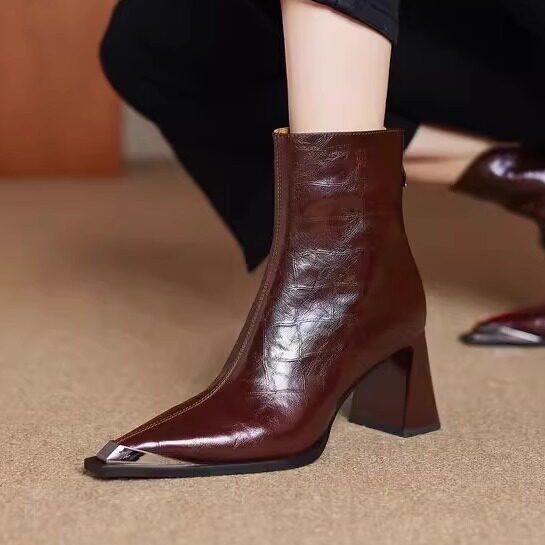 巨好看~洋气真皮金属头短靴女单靴尖头粗高跟个性气质百搭时尚冬