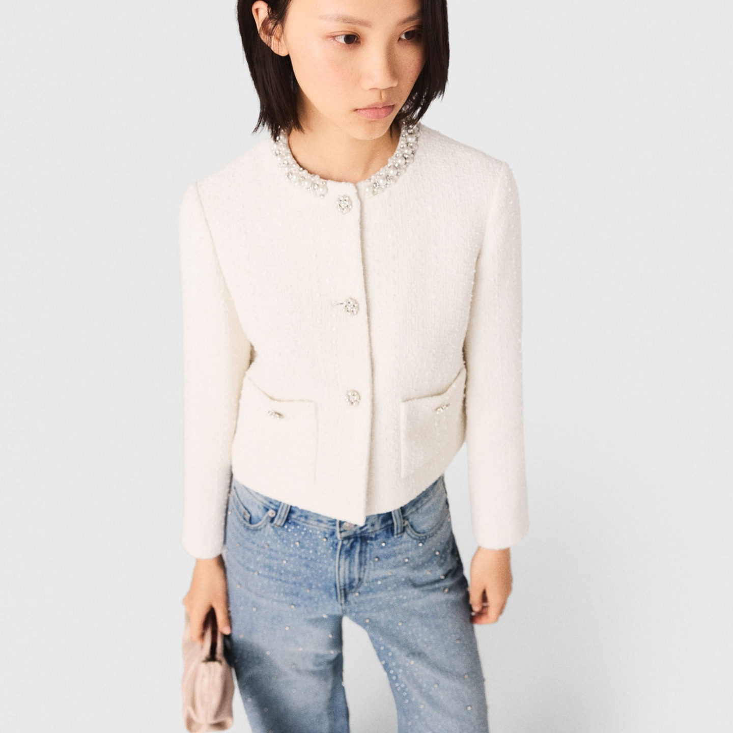311线报网描述:法式粗花呢连衣裙 时尚仿珠饰领设计