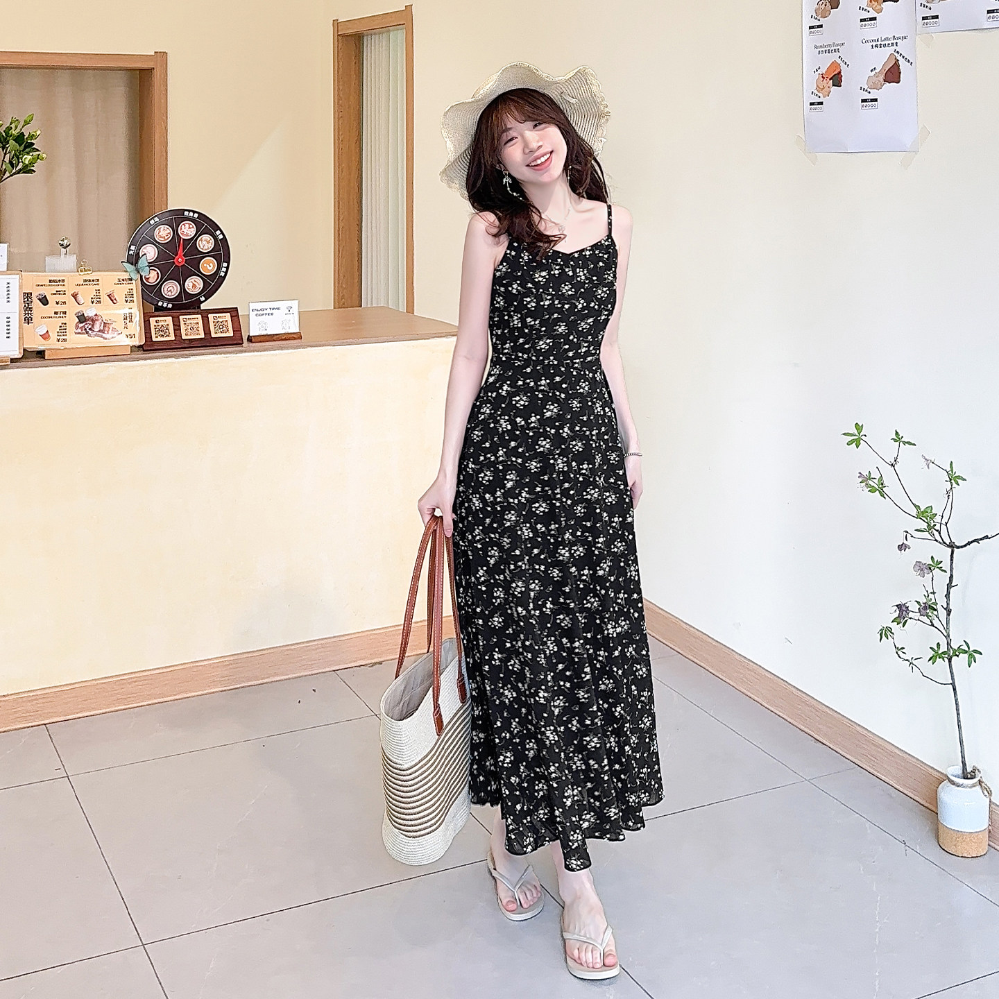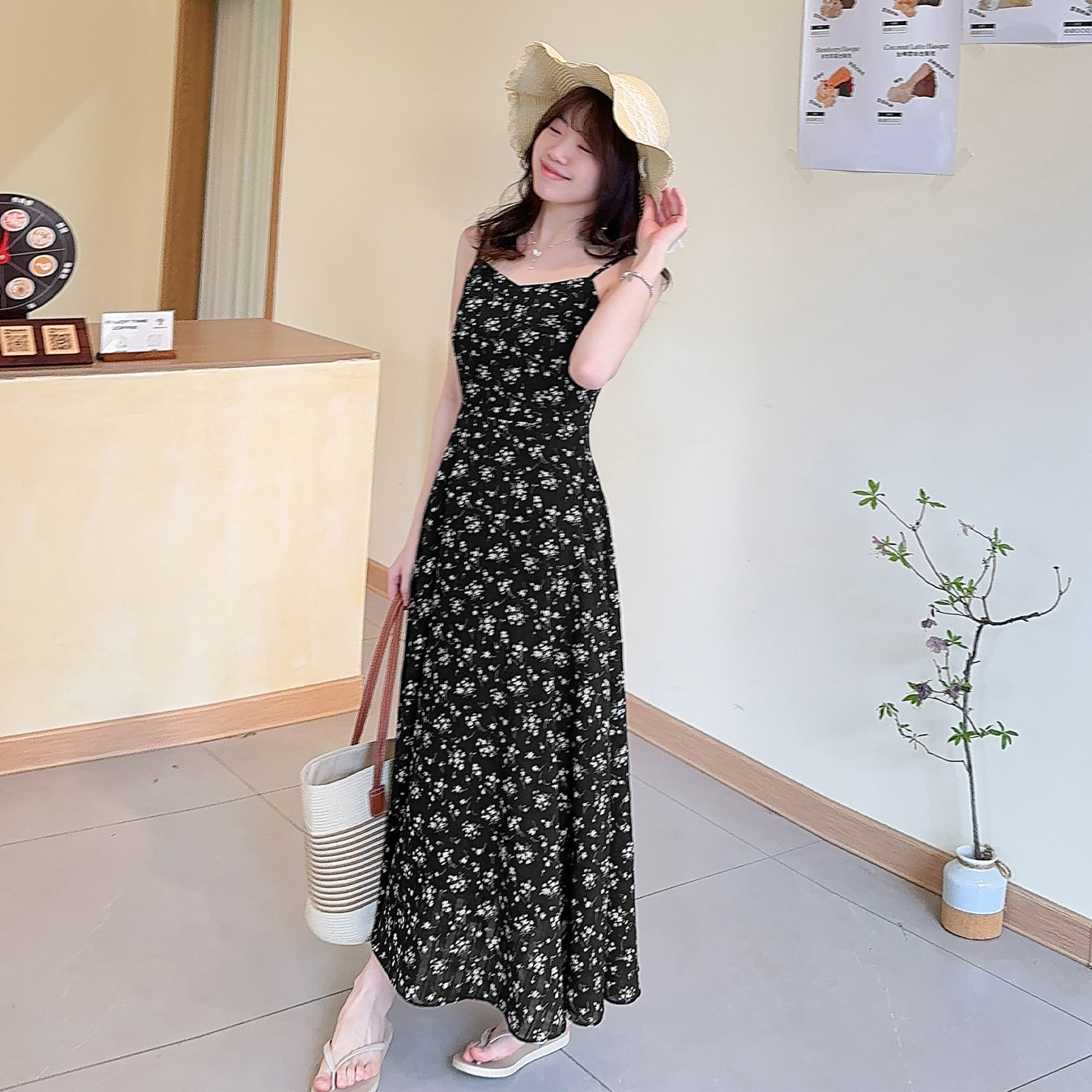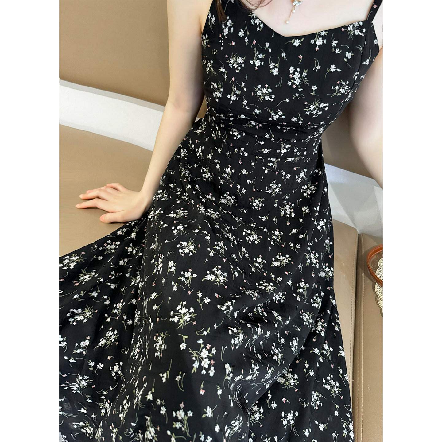 碎花吊带连衣裙2026新款女夏季黑色连衣裙显瘦长裙大码女装胖mm