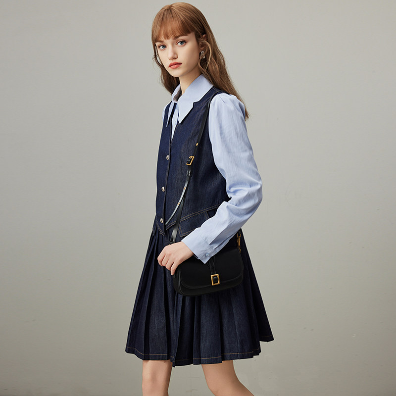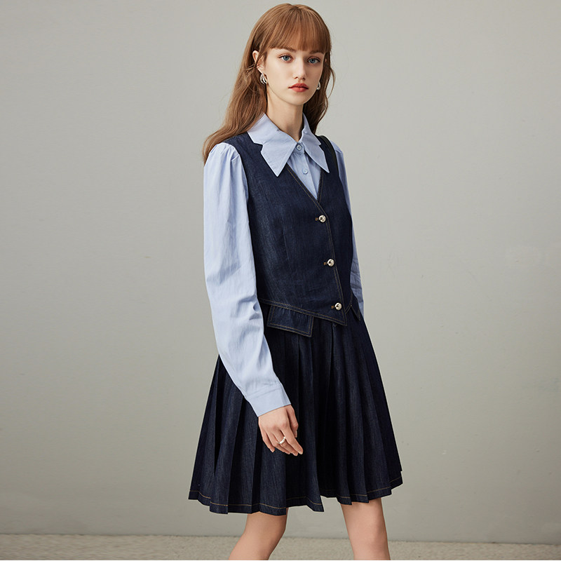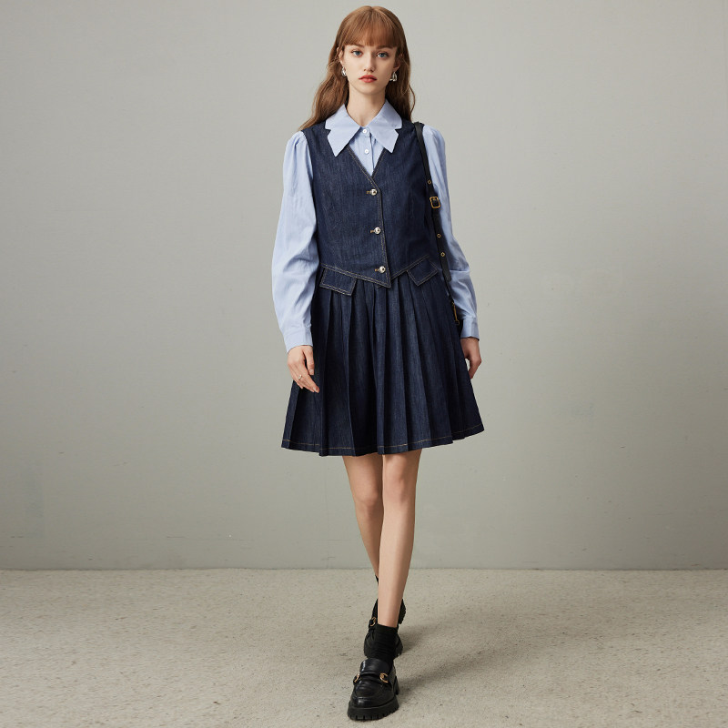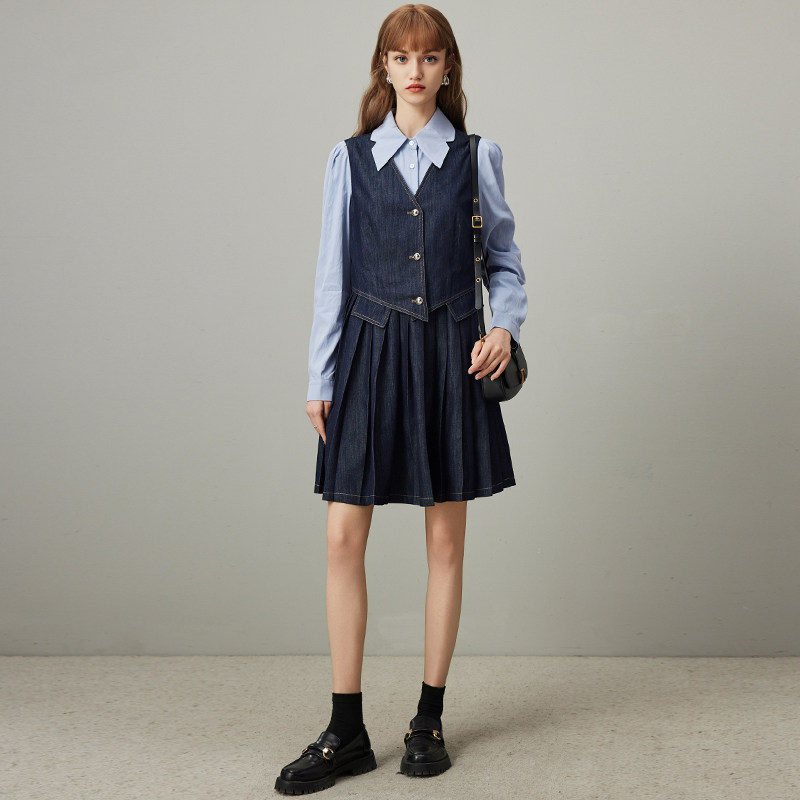 dfvc学院风假两件牛仔连衣裙女2026春季新款衬衫拼接小个子百褶裙