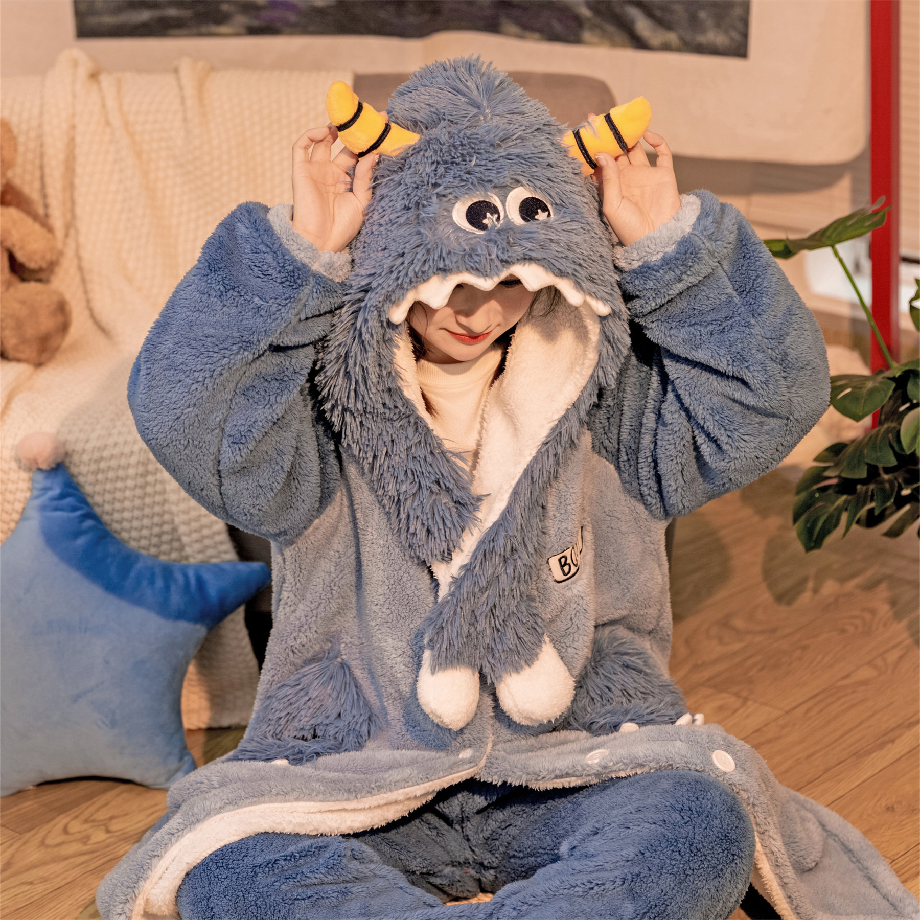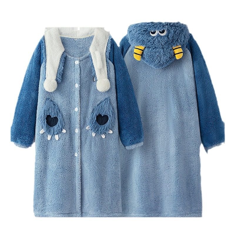 情侣睡衣冬季女珊瑚绒怪兽加厚睡袍女长款果壳可外穿家居服连帽