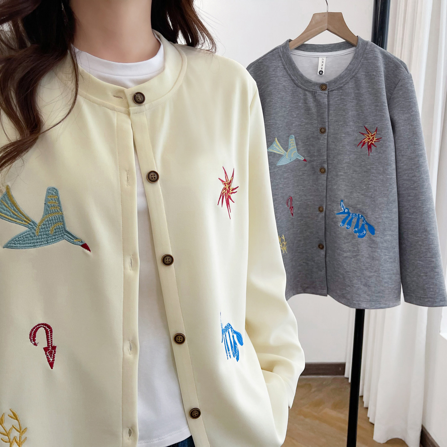 春款外套女大码2026新款胖mm200斤减龄刺绣宽松休闲显瘦圆领上衣