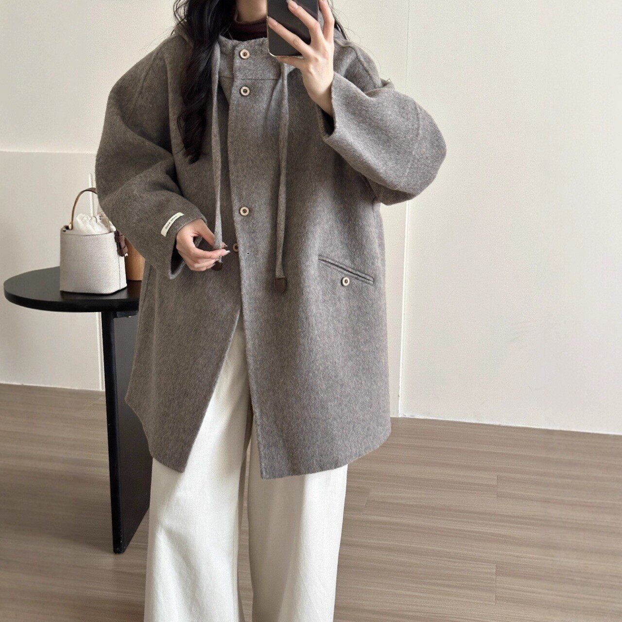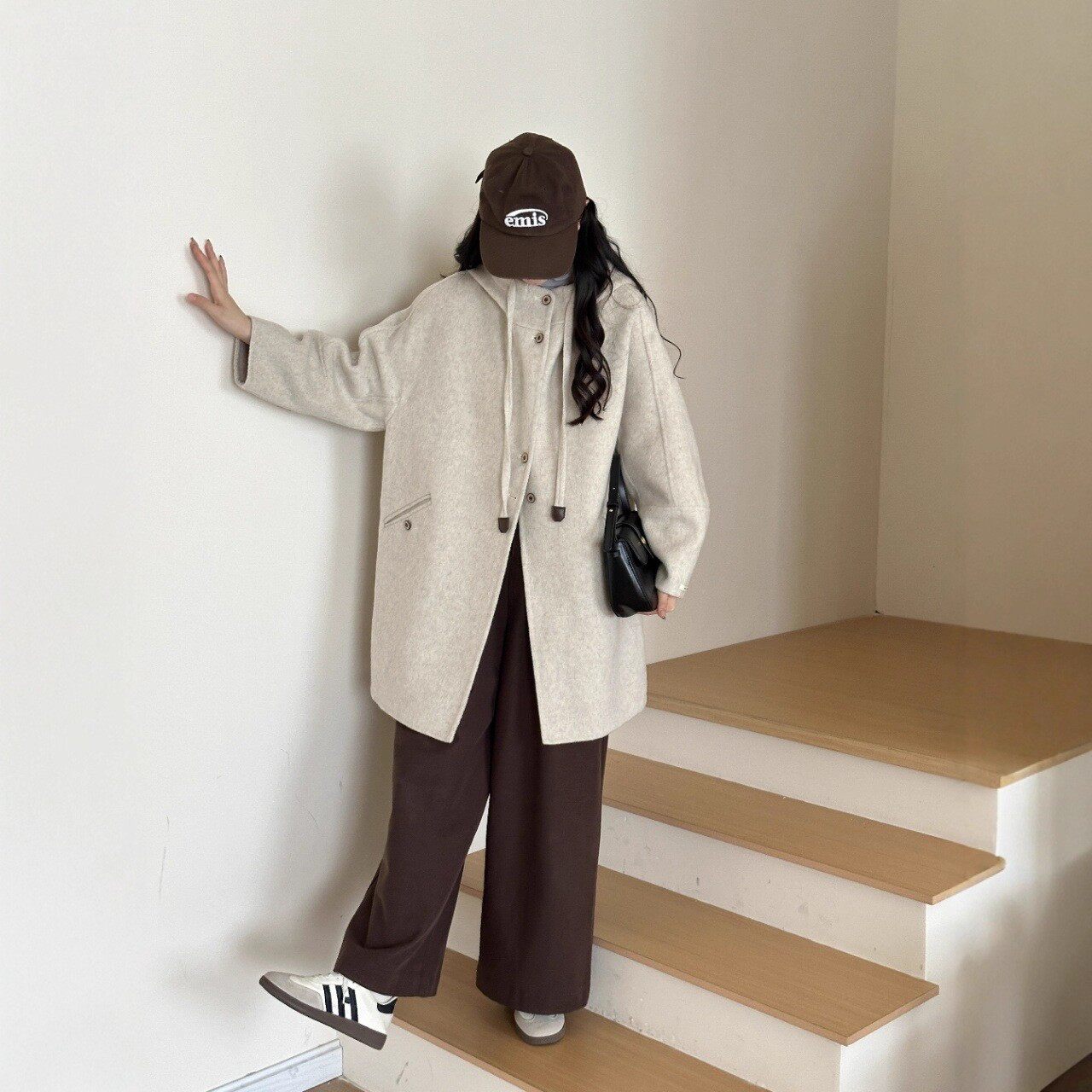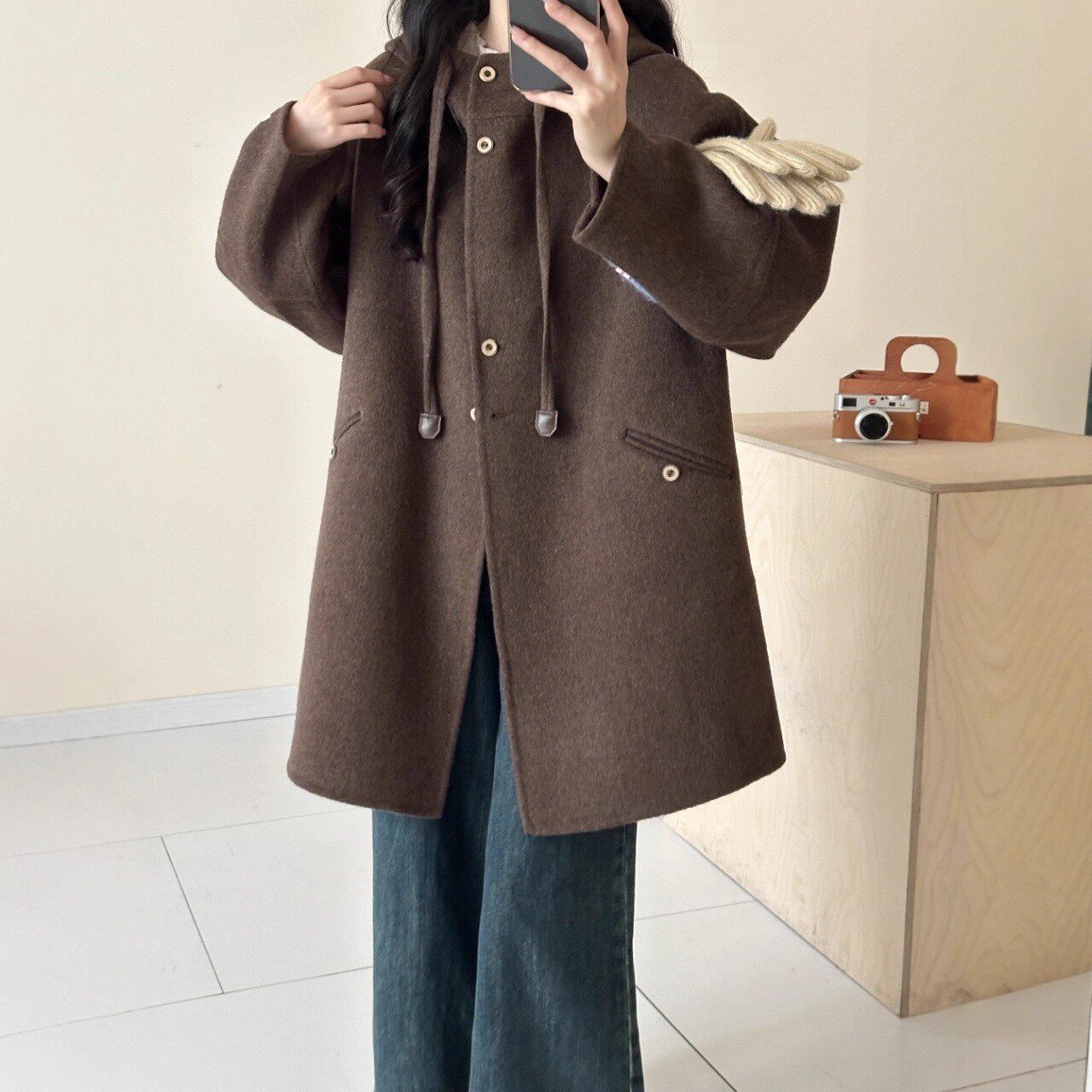 韩版宽松连帽双面羊毛大衣女中长款加厚保暖新款小个子毛呢外套