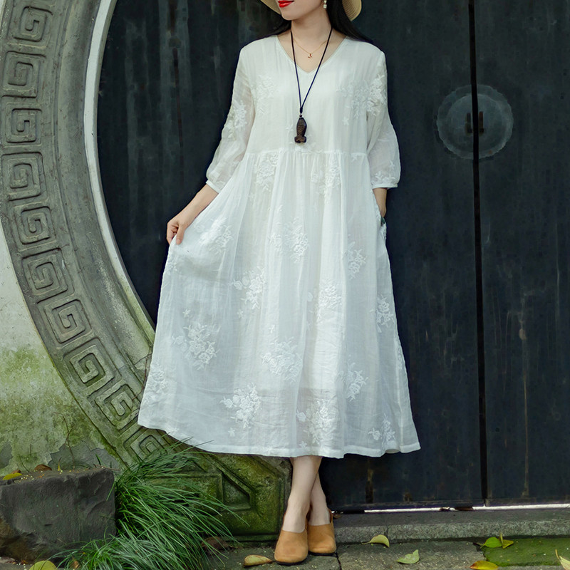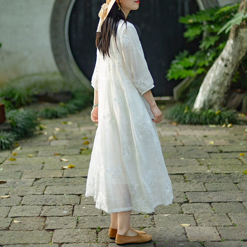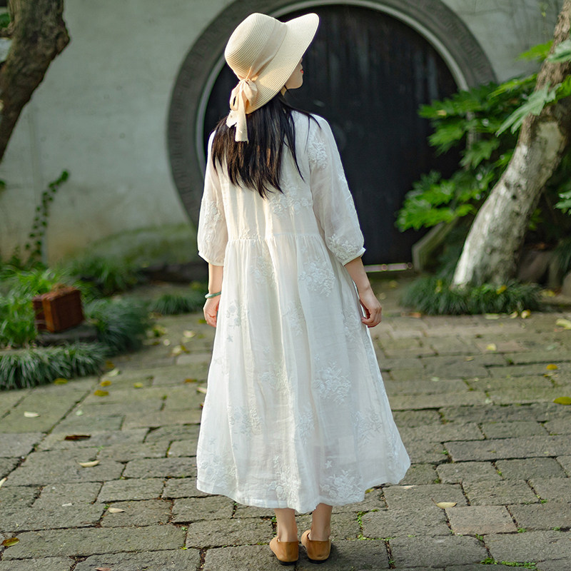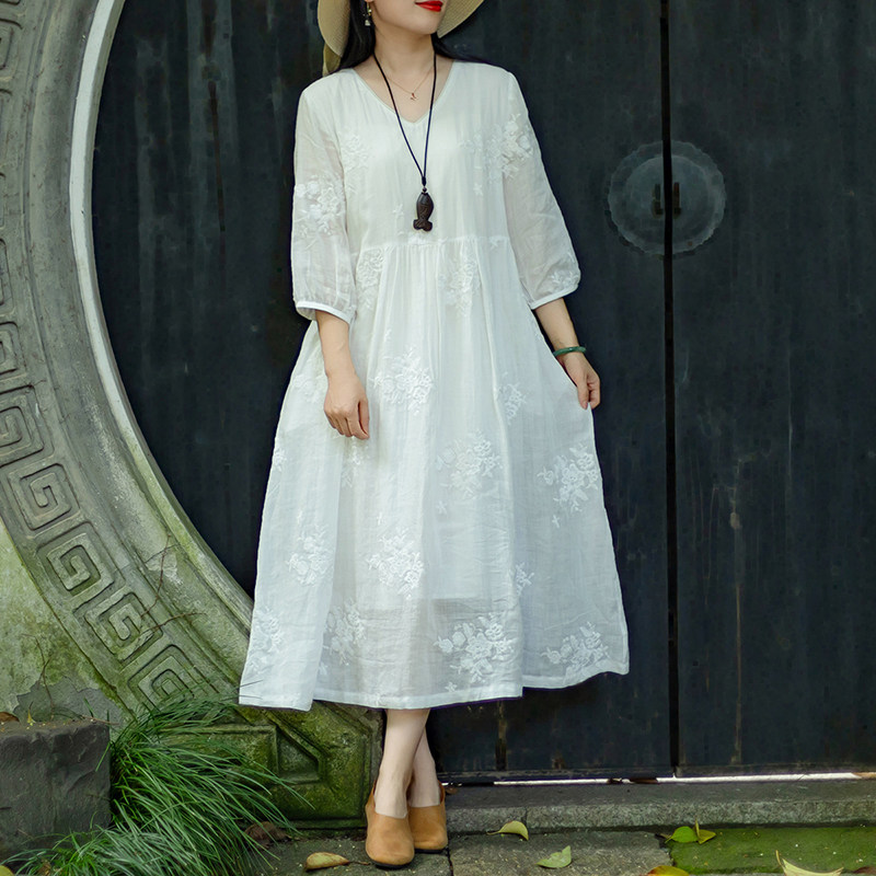 念江南小众设计感仙气白色重工刺绣苎麻连衣裙女飘逸V领大摆长裙