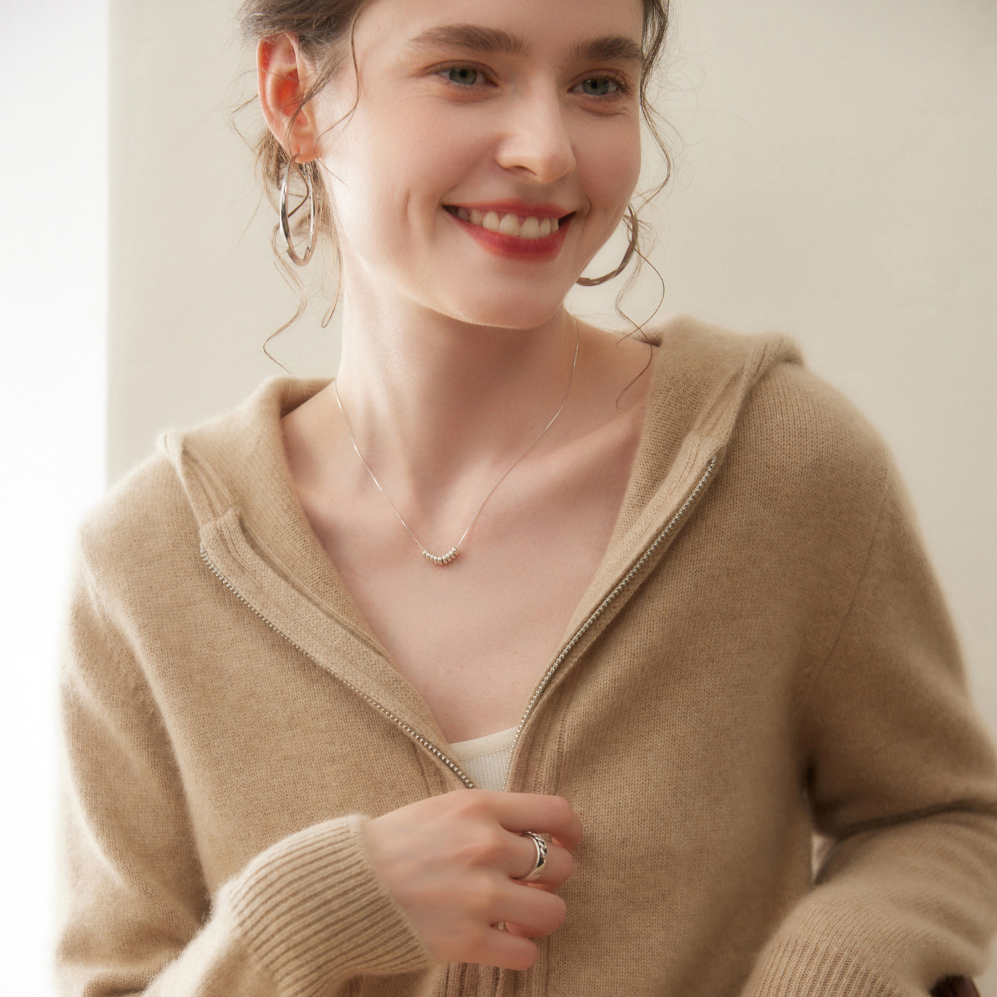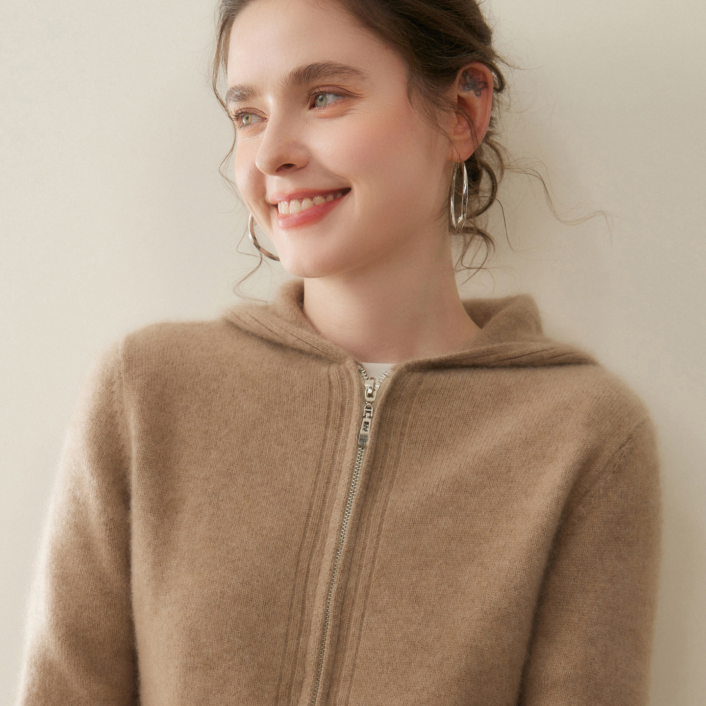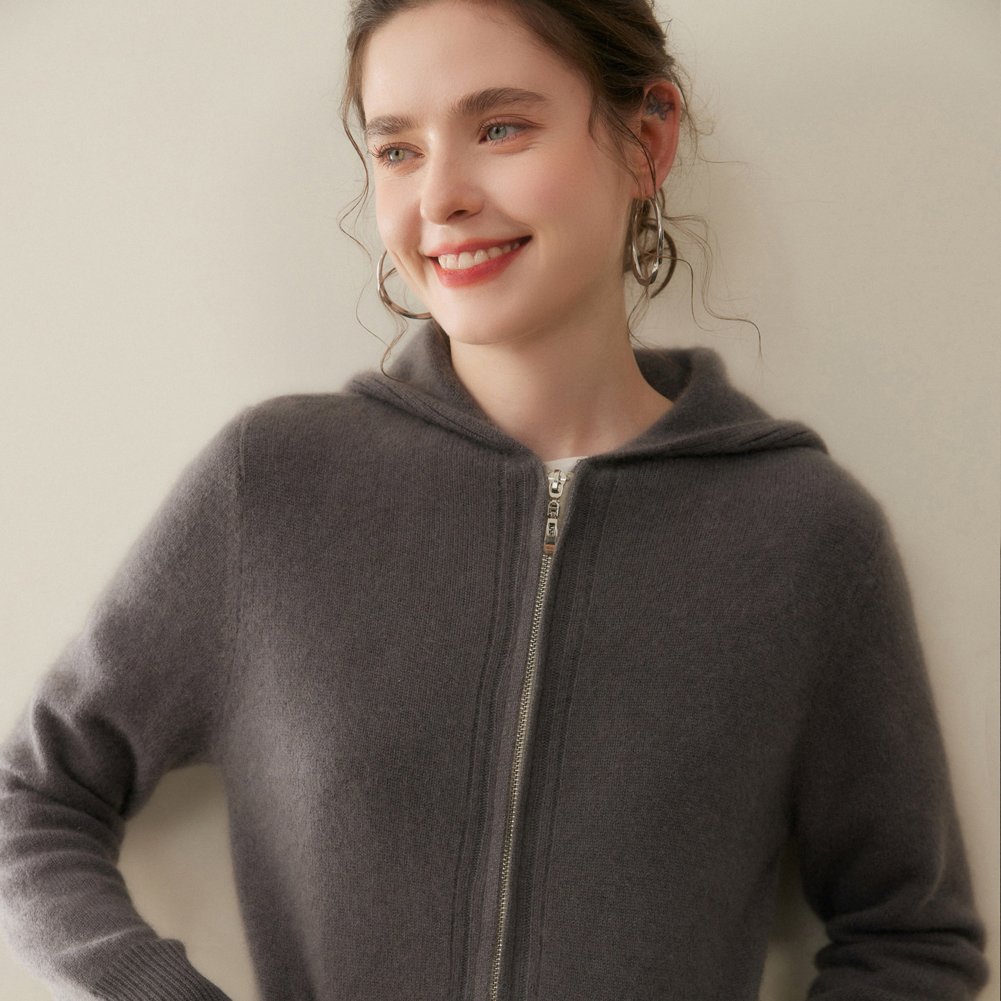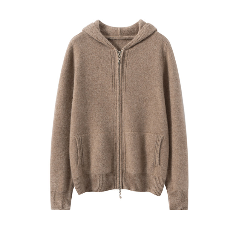 秋冬新款100%纯山羊绒开衫女加厚拉链连帽毛衣宽松针织打底衫外套
