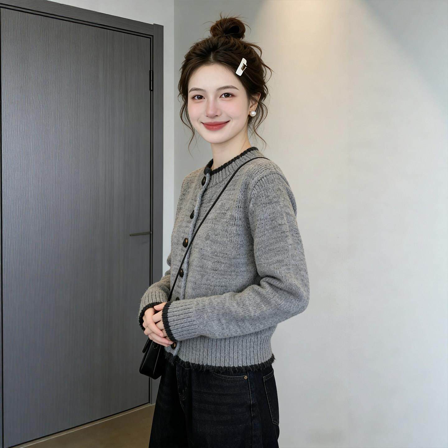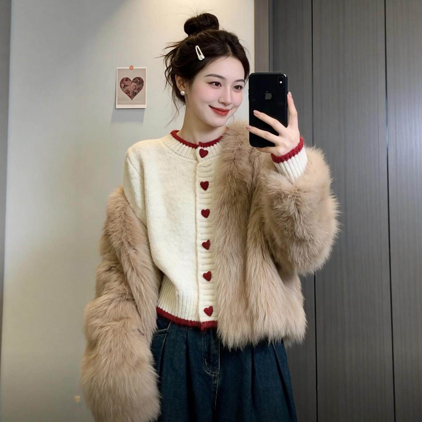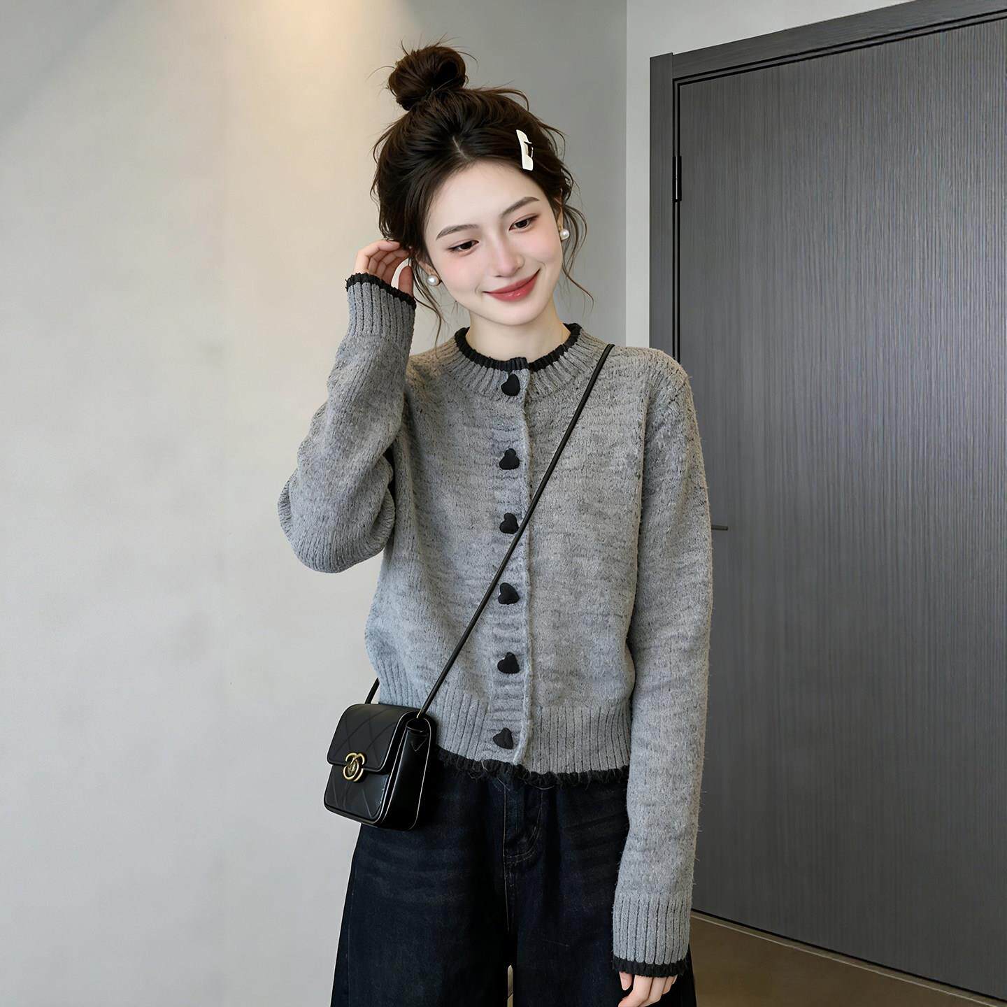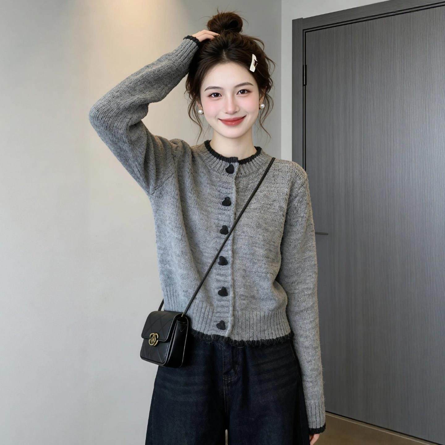 米白色圆领爱心纽扣针织开衫短款毛衣女款2026新款冬季慵懒风穿搭