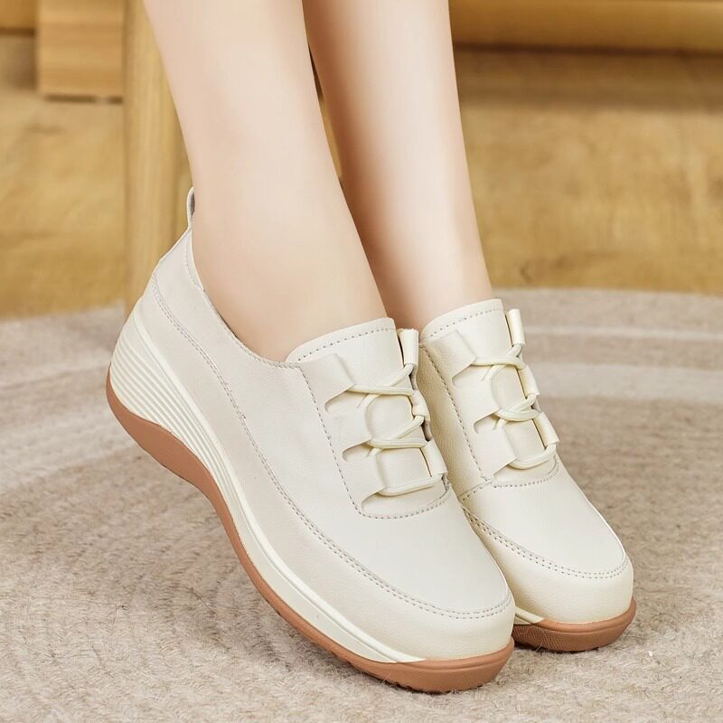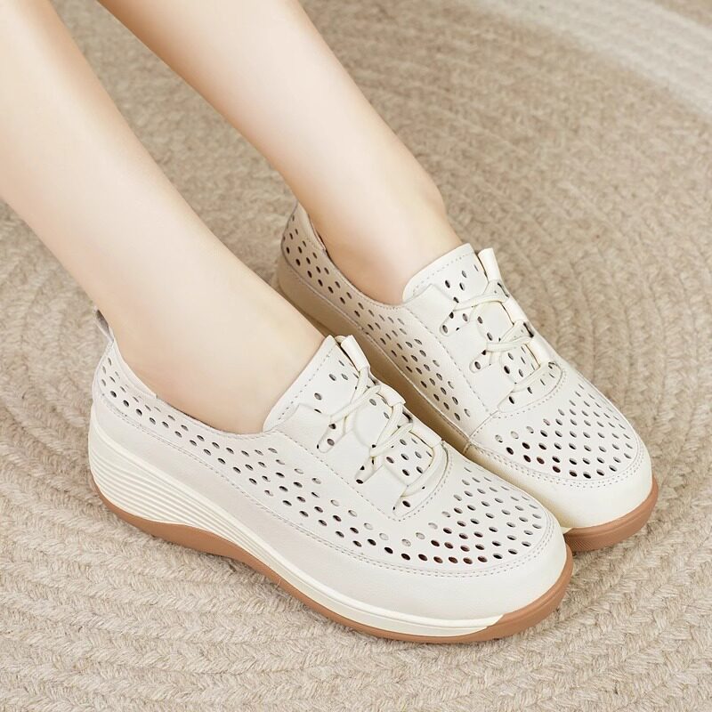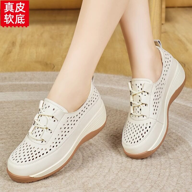 夏季真皮休闲乐福鞋女厚底镂空透气网眼鞋轻便软底不累脚妈妈凉鞋