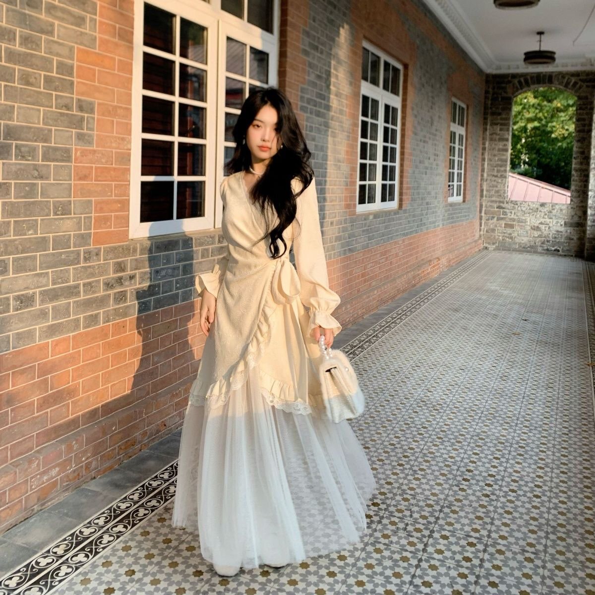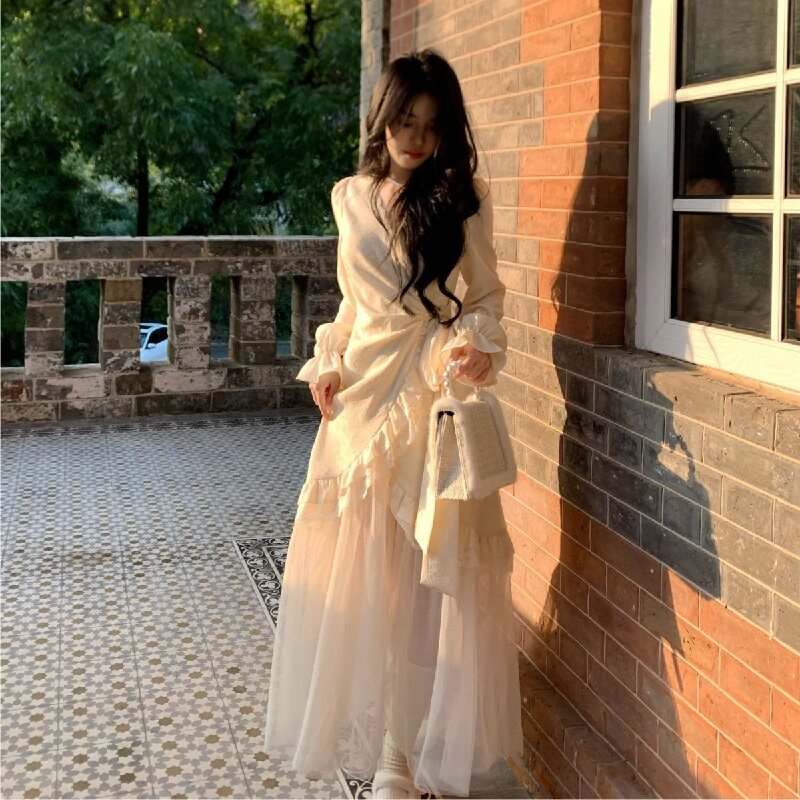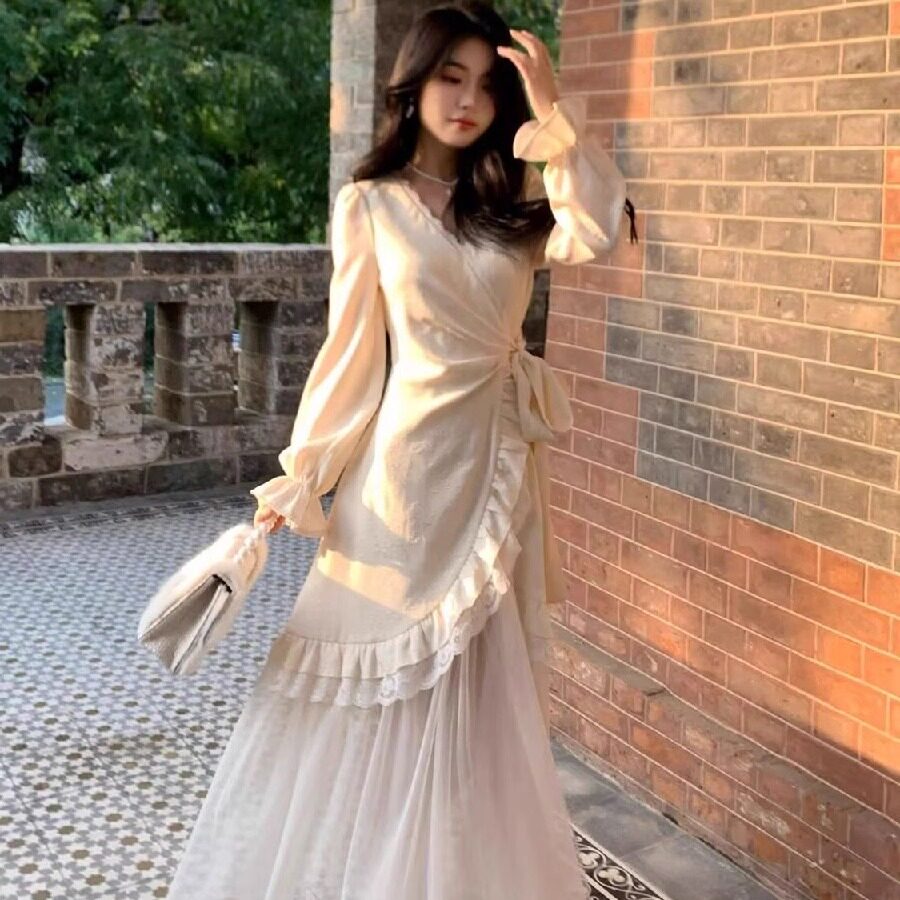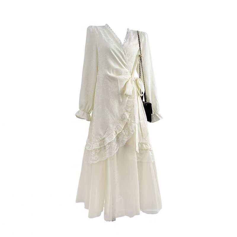 大码胖mm纯欲温柔蕾丝网纱花边绑带收腰连衣裙女秋冬气质仙女长裙