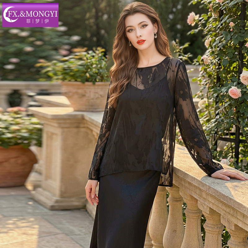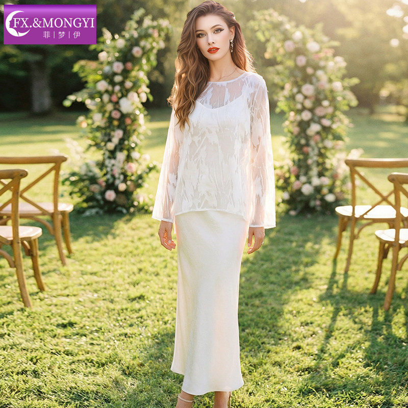 菲梦伊轻奢高级感时尚套装女夏季缎面垂感气质吊带连衣裙白色上衣