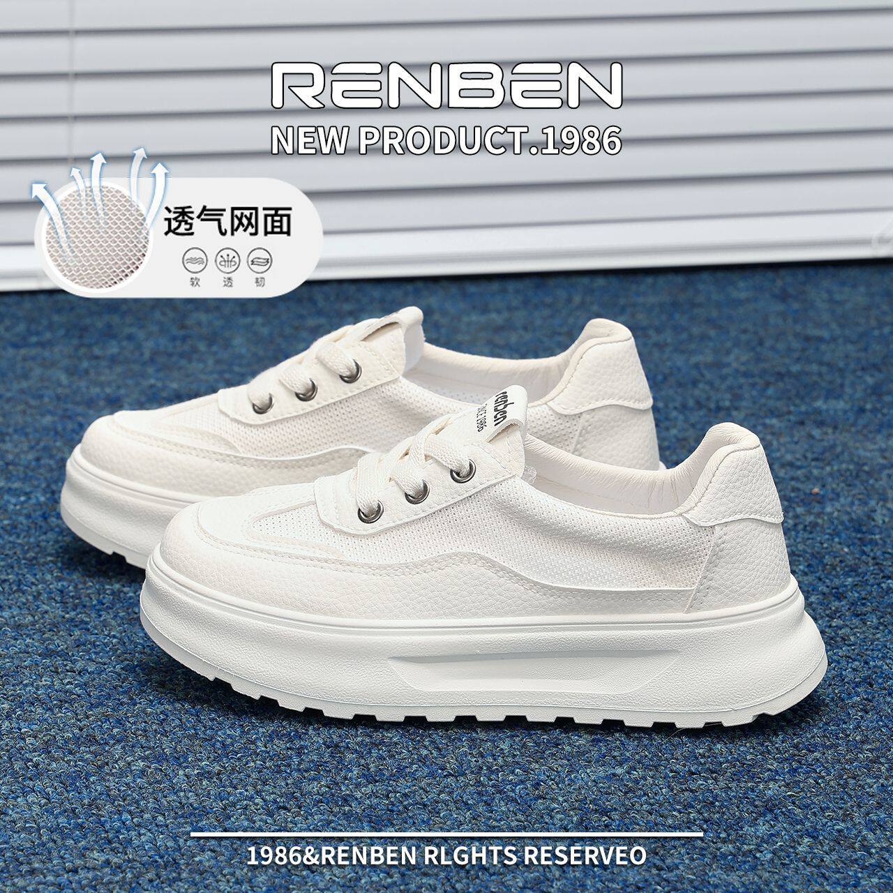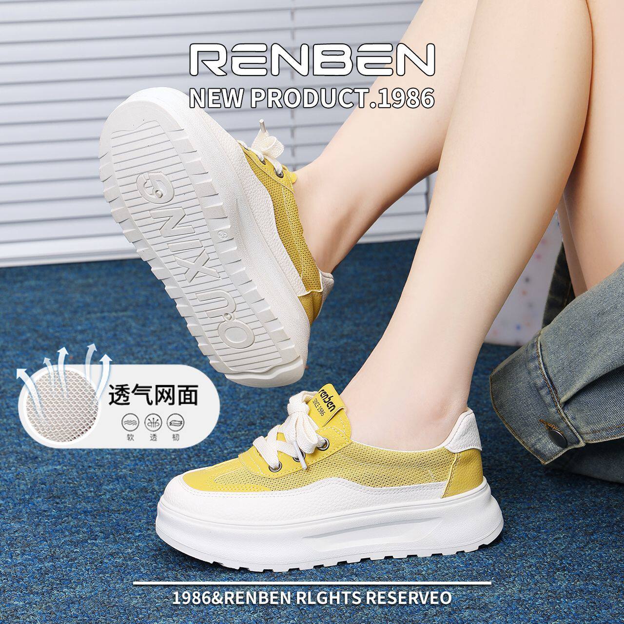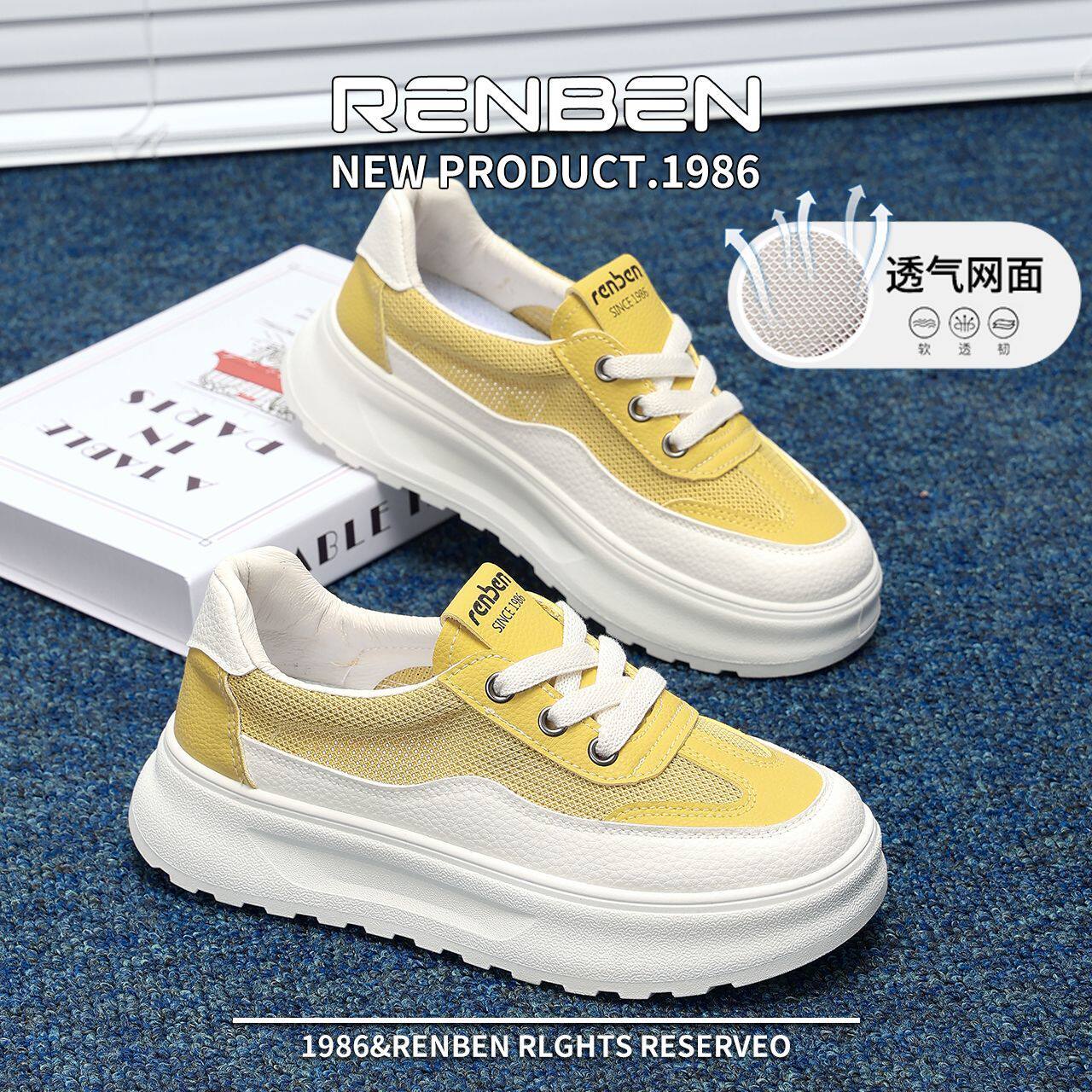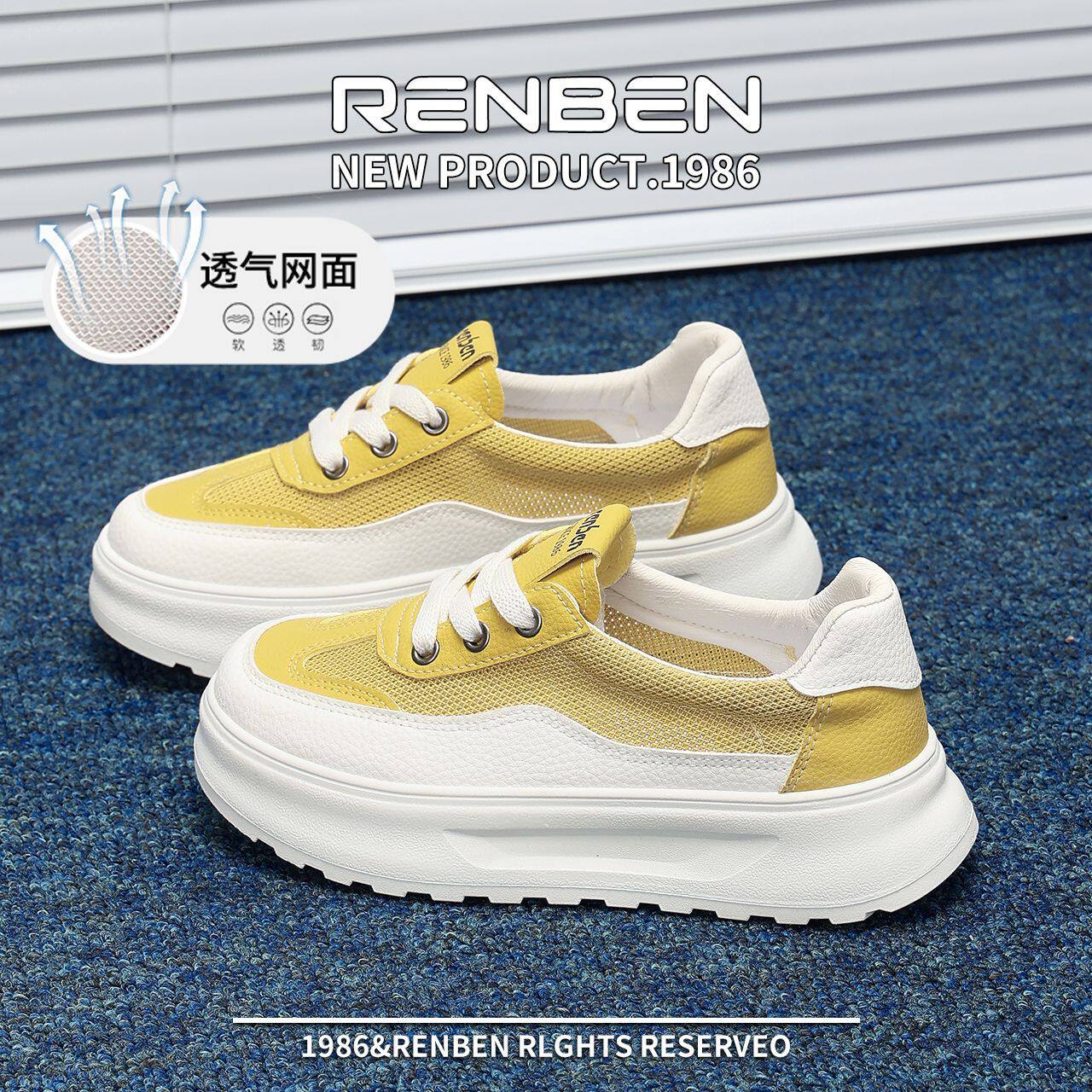 人本夏季单网厚底板鞋女2025新款休闲网鞋女透气运动小白鞋增高鞋