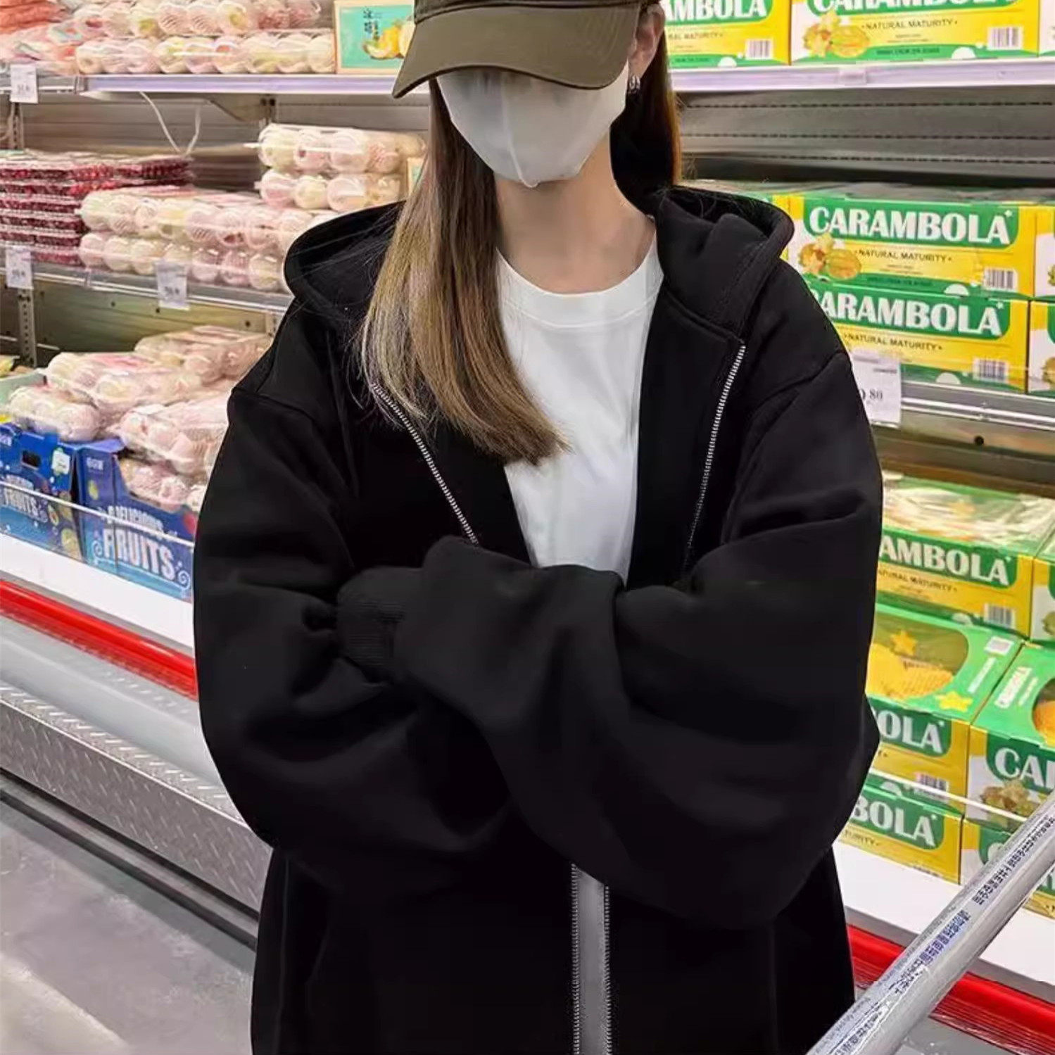 大码黑色连帽拉链宽松高级感超好看外套女开衫卫衣加绒加厚小个子