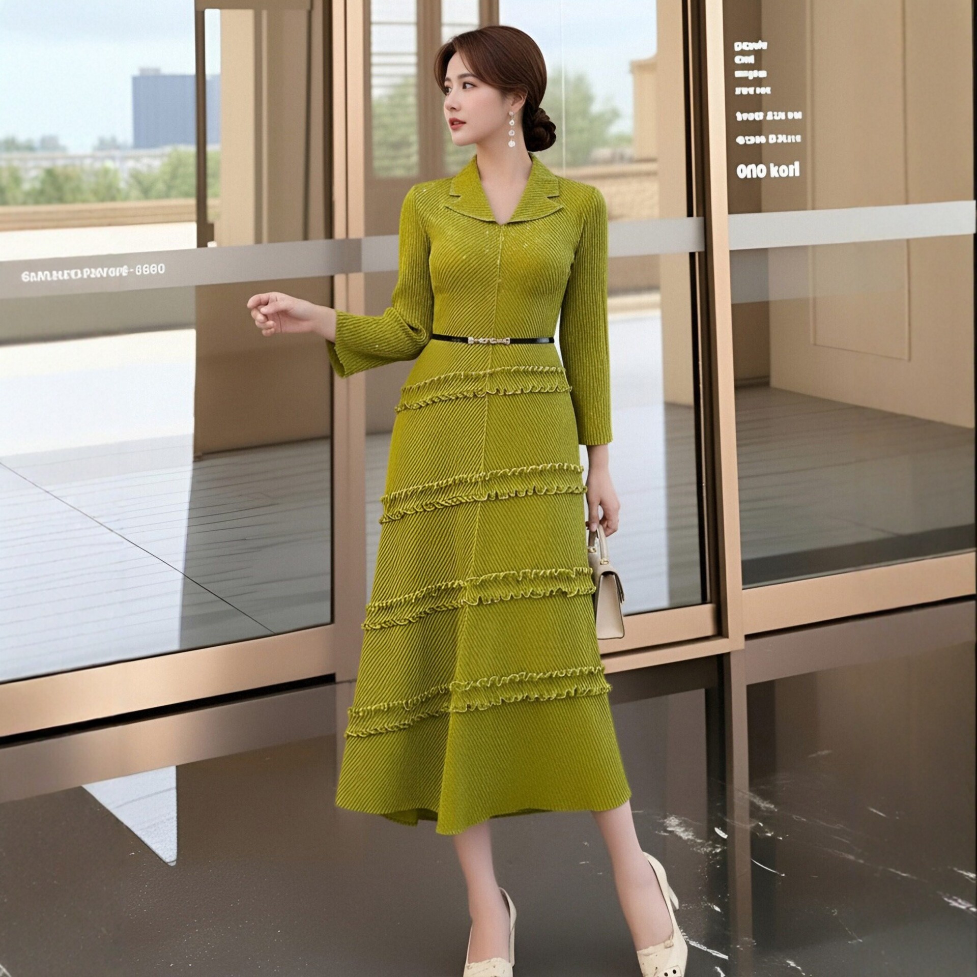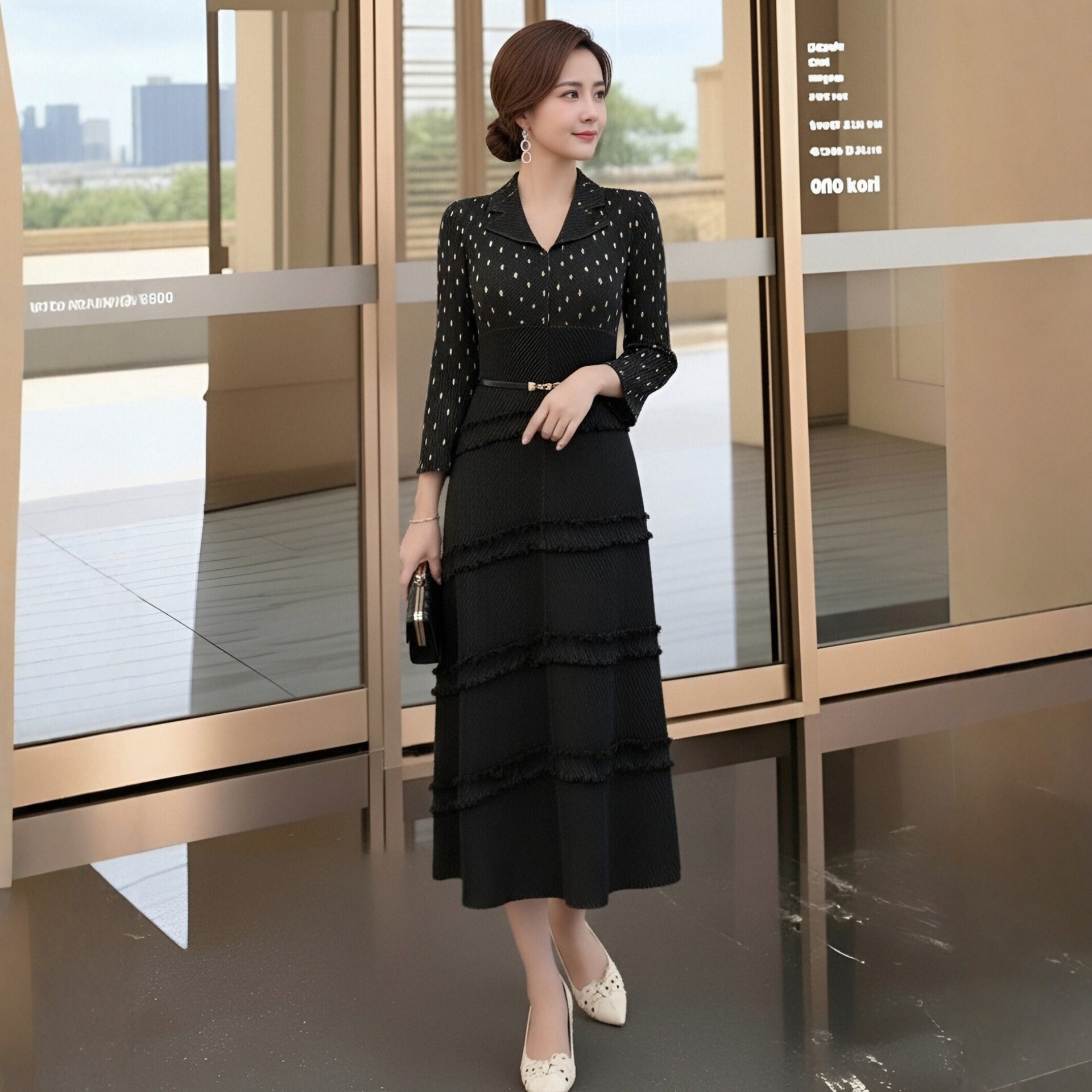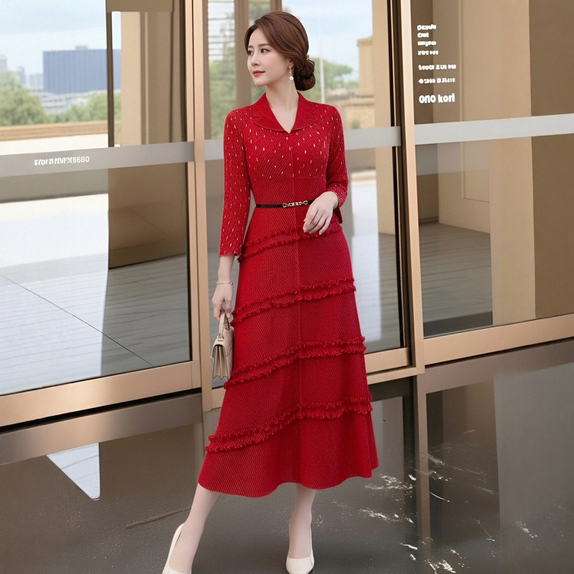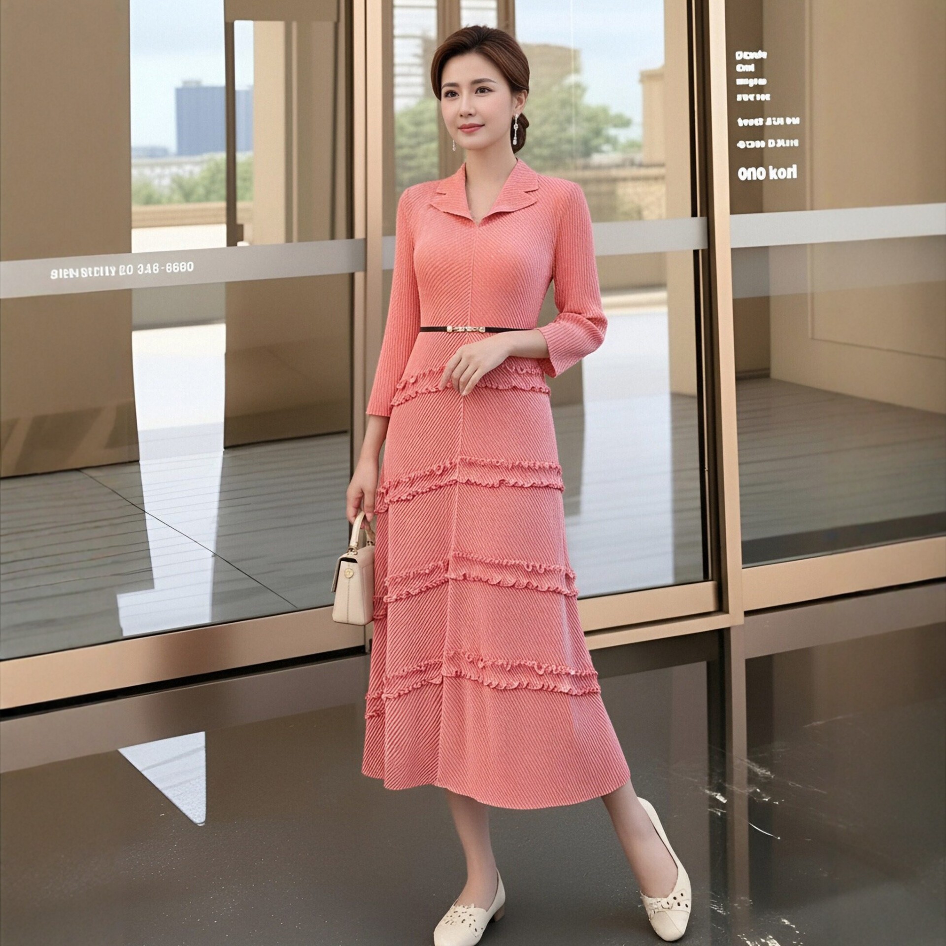 早春新款中年妈妈装褶皱连衣裙女收腰显瘦大码轻奢高级感垂坠长裙