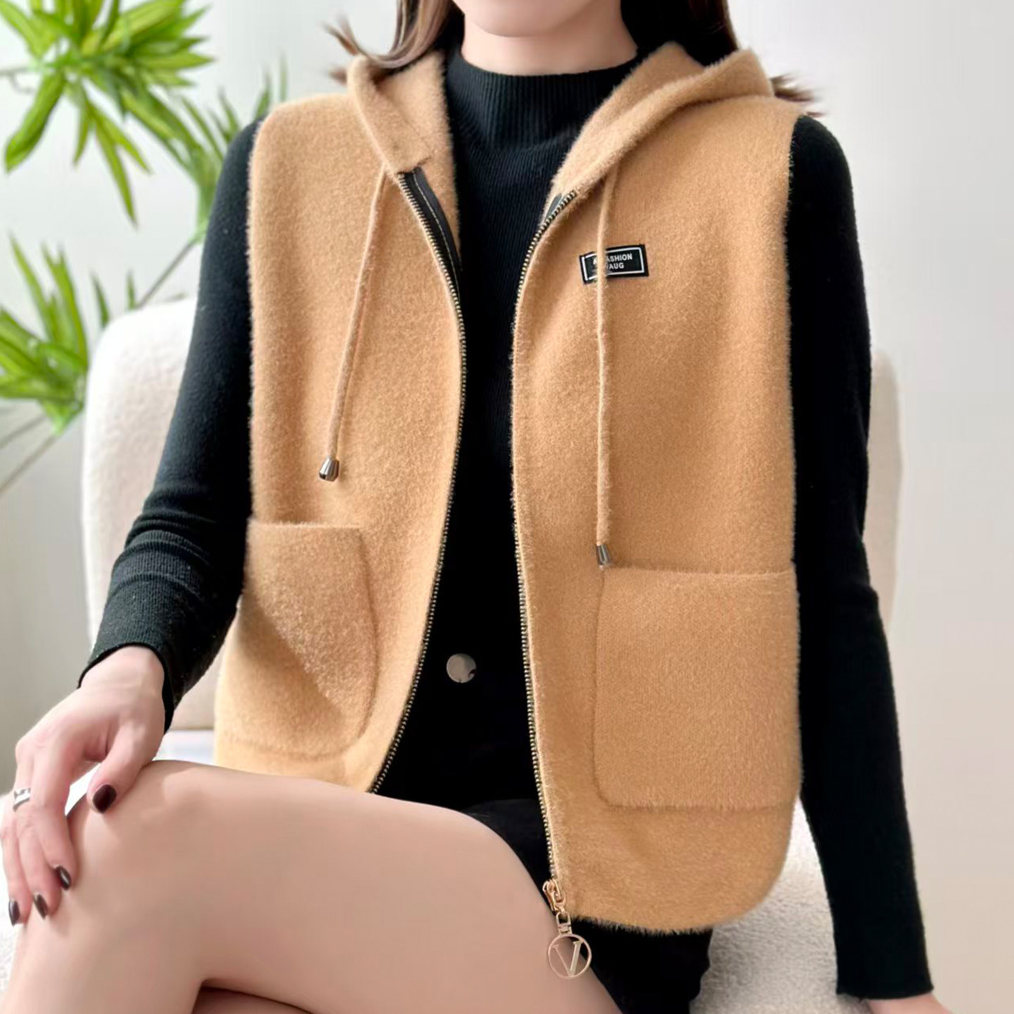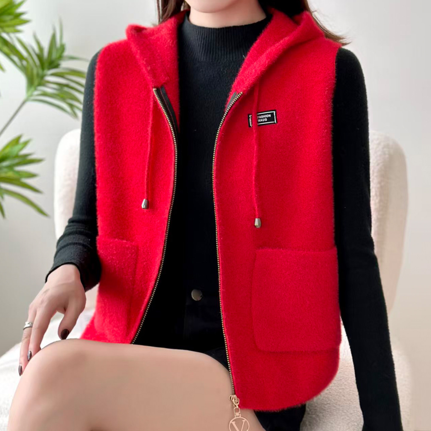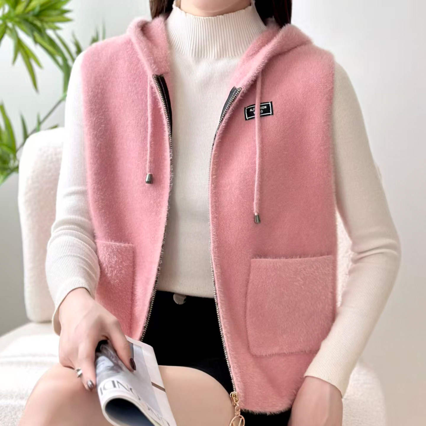 马甲女款2026新款冬加厚坎肩时髦洋气马夹连帽毛衣背心外套女装冬