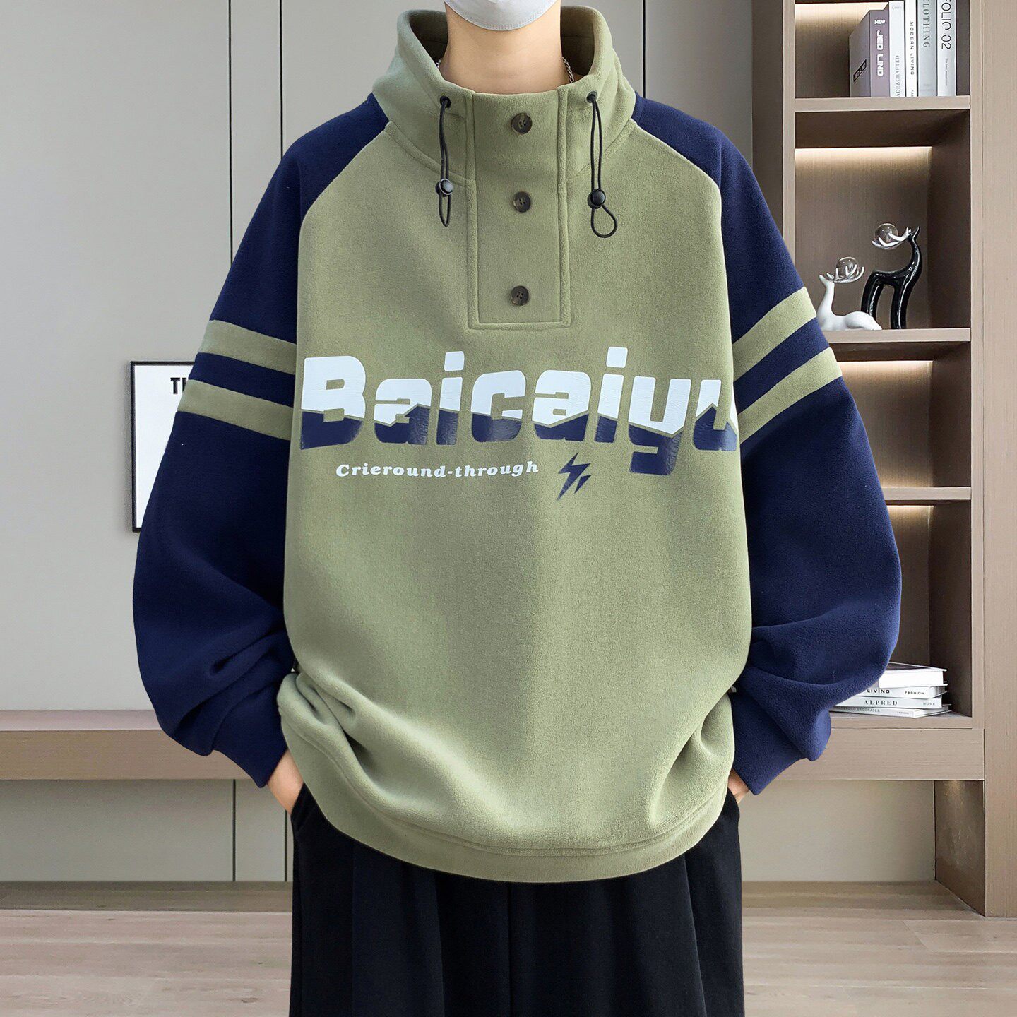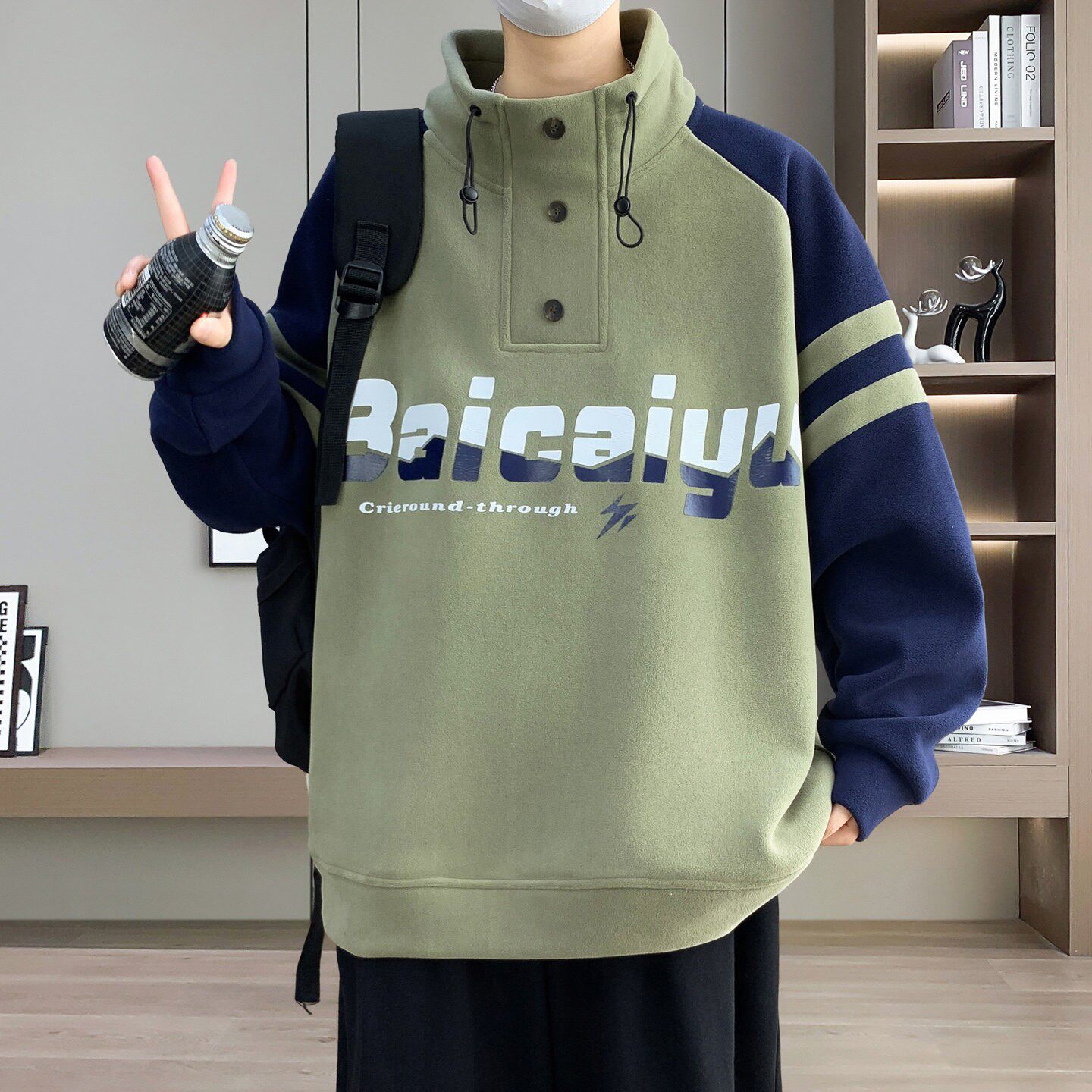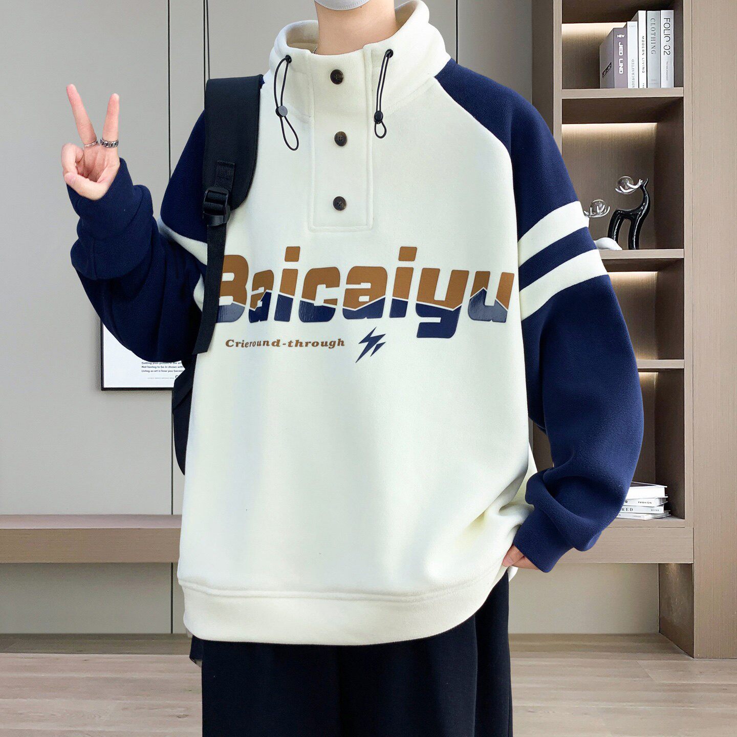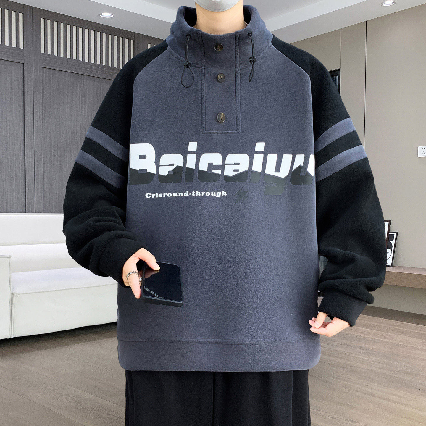 半高领加绒加厚卫衣男款秋冬季青少年潮牌撞色长袖打底衫保暖衣服