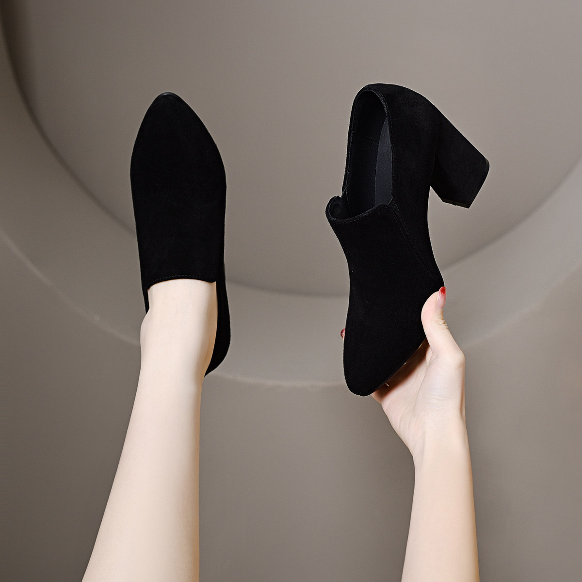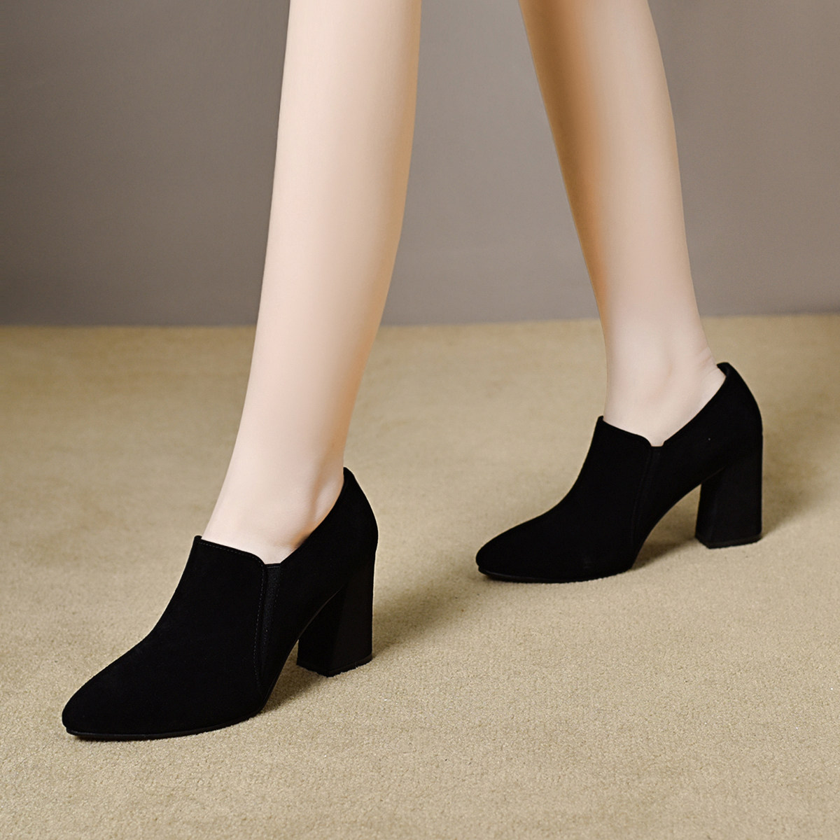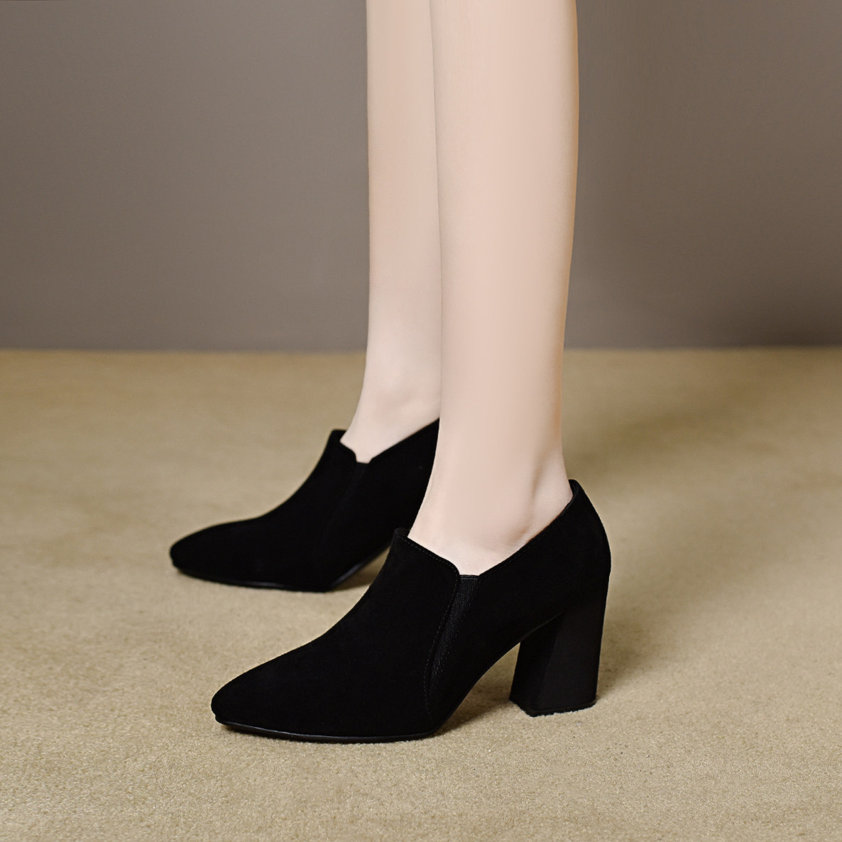 2026新款春款女鞋尖头羊皮绒面粗跟高跟鞋春秋气质深口单鞋真皮鞋