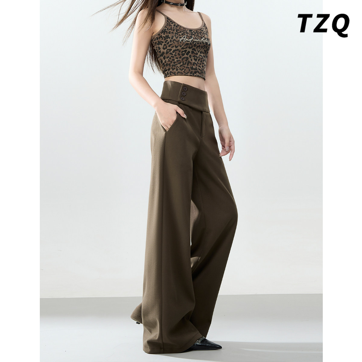 咖绿色美式垂感休闲裤女款爆款2026春季新款高腰显瘦拖地阔腿裤子