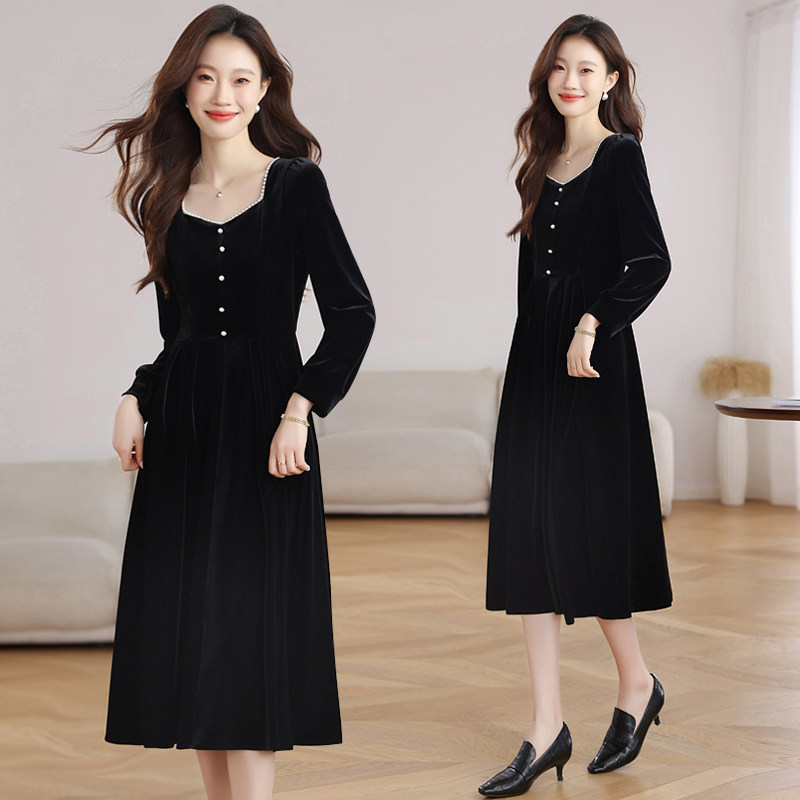 法式赫本风长袖连衣裙女春季2026新款收腰显瘦气质丝绒黑色长裙子