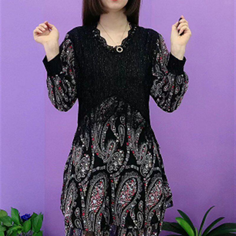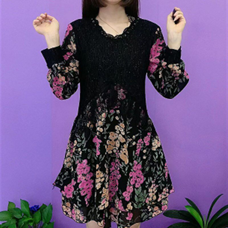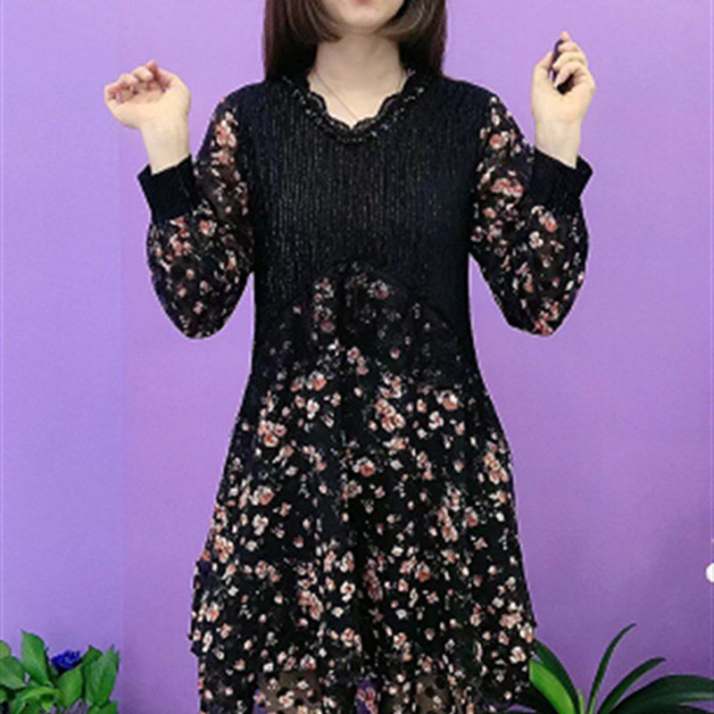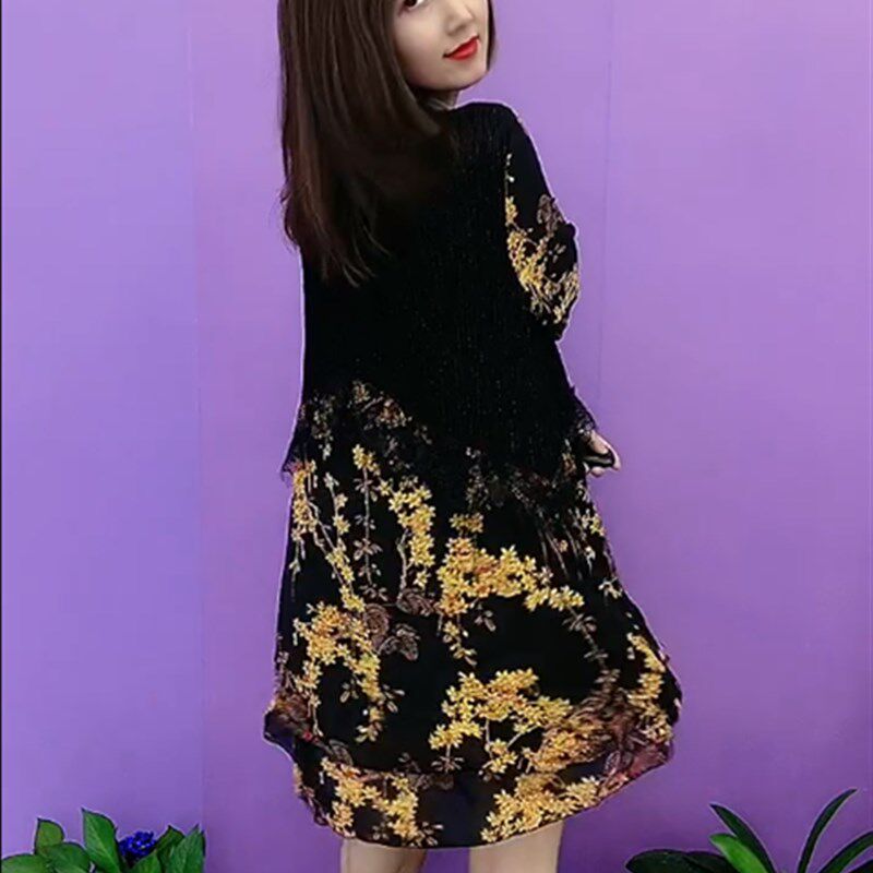 秋季新款拼接双层连衣裙长袖V领宽松显瘦时尚气质百搭中长款a字裙
