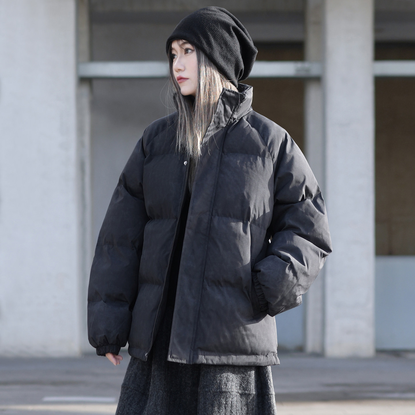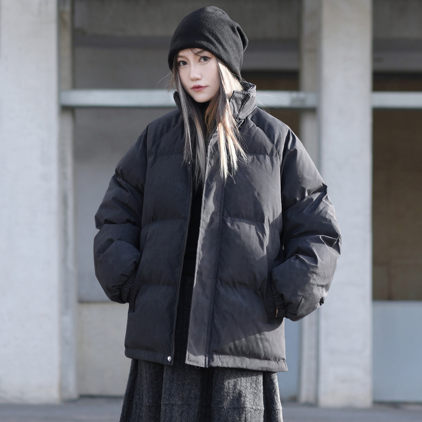 黑色宽松无帽立领棉服夹克女款秋冬季加厚保暖外套韩系面包服棉衣