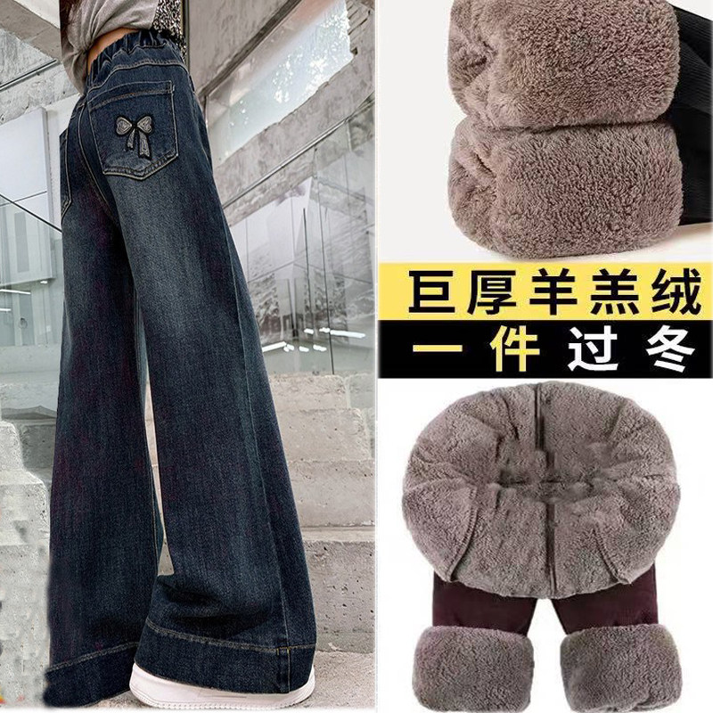 女童冬季加厚羊羔绒裤子2026新款大儿童窄版加绒保暖阔腿牛仔裤潮
