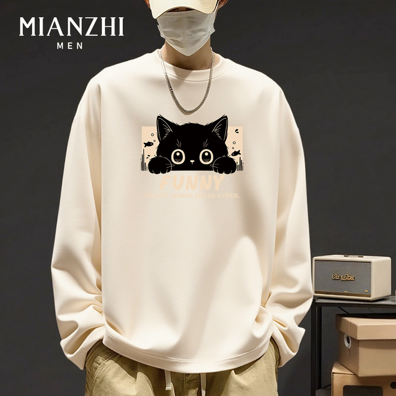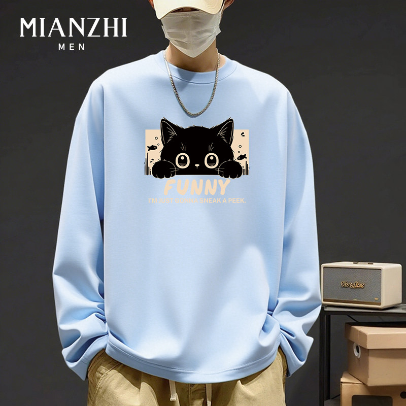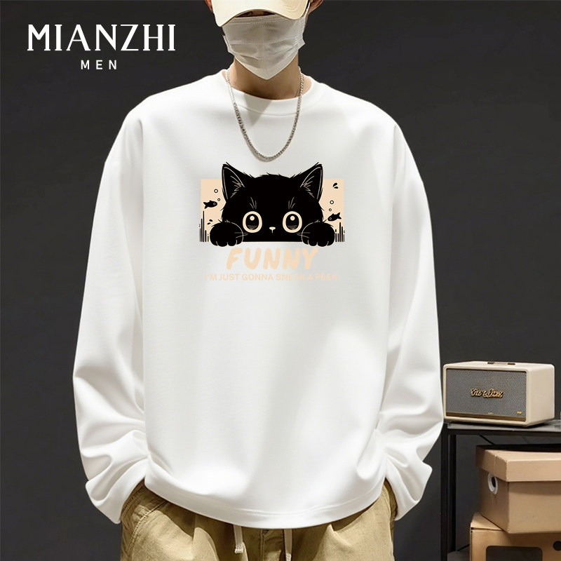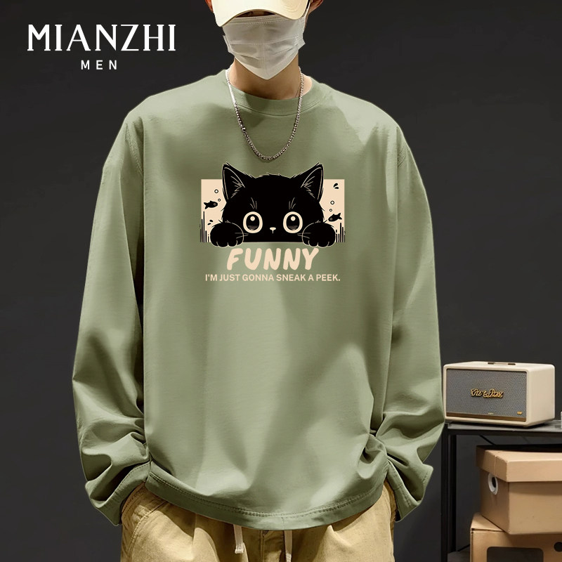 棉致卡通小黑猫趣味大码春秋宽松青少年纯棉长袖t恤男款打底衫潮