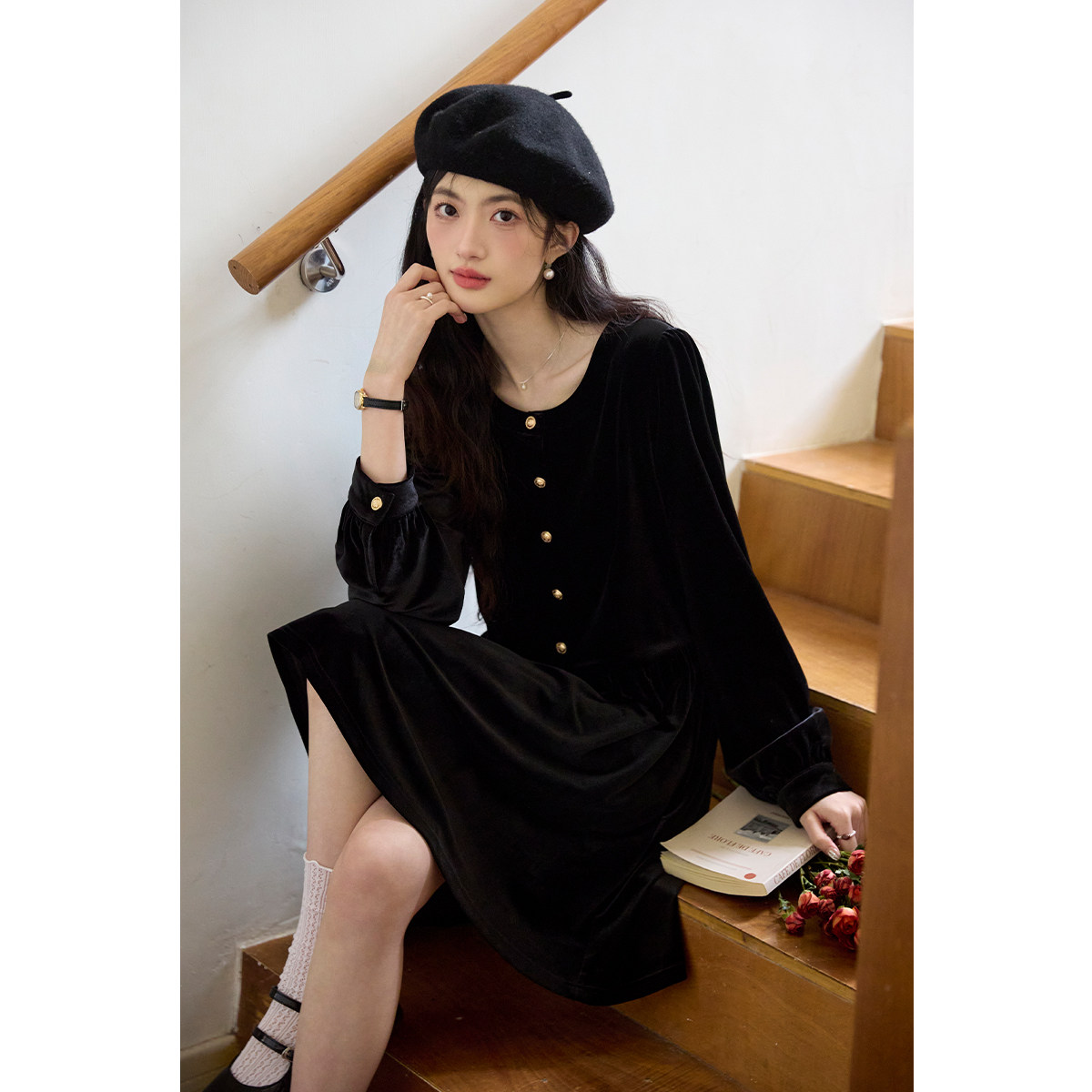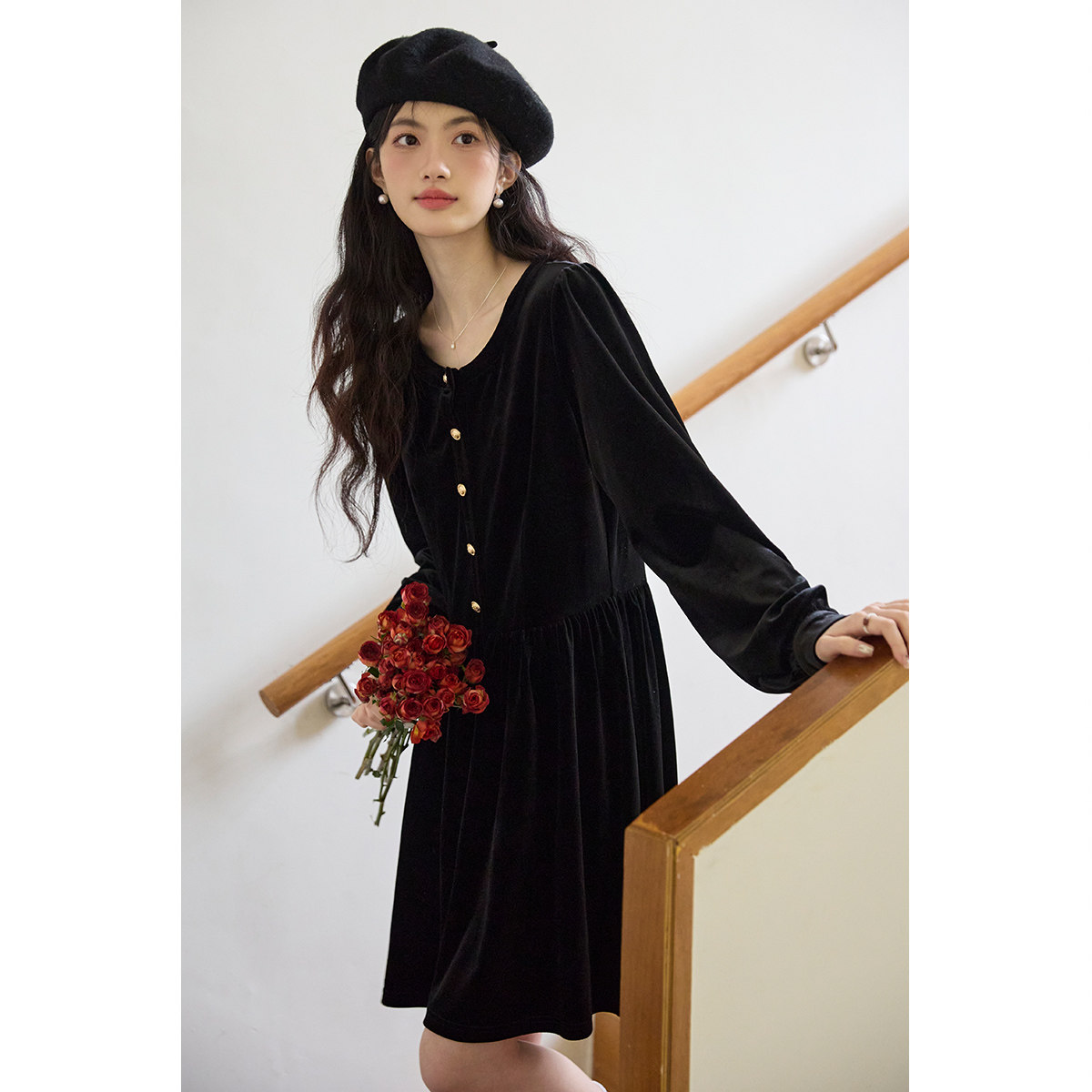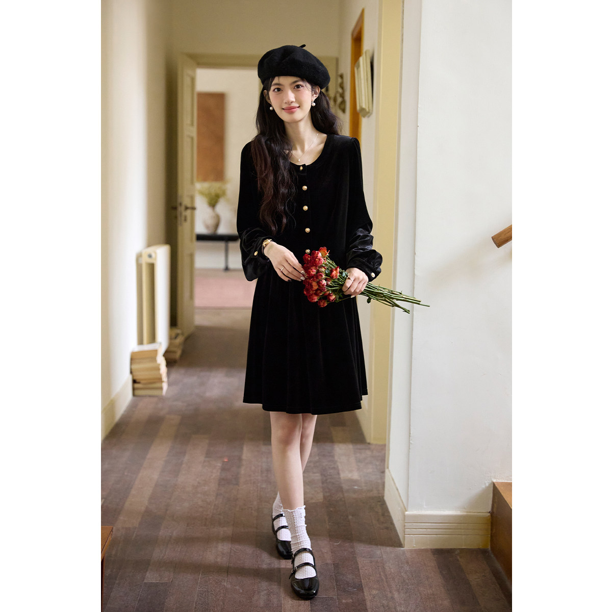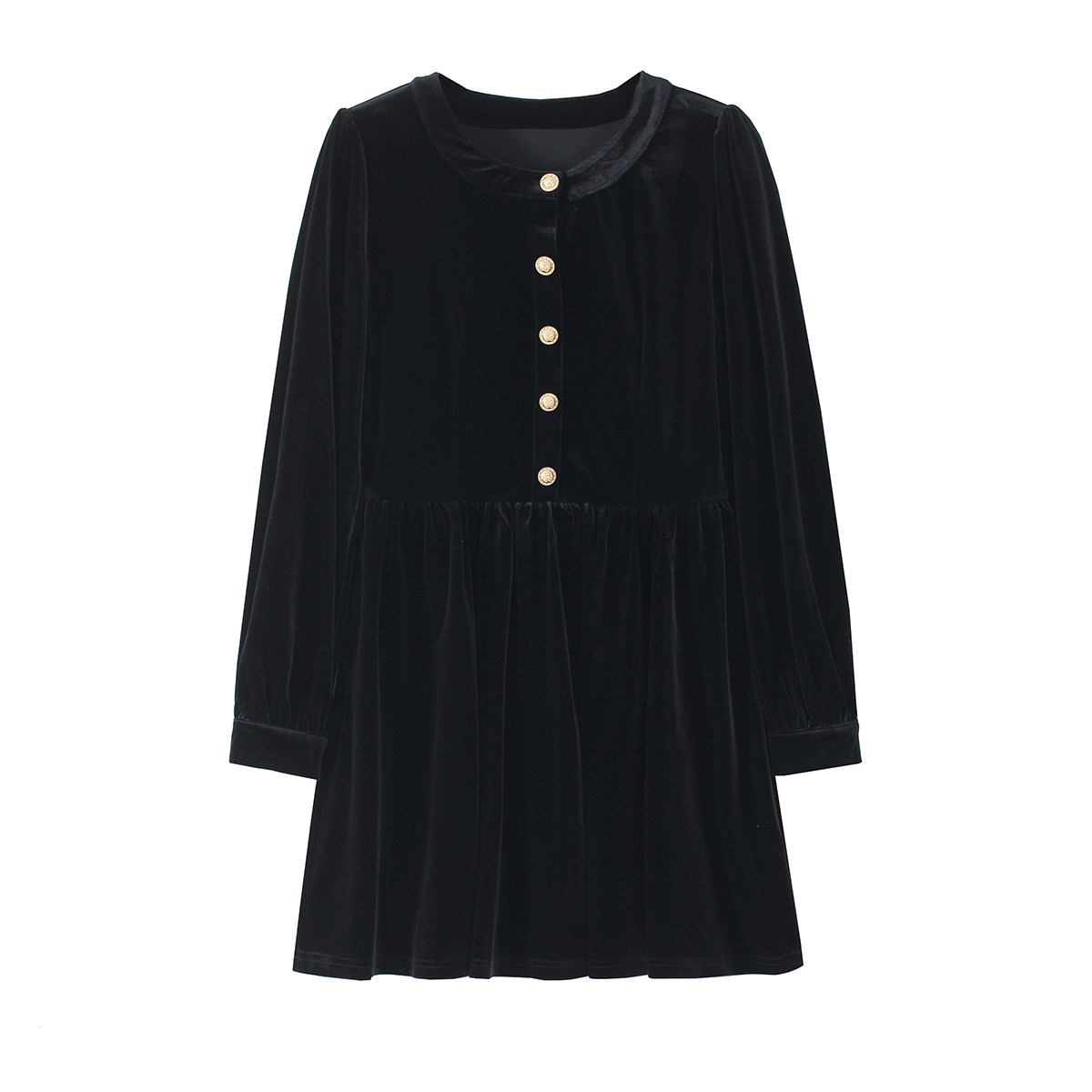 弥古黑色长袖丝绒连衣裙女春季修身小个子赫本风法式打底内搭短裙