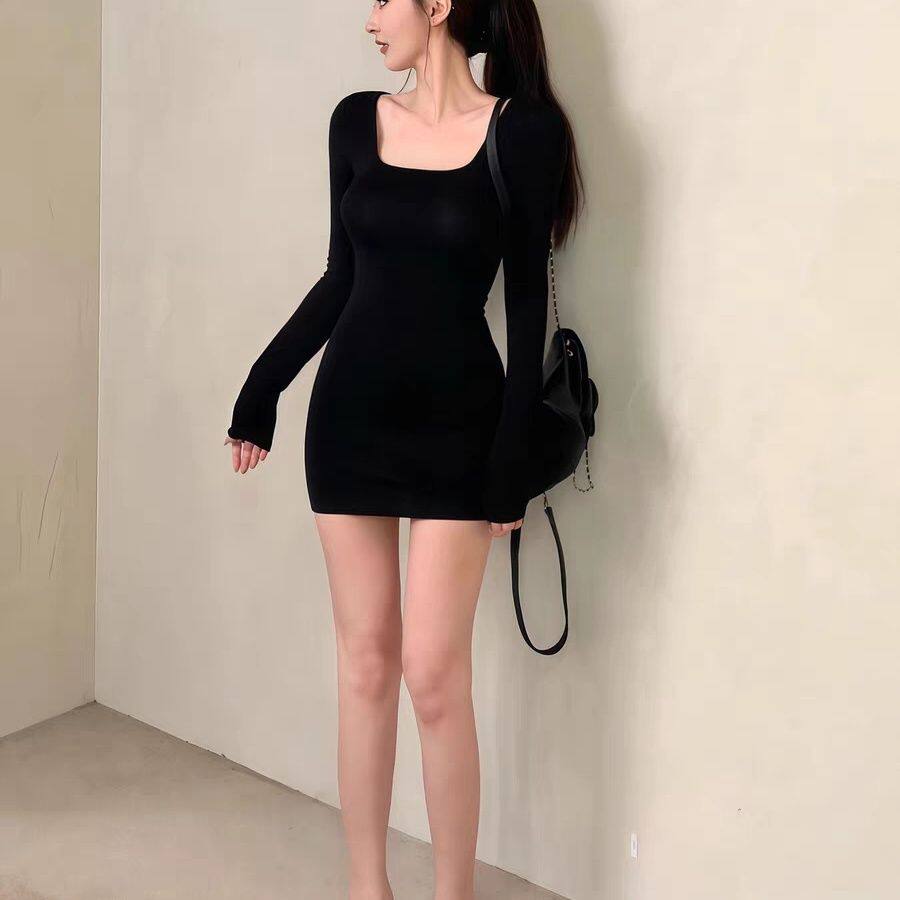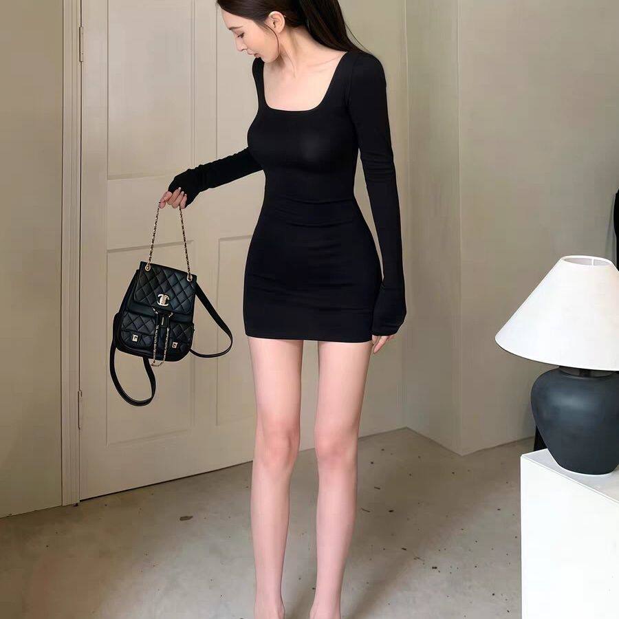 秋季辣妹穿搭性感修身包臀裙子短款内搭打底方领黑色长袖连衣裙女