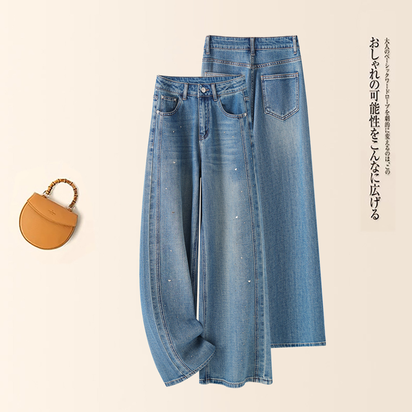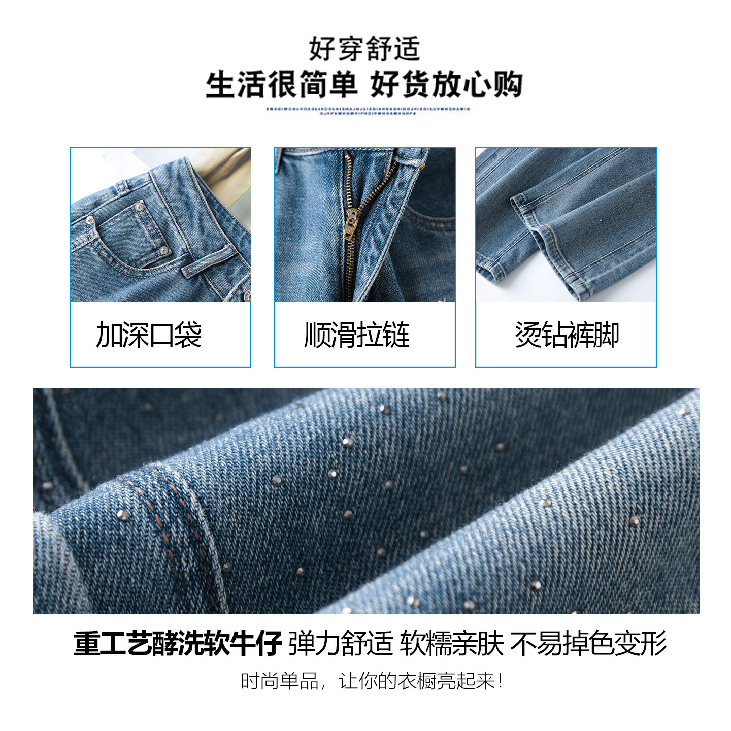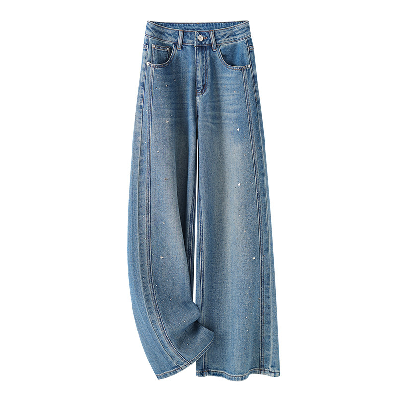 蓝色烫钻弹力牛仔裤女2026年春夏新款高腰宽松显瘦直筒阔腿九分裤