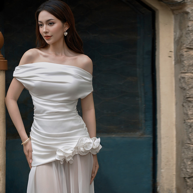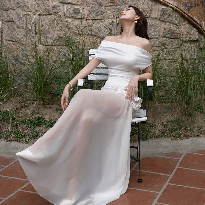 SylCue女神气质高级感白色网纱拼接一字肩连衣裙褶皱显瘦拖地长裙