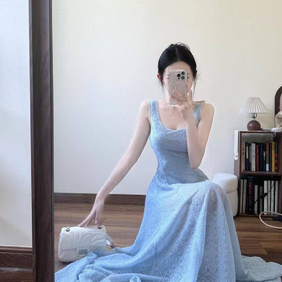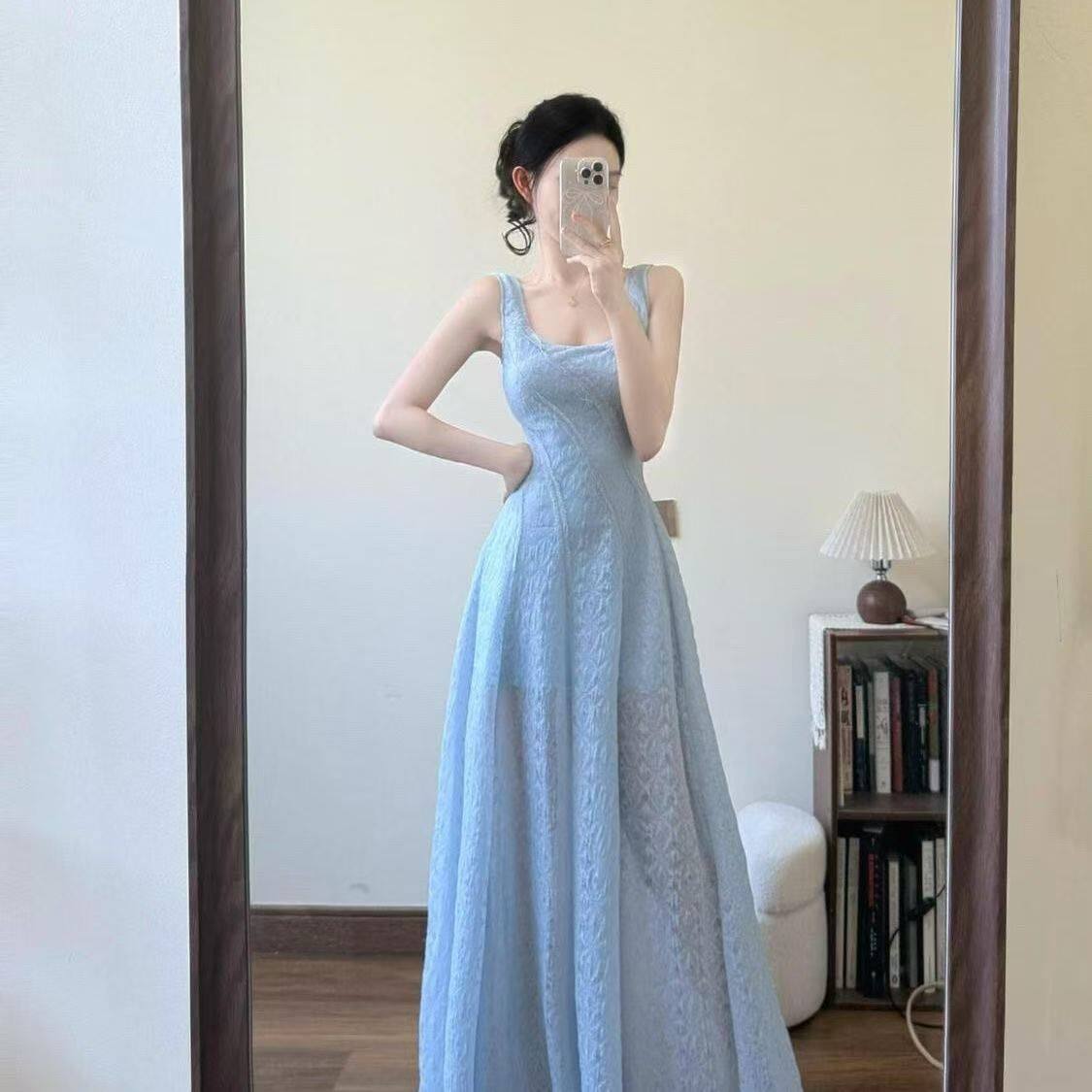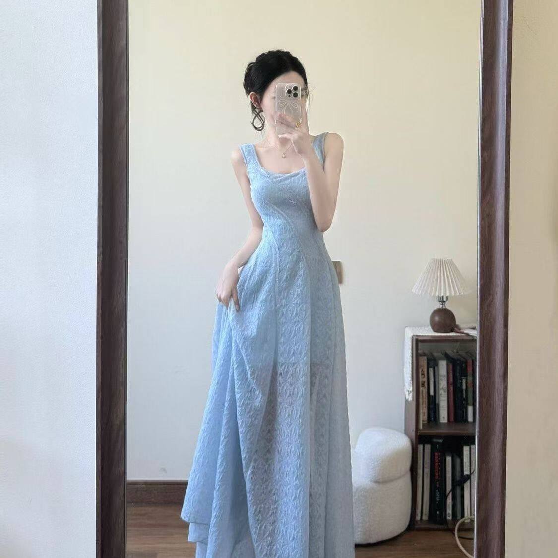 法式气质蓝色吊带连衣裙女夏季大码胖mm海边度假收腰显瘦绝美长裙