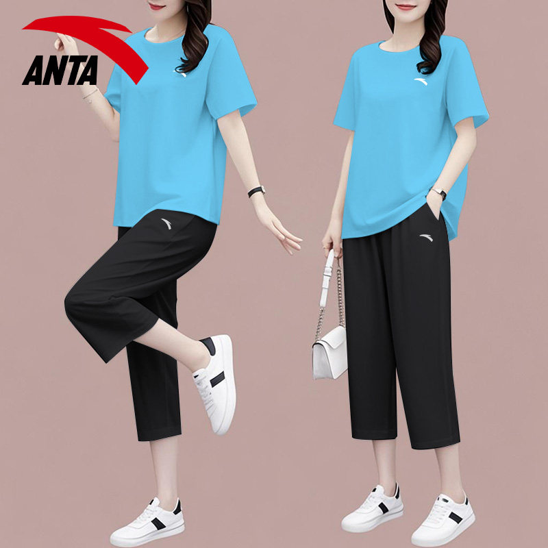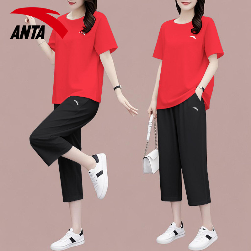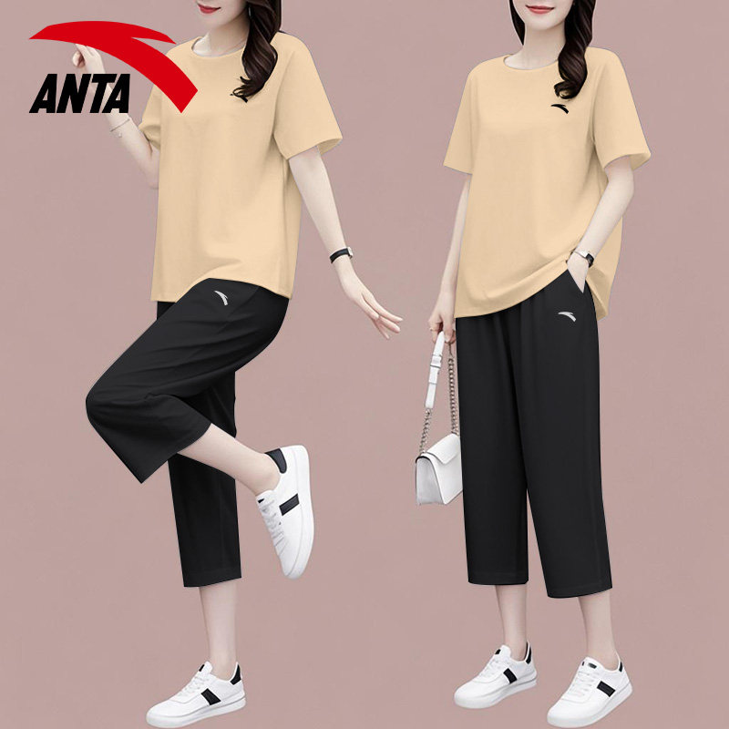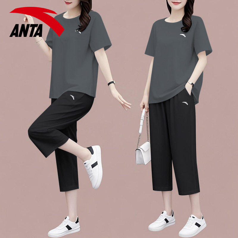 安踏休闲套装女装宽松黑色显瘦衣服中年妈妈时尚运动速干短袖短裤