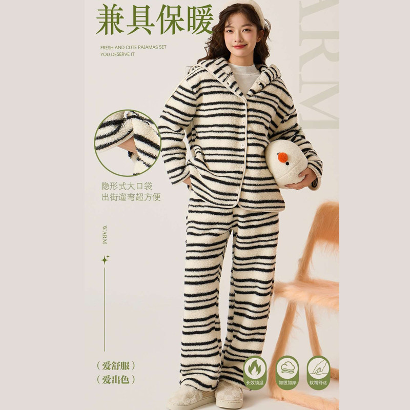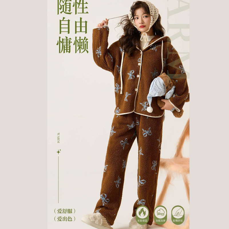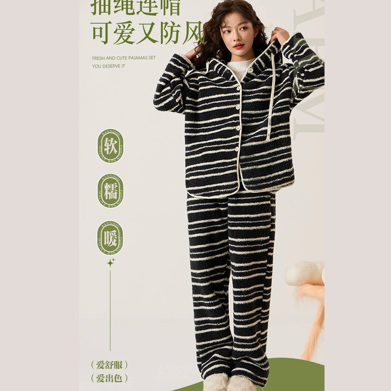 时尚洋气连帽暖肤珊瑚绒家居服女款2025新款冬加厚加绒可外穿睡衣