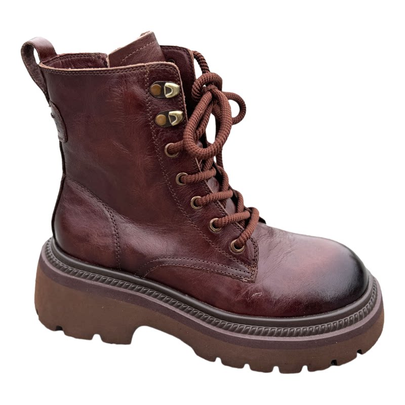 高端品质抓纹头层牛皮马丁靴女系带时尚欧美潮酷复古粗跟高跟短靴