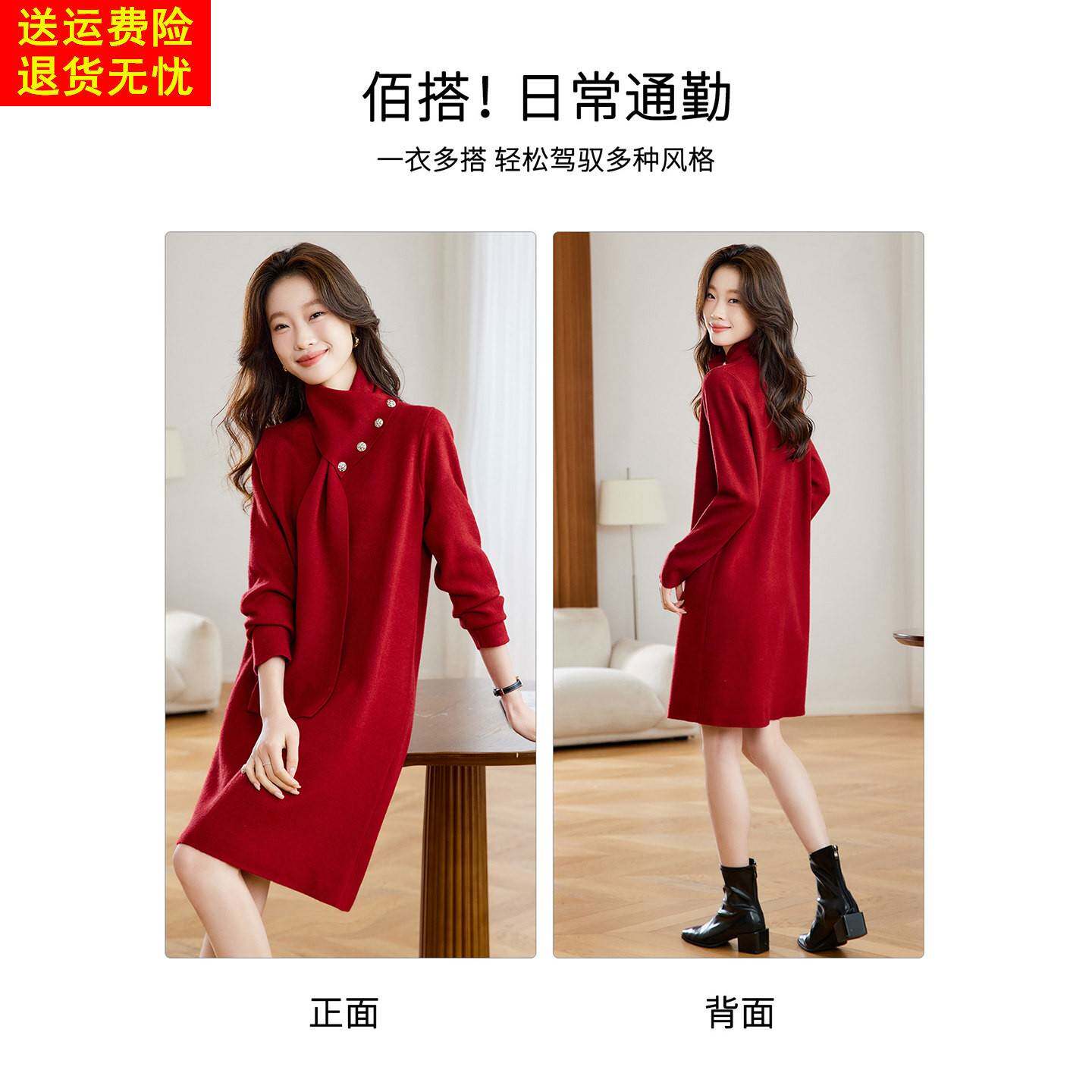 红色V领连衣裙女2025冬新款气质中长款配围巾软糯针织裙新年战袍