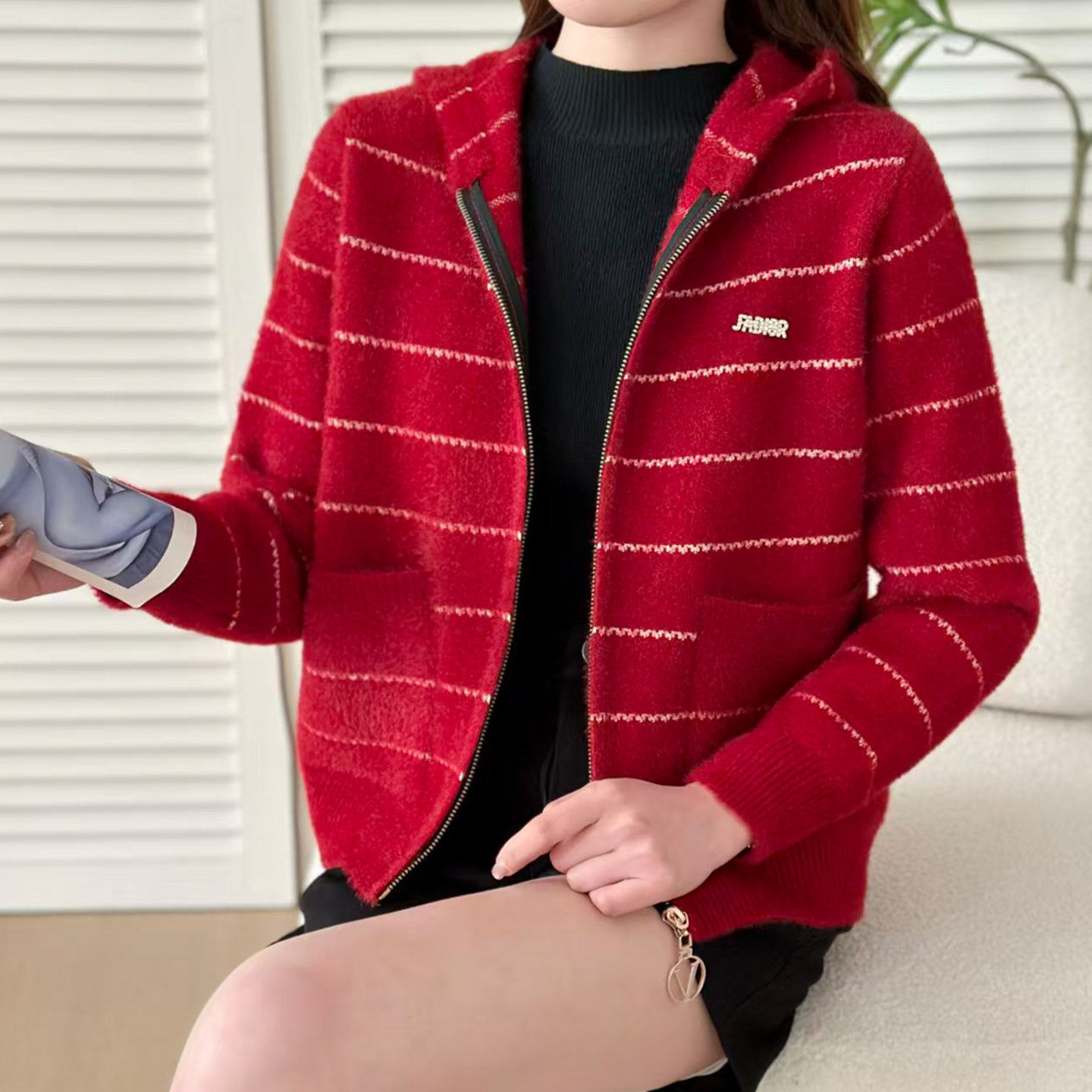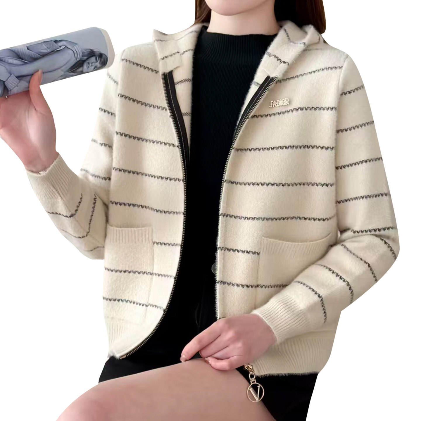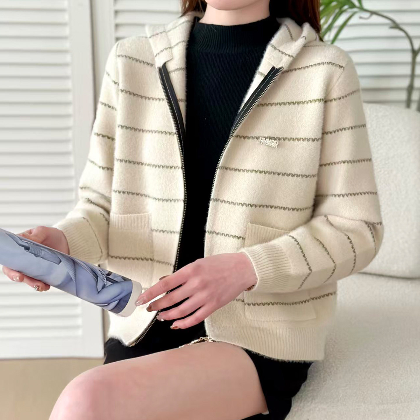外套春款2026新款女装条纹连帽毛衣百搭休闲针织开衫早春气质上衣