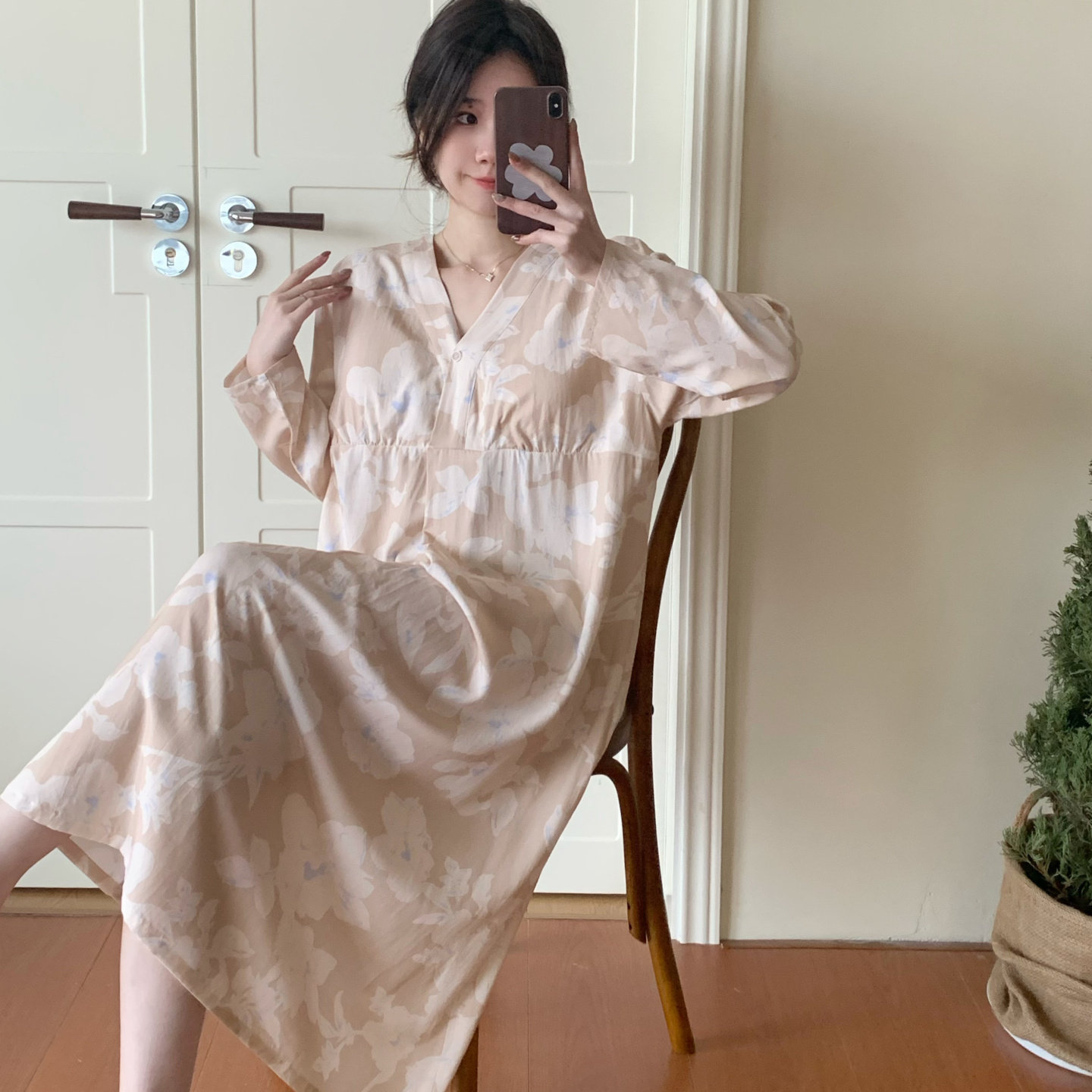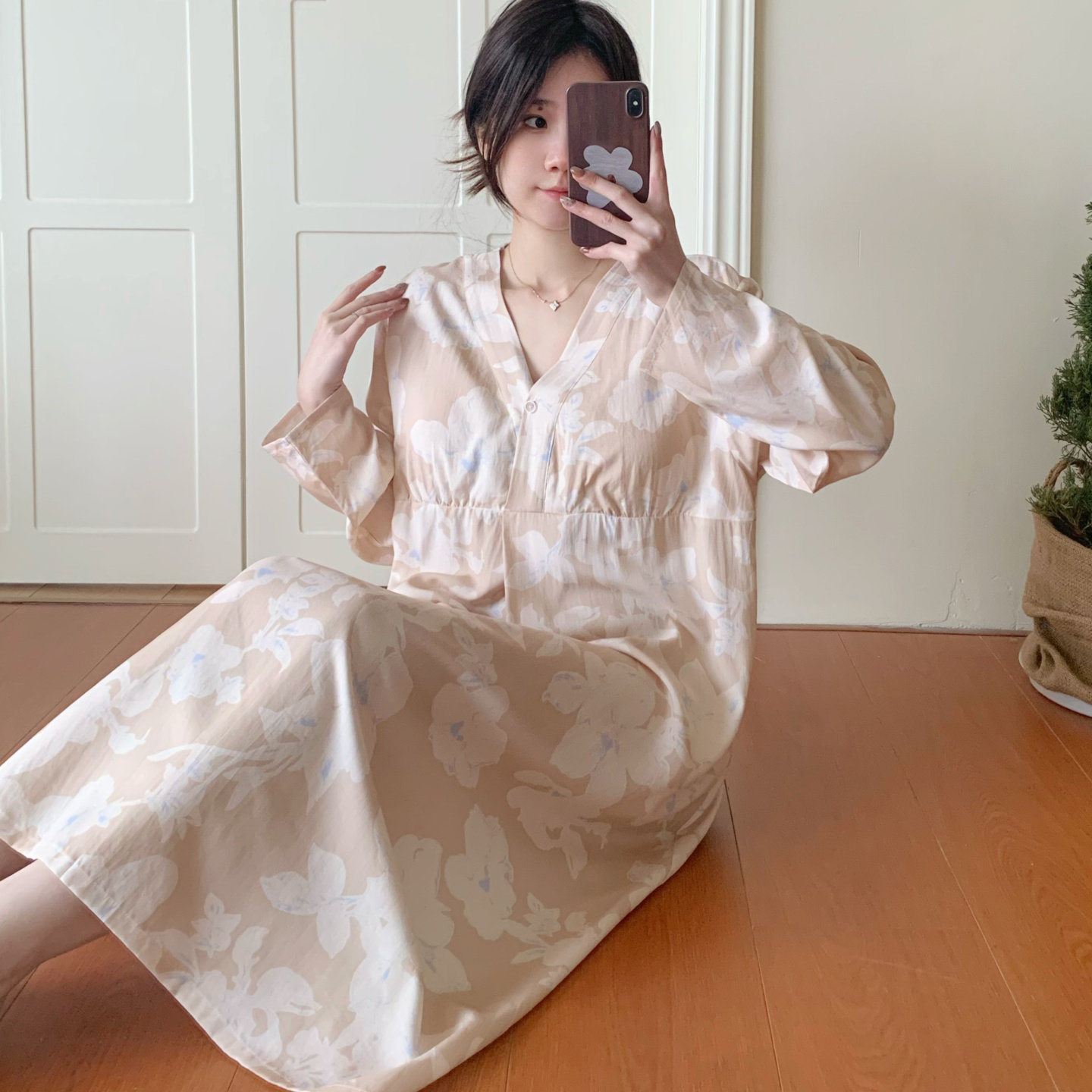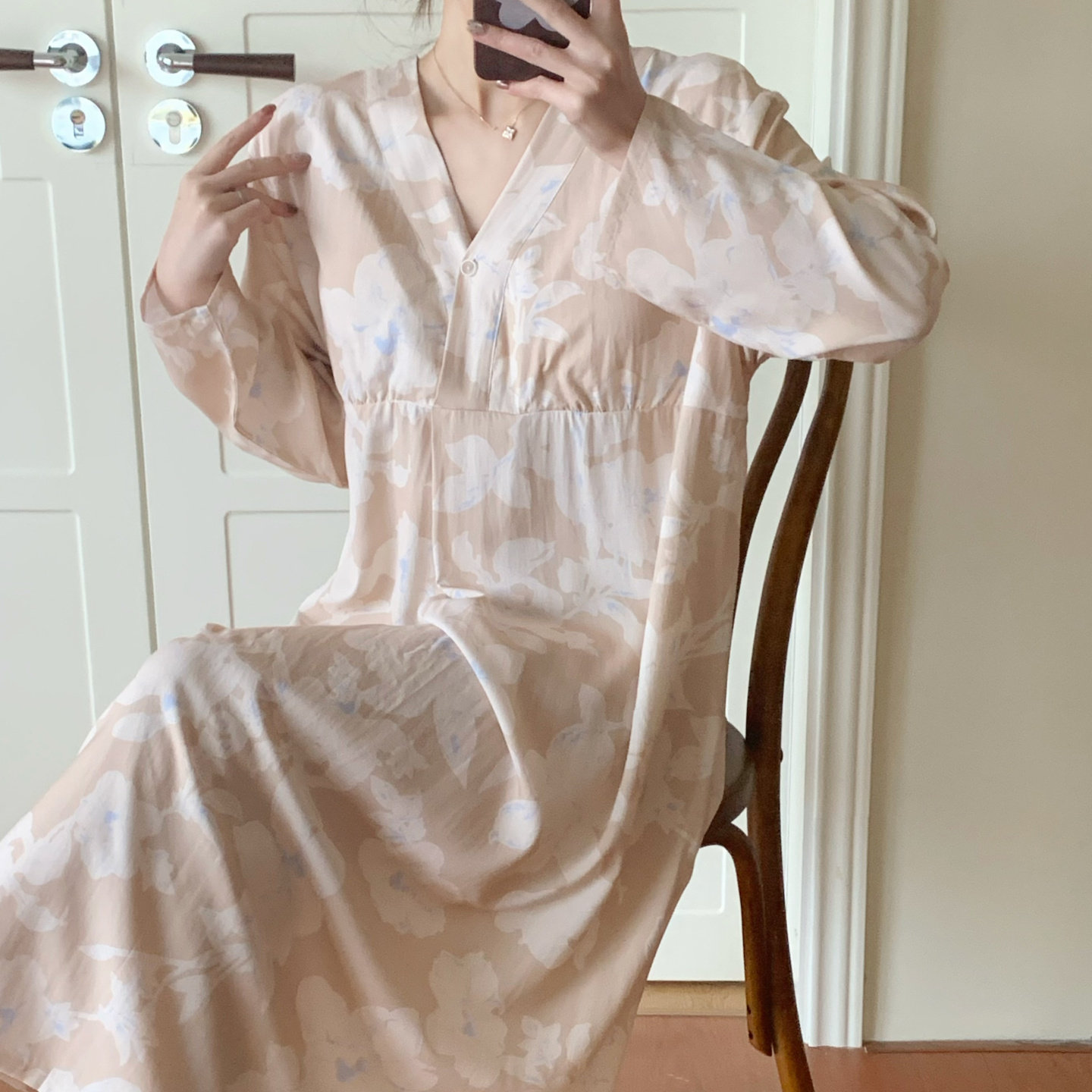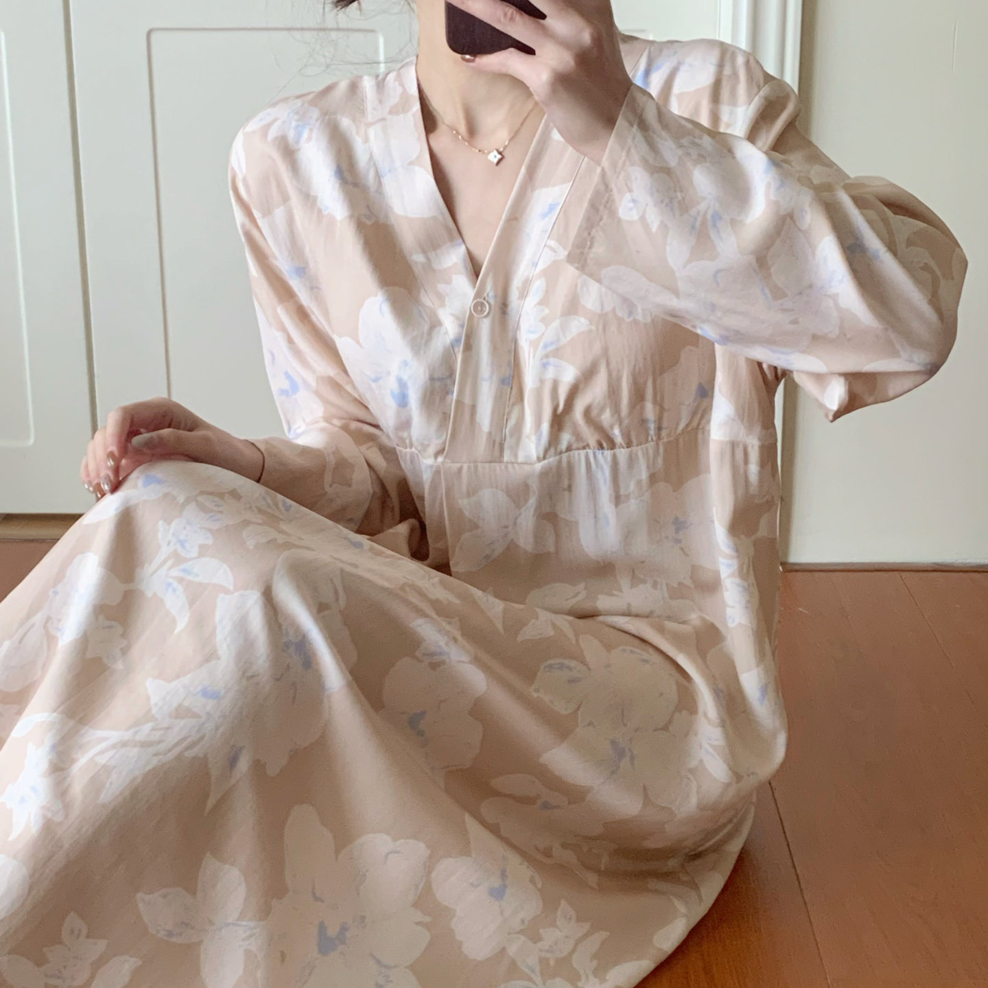带胸垫甜美V领长袖日系睡裙女夏季薄款中长款可外穿家居服连衣裙