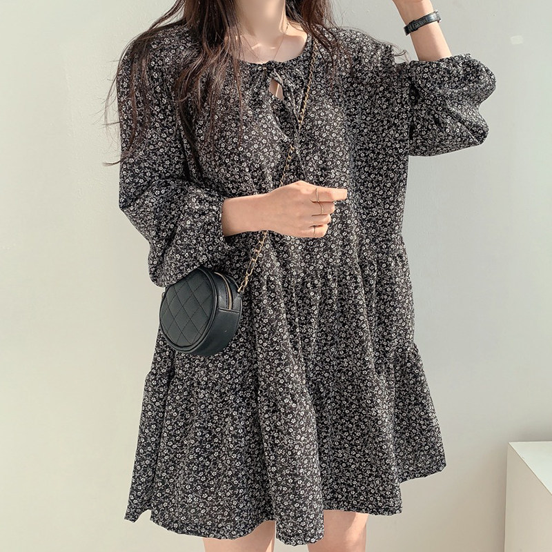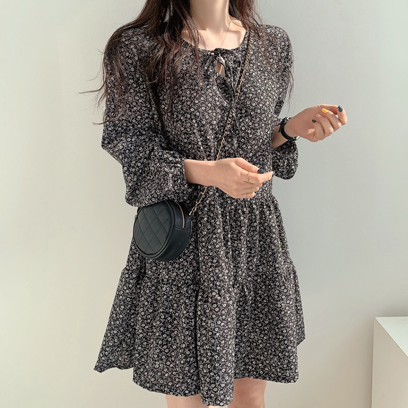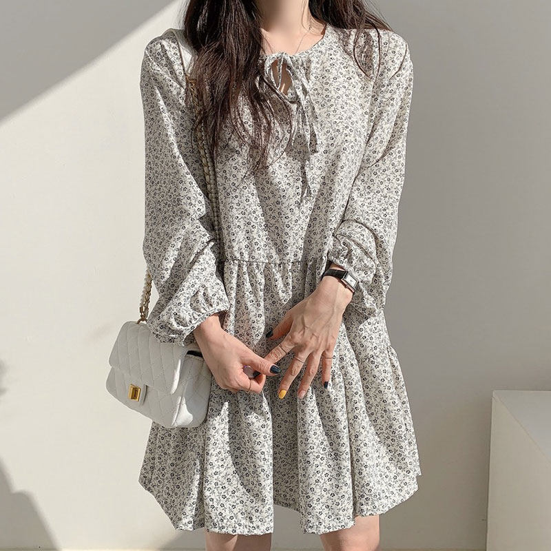 复古气质长袖碎花连衣裙女秋季2023新款系带蝴蝶结拼接荷叶边短裙