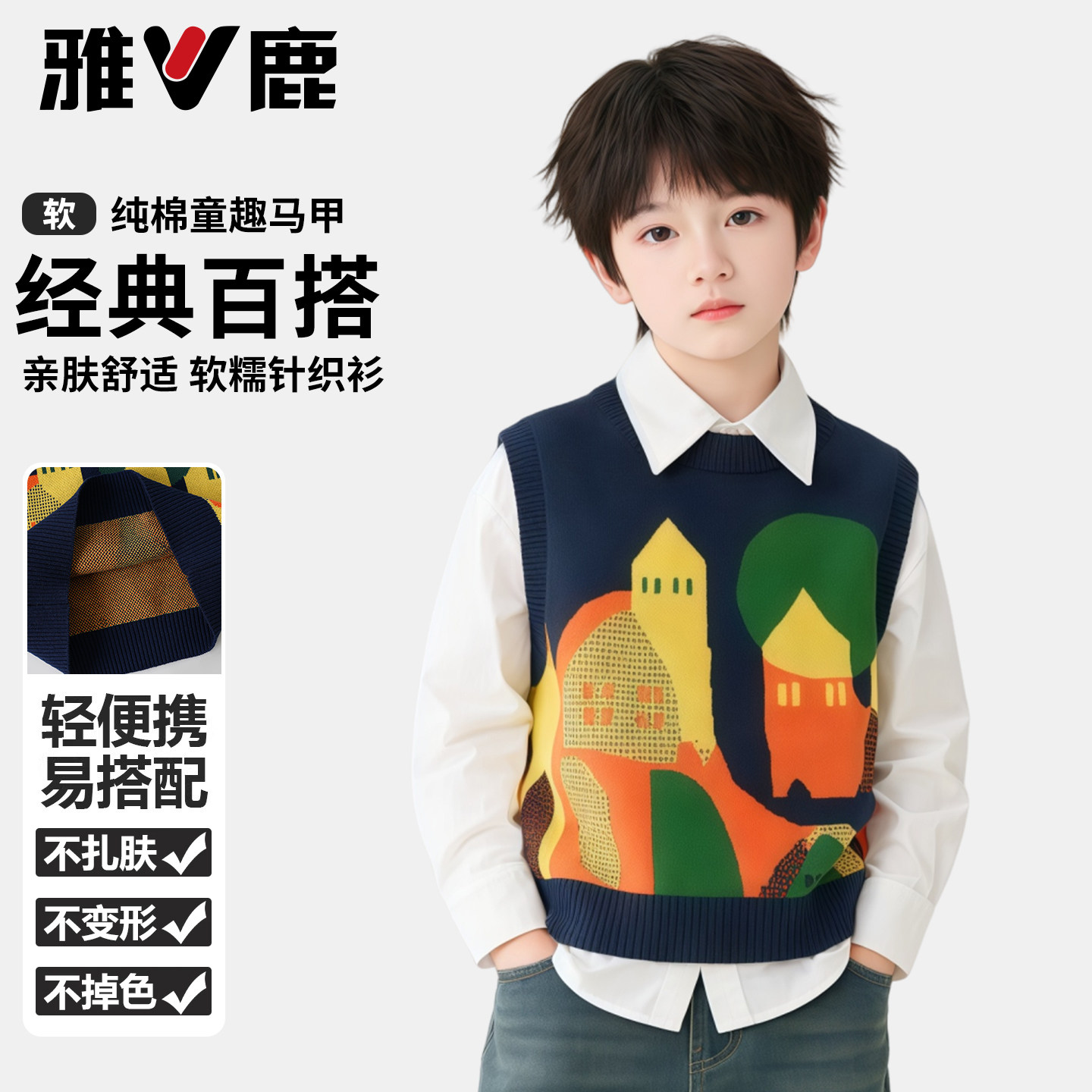 雅鹿男童针织马甲2026春季新款儿童学院风毛衣背心中大童宽松马夹
