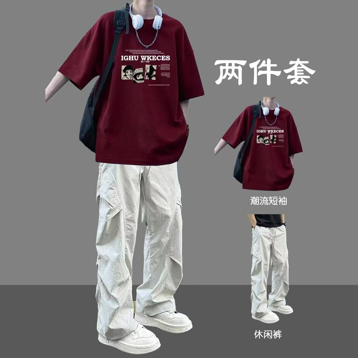 美式纯棉短袖t恤男生一整套穿搭套装夏季休闲潮流青少年帅气体恤